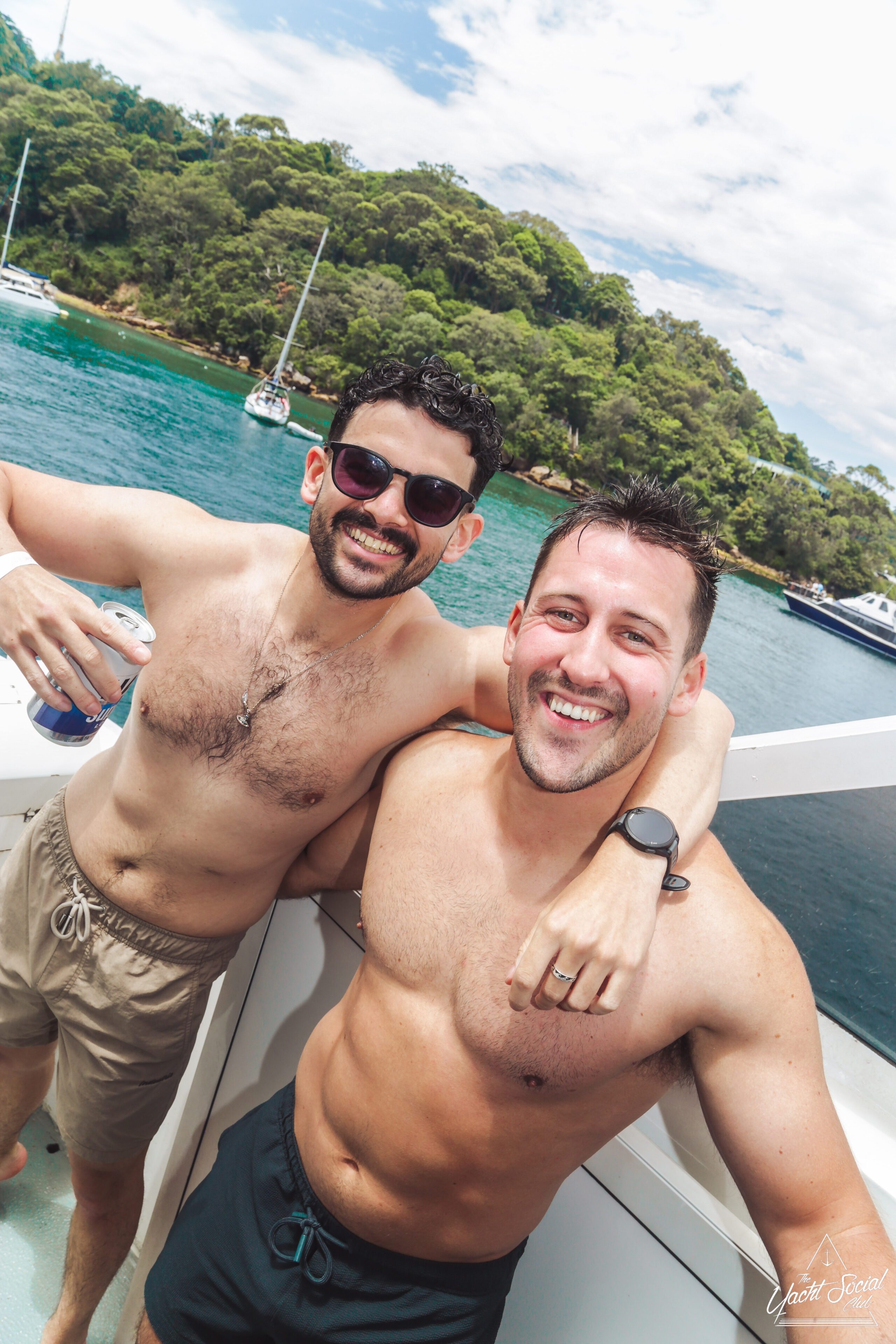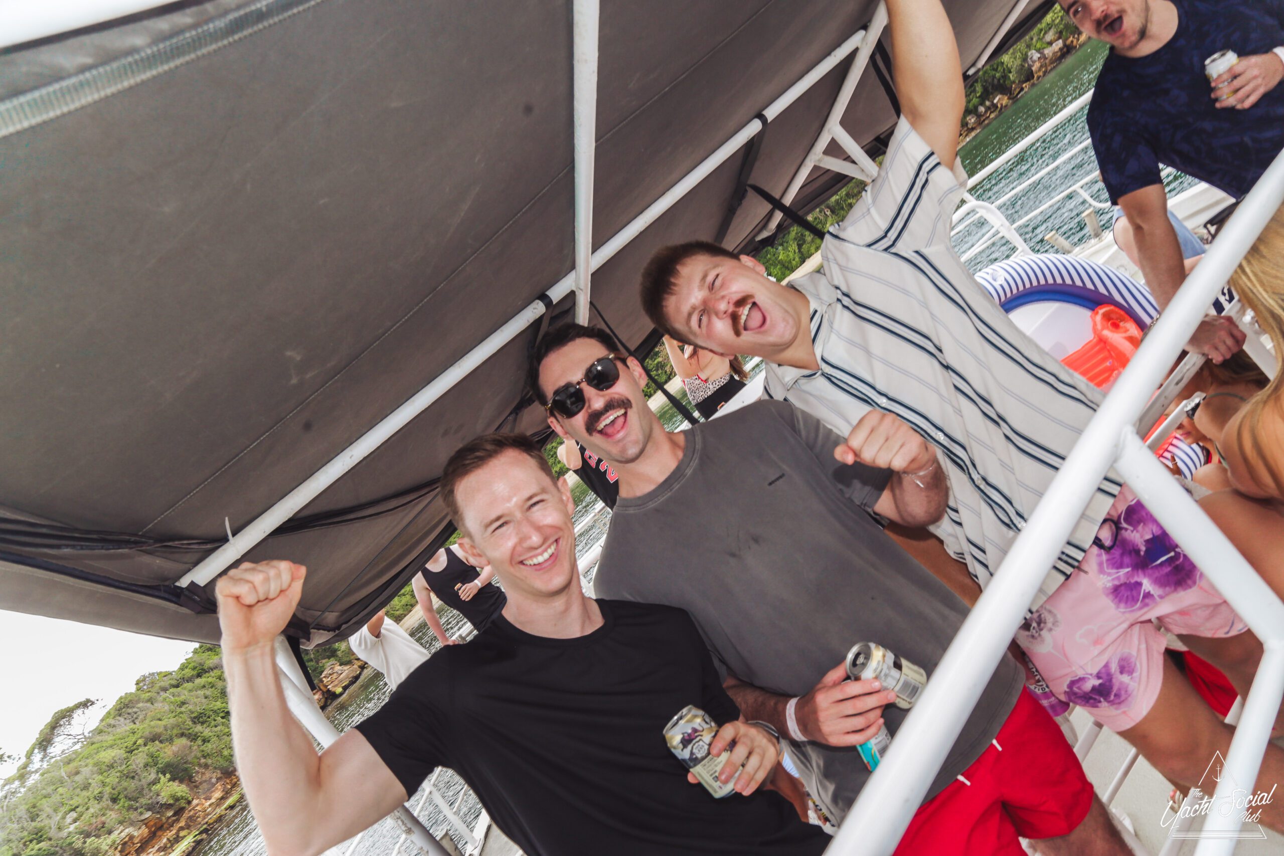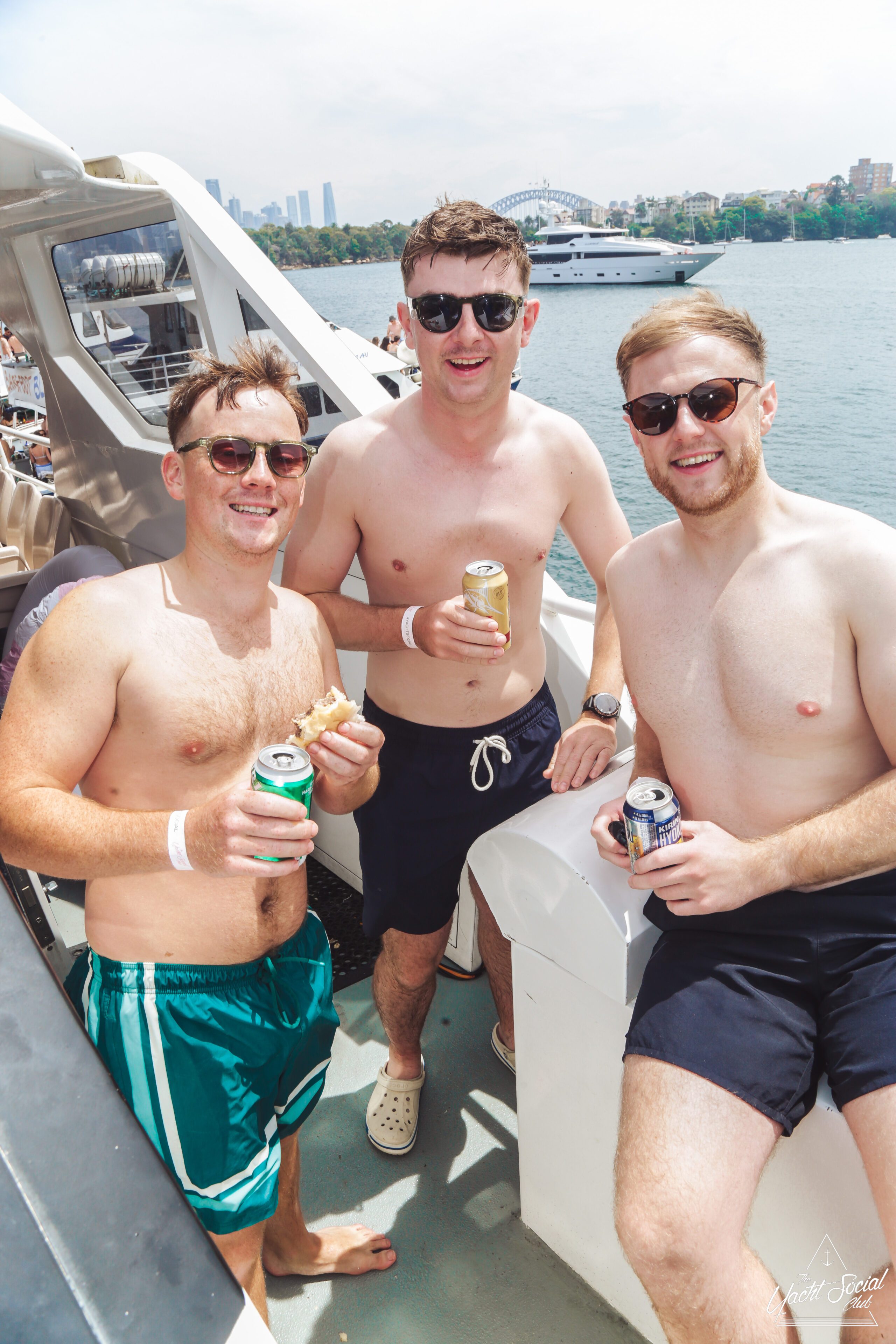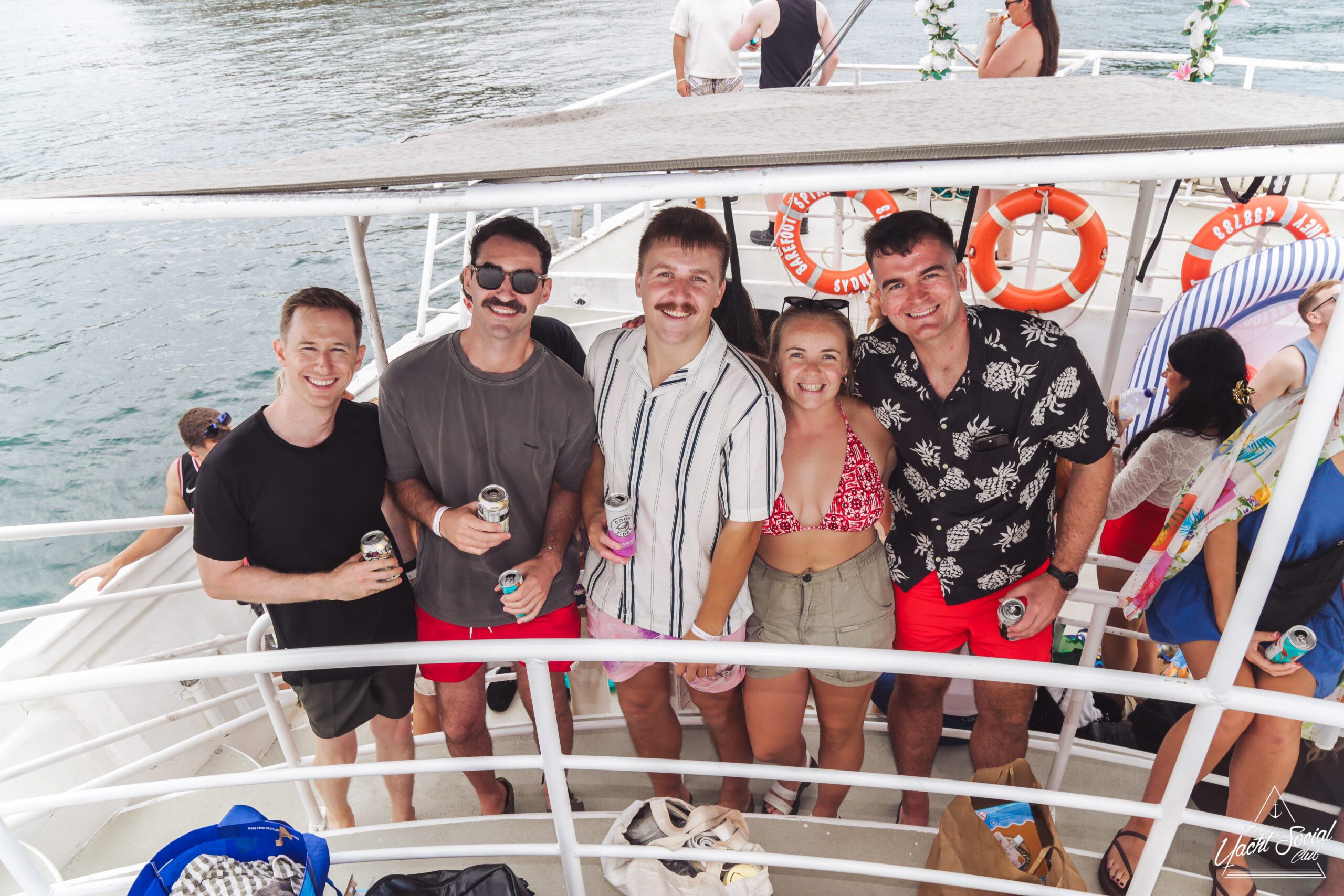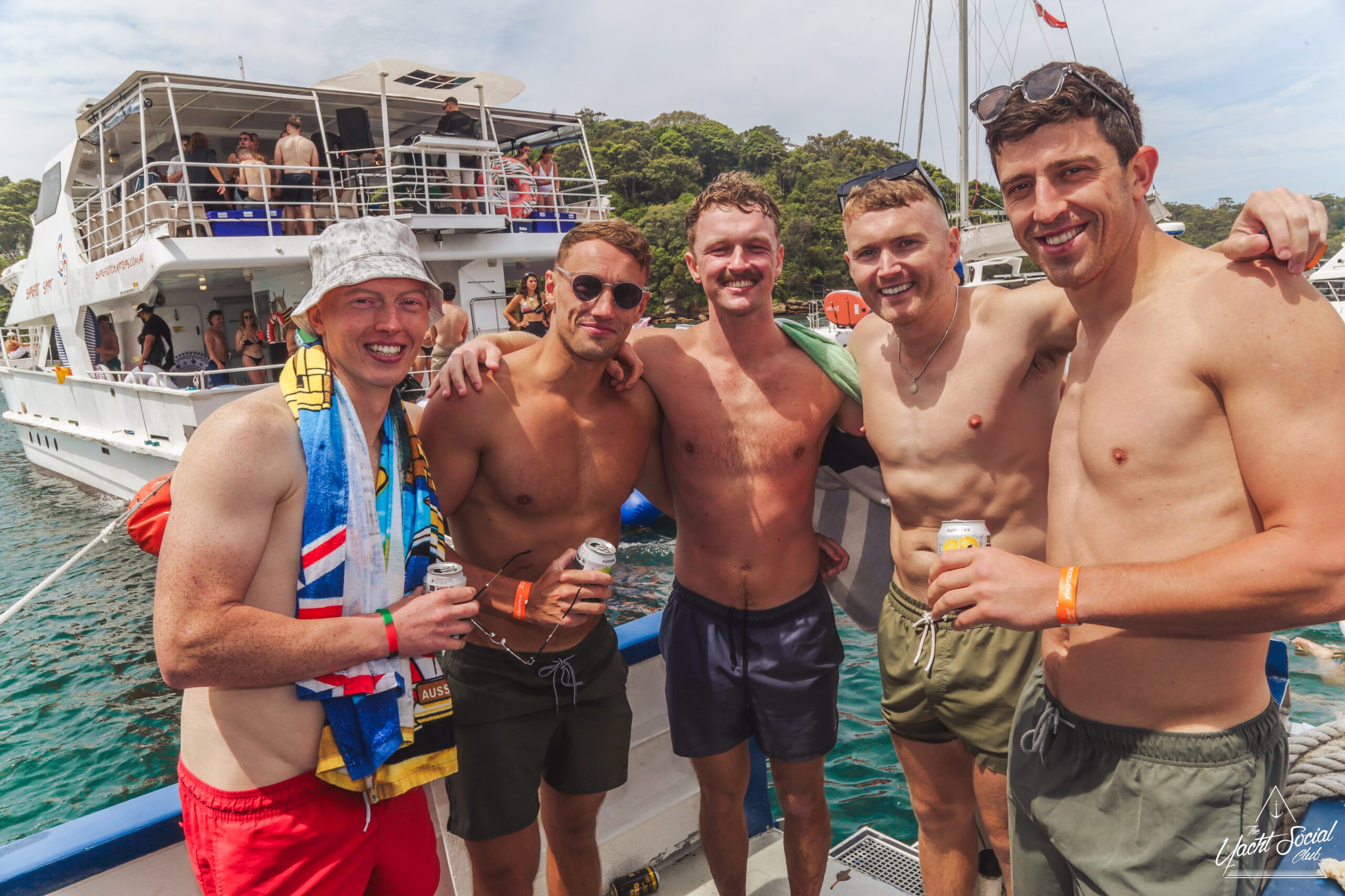 A group of smiling young men in swimwear stand together on a boat, posing for the camera. Other people are enjoying themselves in the background, with the sea and other boats visible under a cloudy sky.
