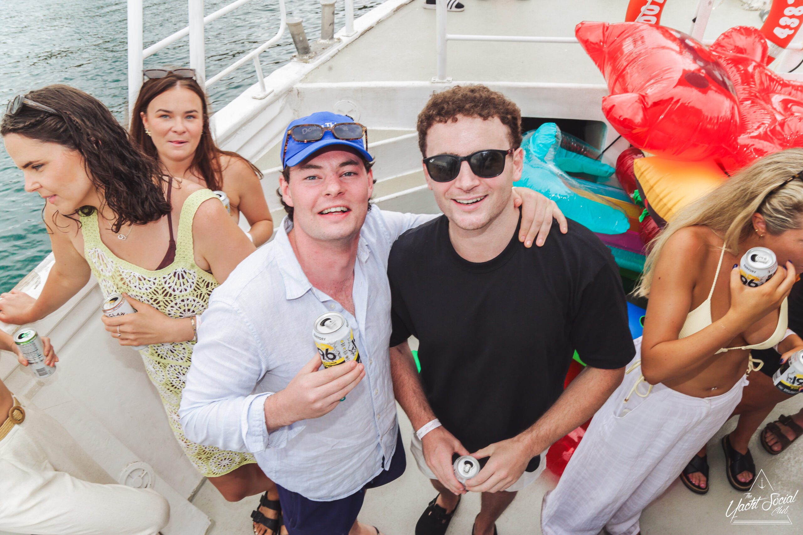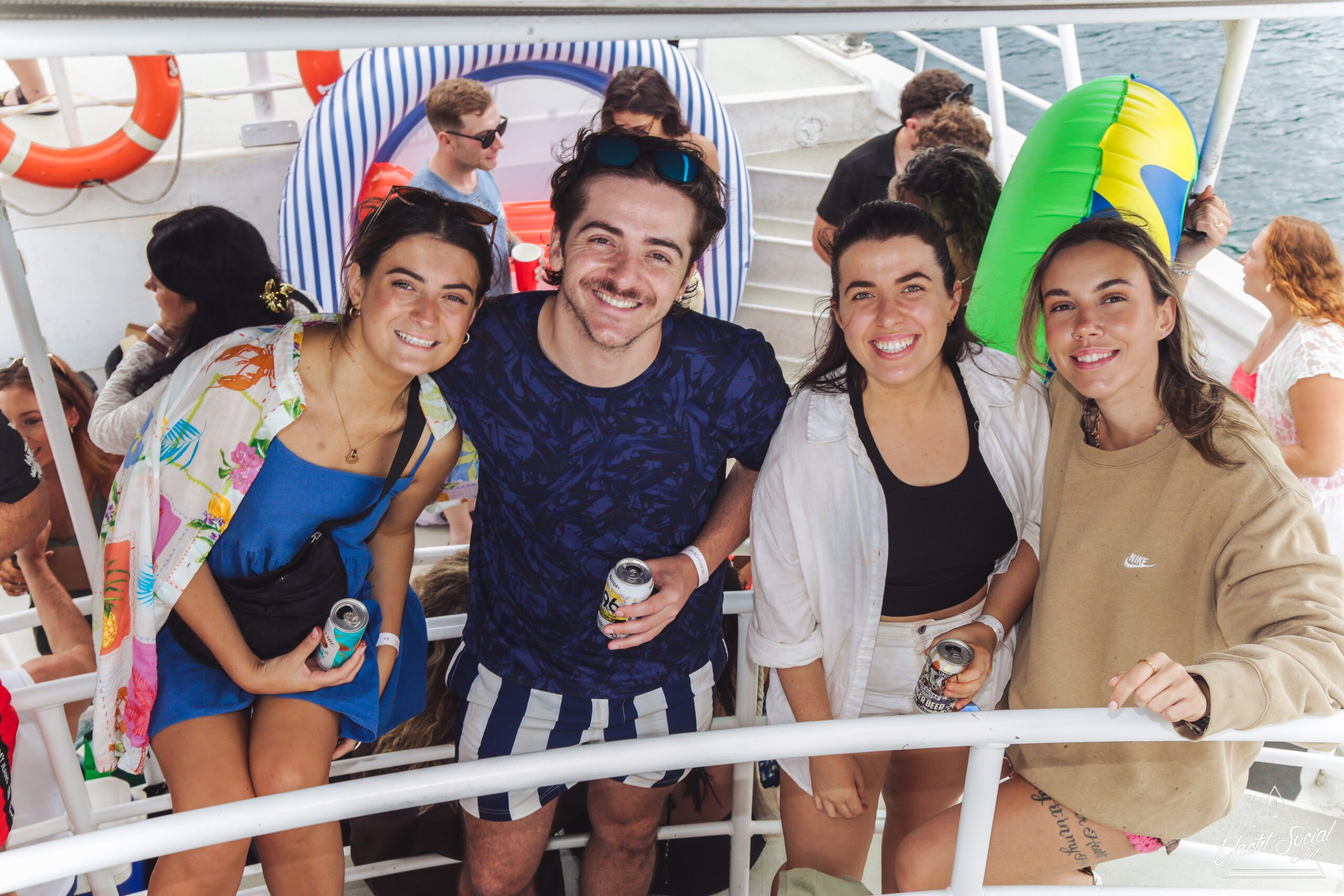 Four young adults smile at the camera while holding drinks on a crowded boat. Colorful pool floats and the ocean are visible in the background, suggesting a lively summer party atmosphere.