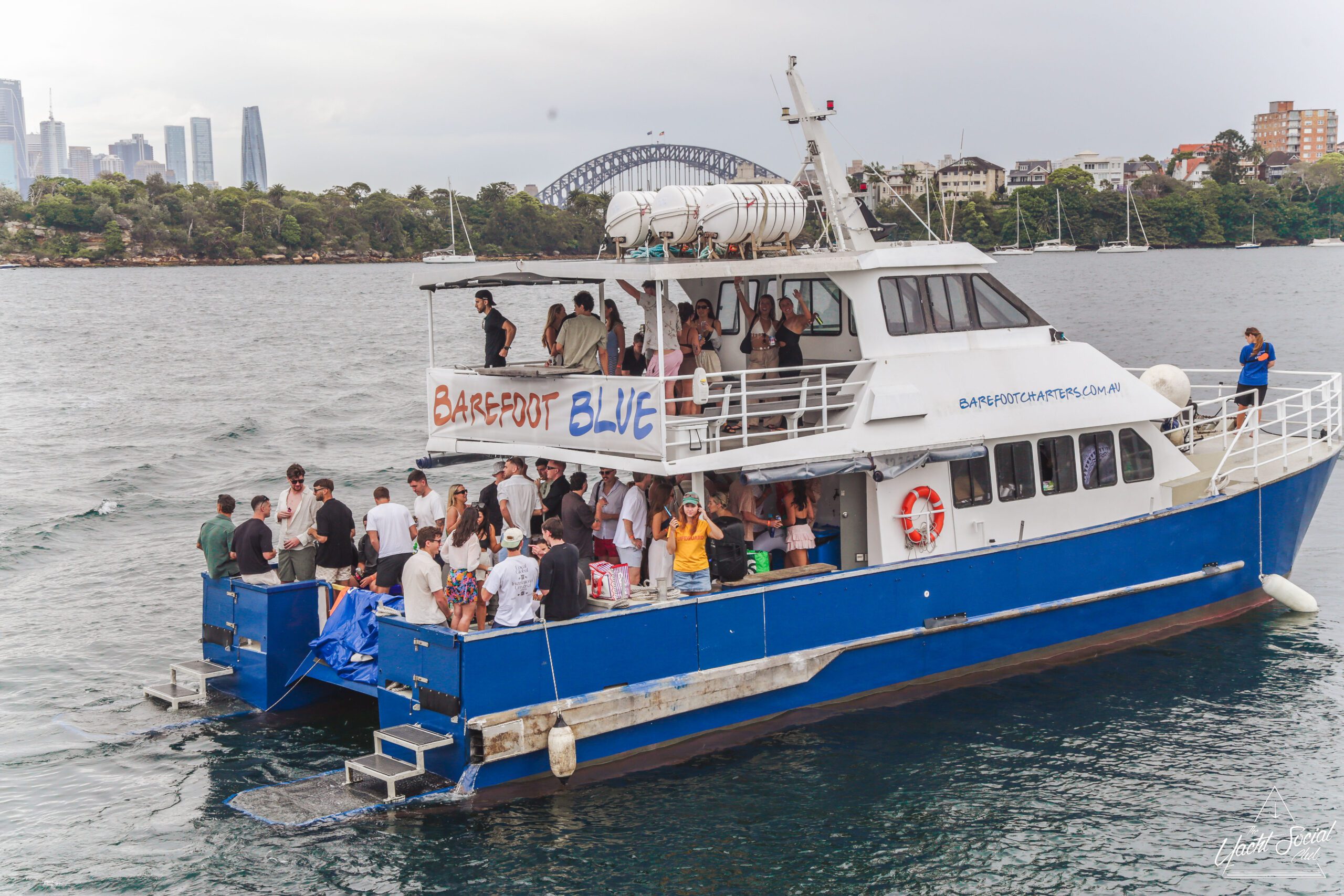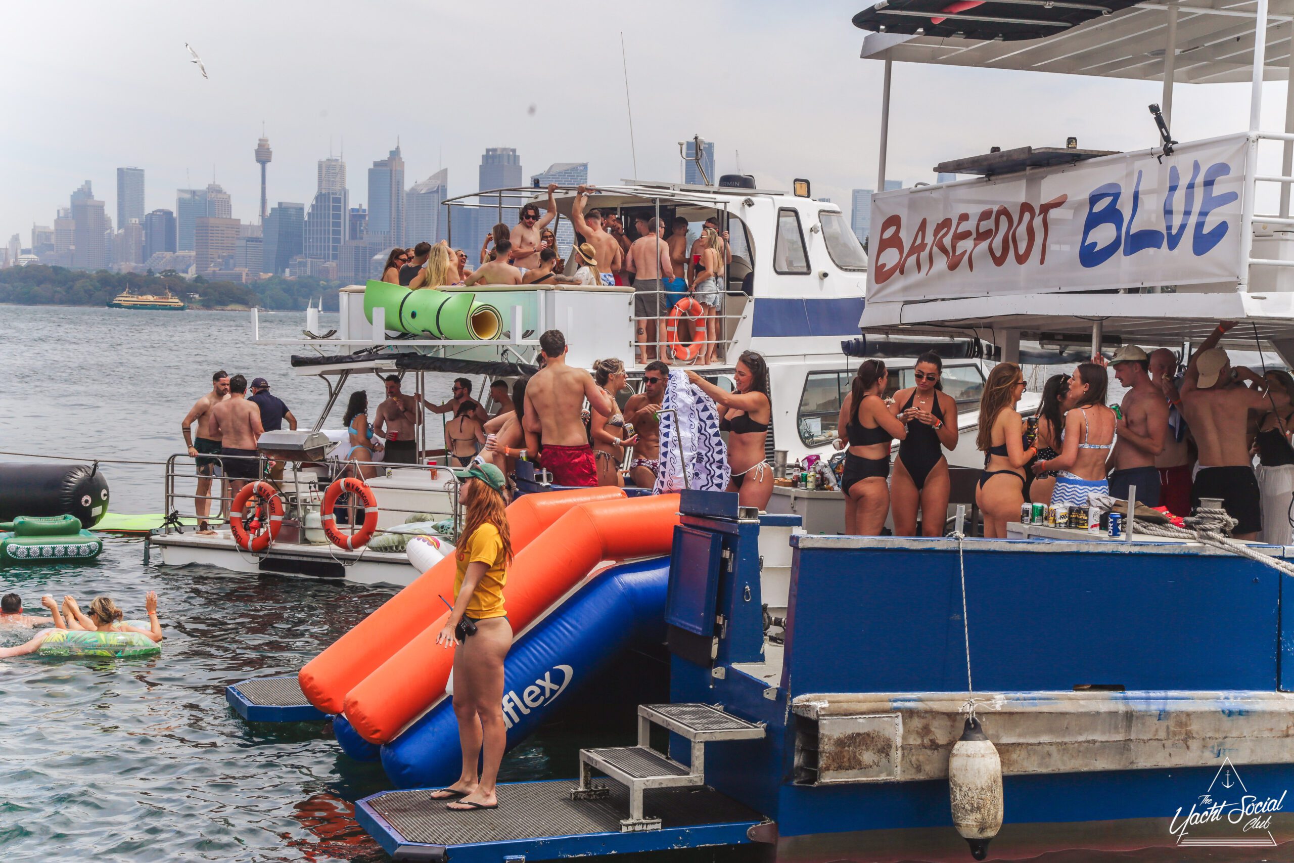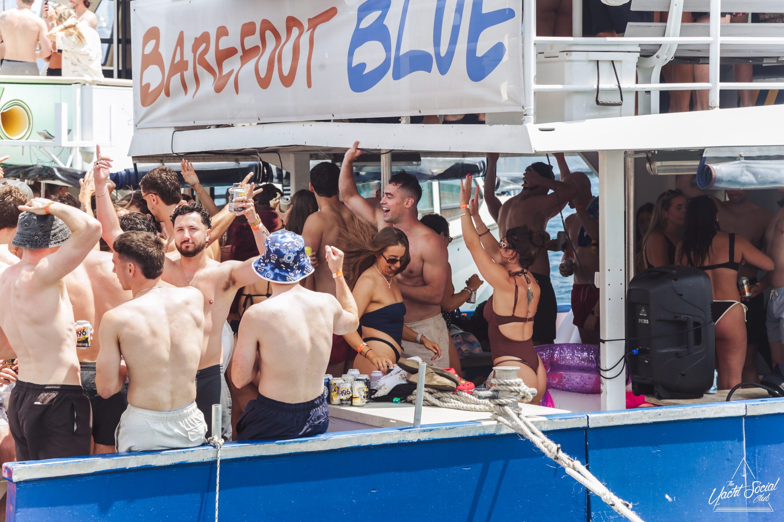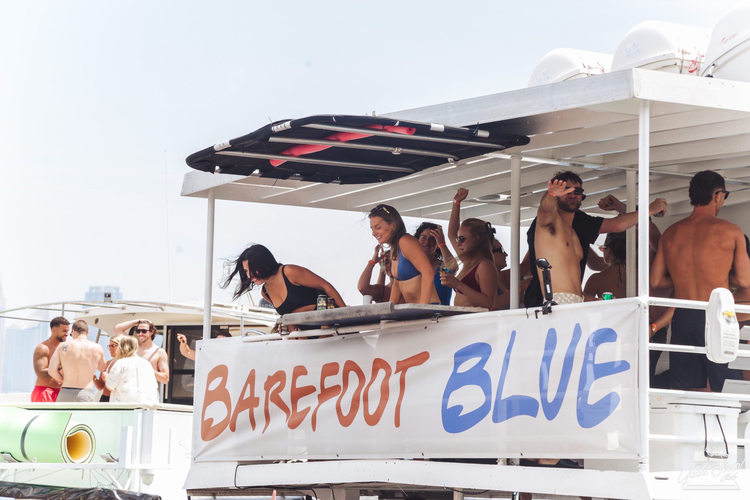 A blue and white double-decker boat called "Barefoot Blue" sails on the water with a large group of people socializing and enjoying a party; city buildings and greenery appear in the background.