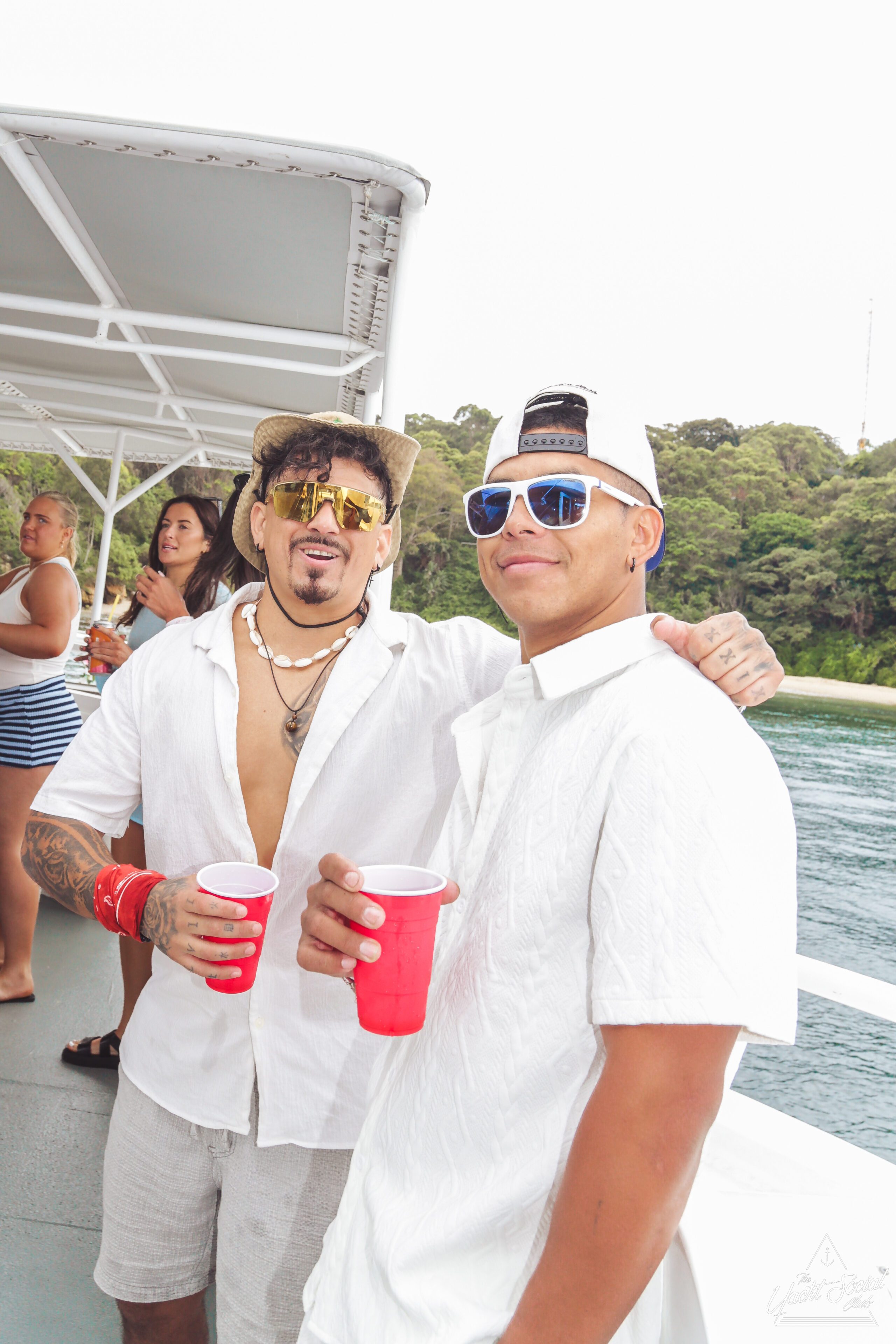 Two men in white shirts and sunglasses smile on a boat, each holding a red cup. Other people stand in the background, with water and greenery visible outside. The atmosphere appears relaxed and festive.