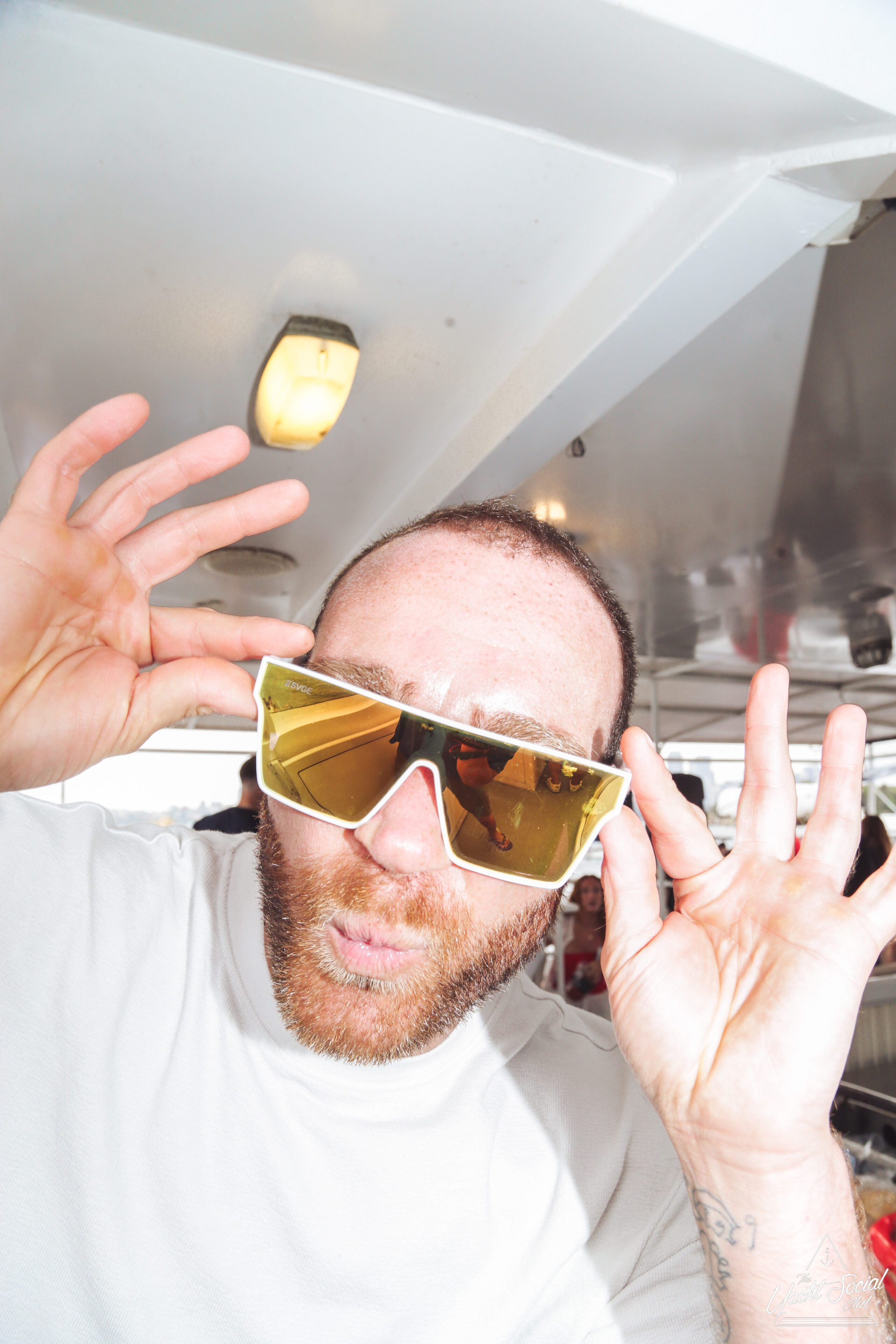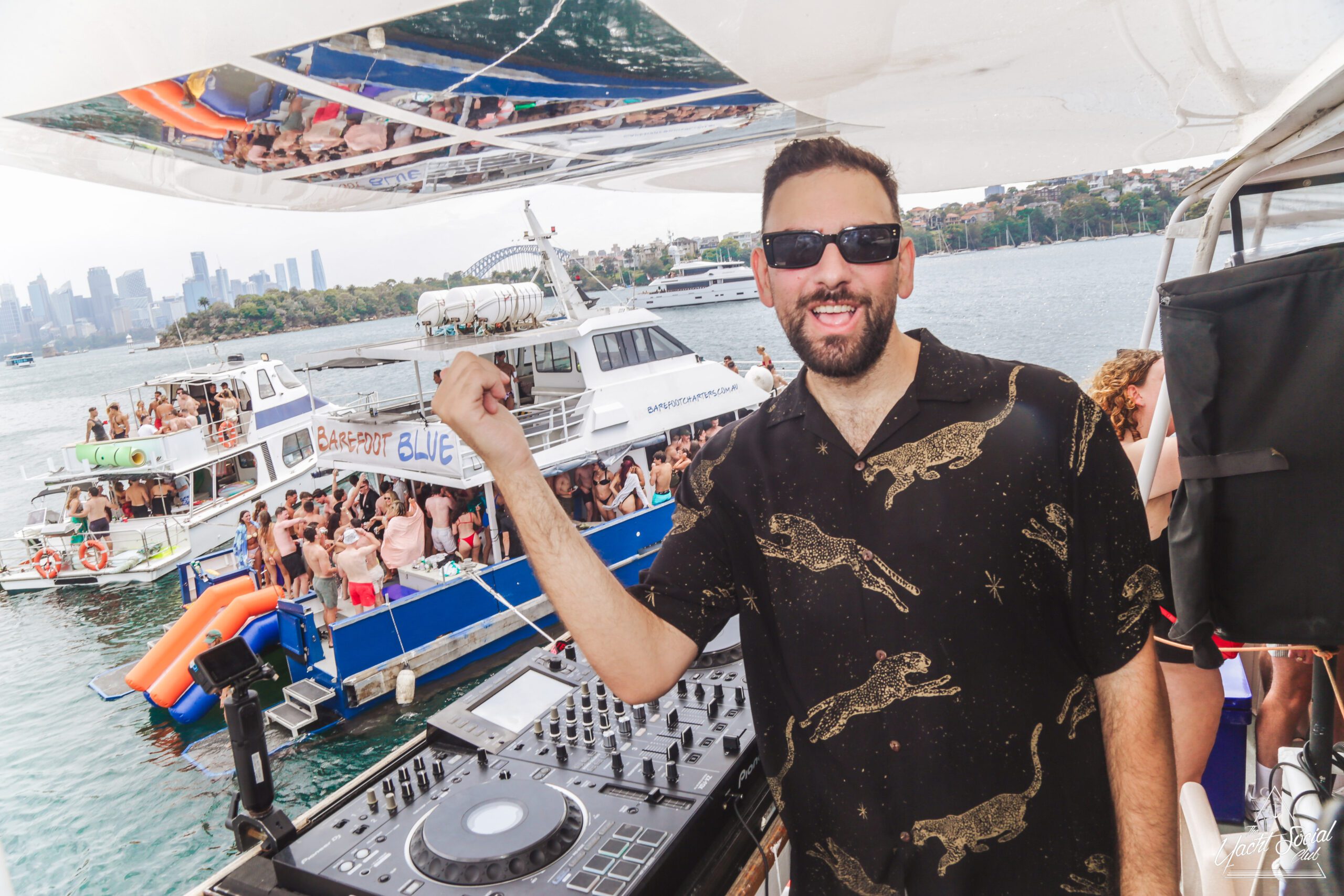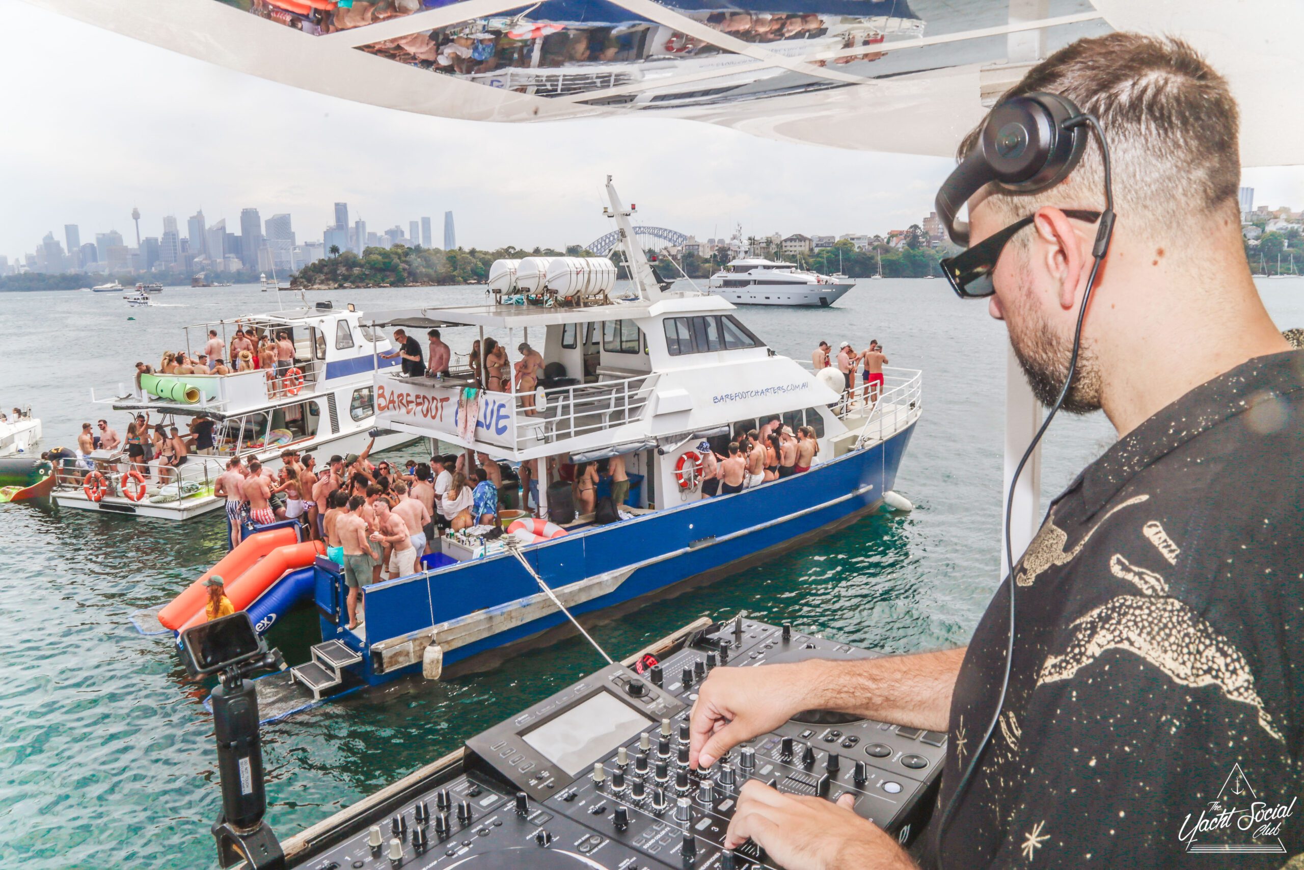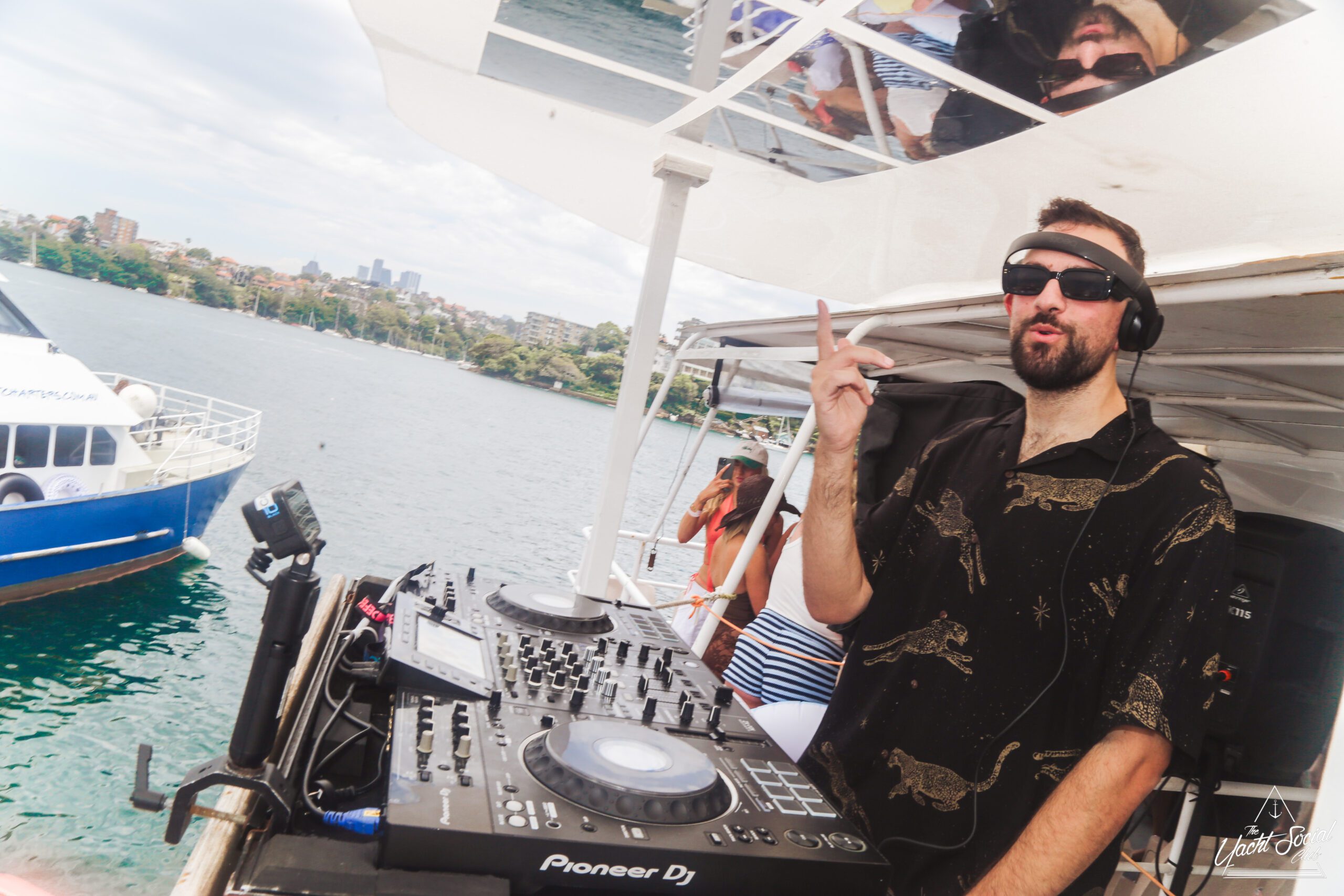 A DJ wearing sunglasses and headphones plays music on a boat deck with DJ equipment. The water and another boat are visible in the background, with city buildings and greenery in the distance.