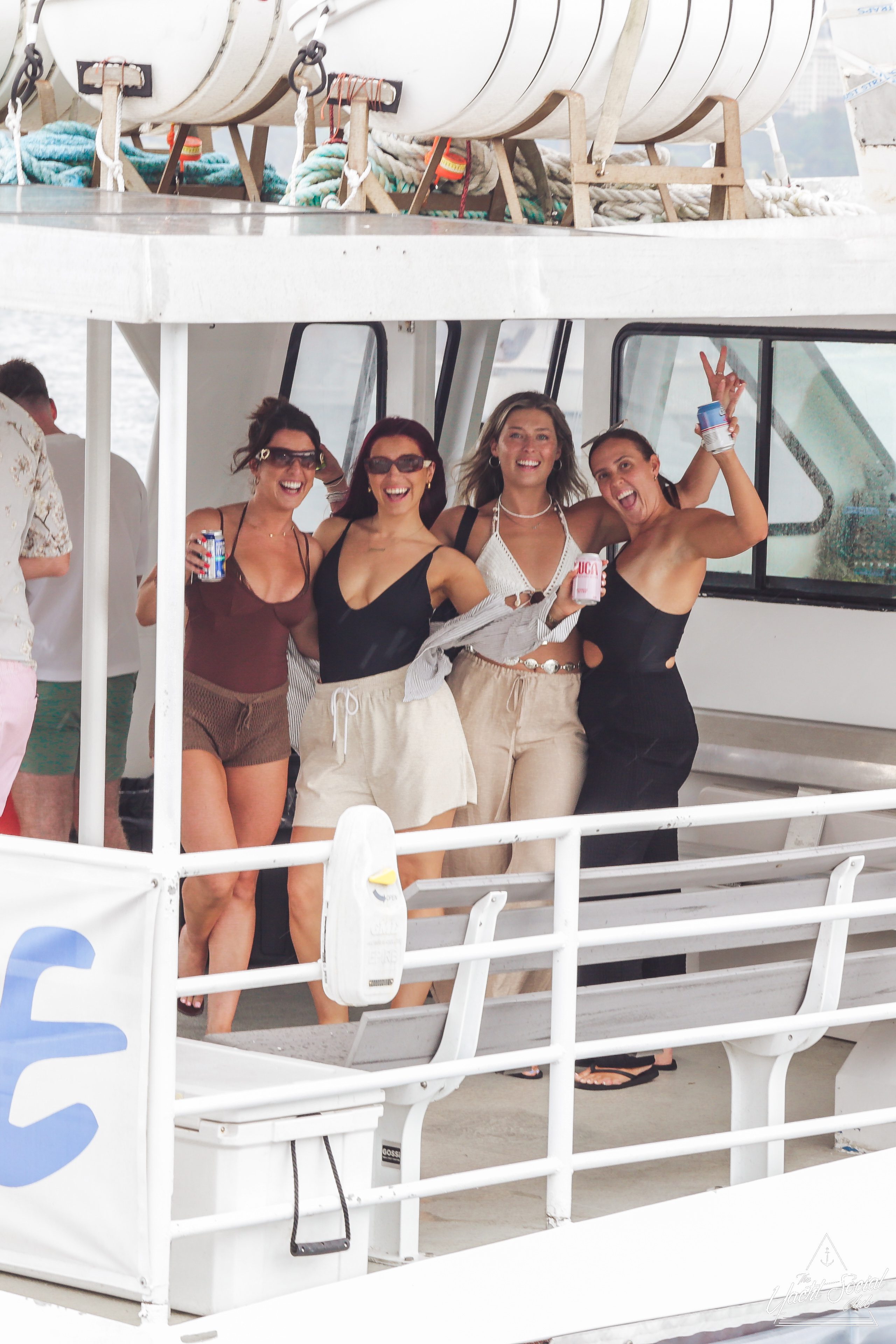 Four smiling women in swimsuits and casual cover-ups stand on a boat deck, holding drinks and posing for the camera; one woman flashes a peace sign. The scene appears cheerful and relaxed.