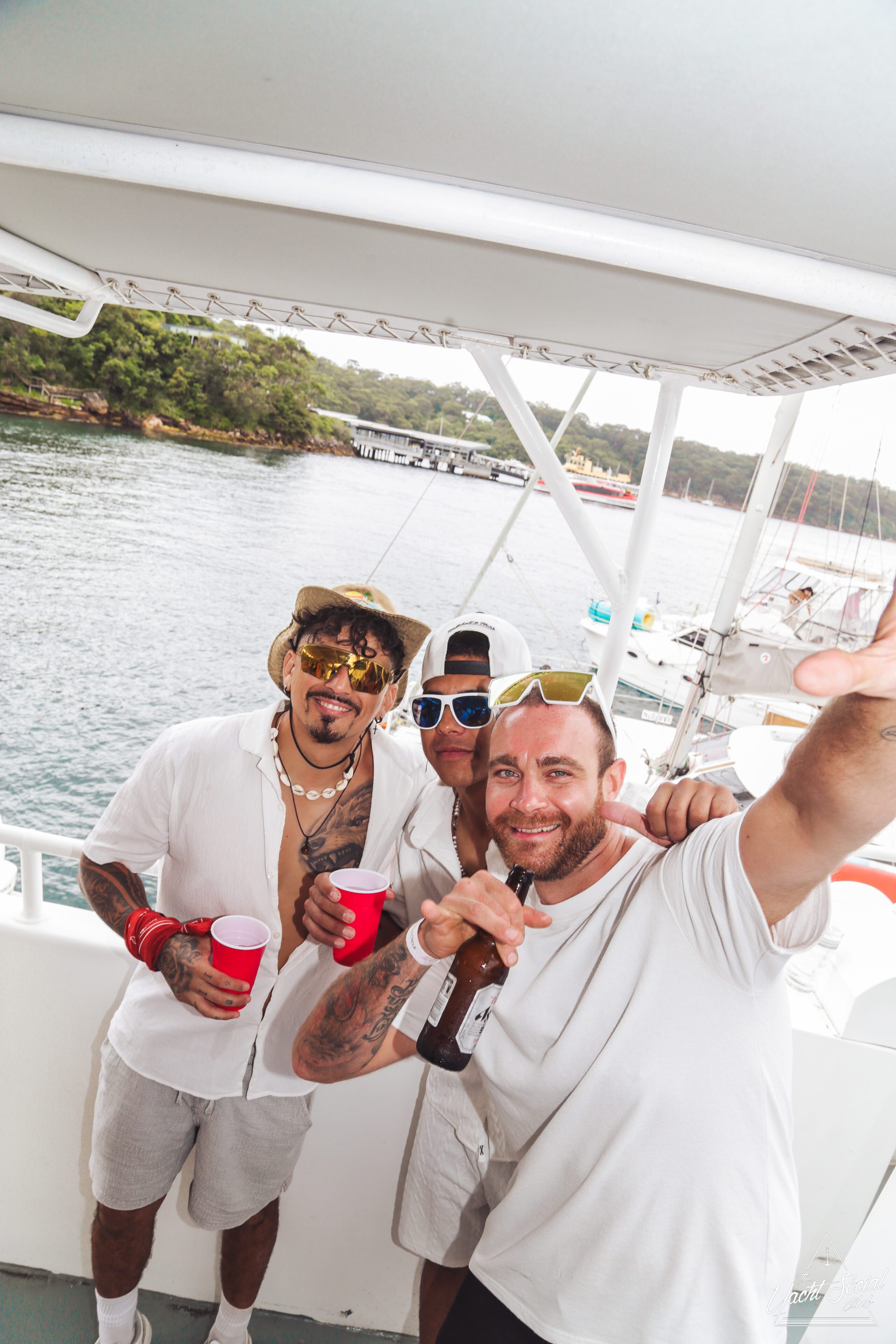 Three men wearing white outfits and sunglasses smile and pose with drinks on a boat. The background shows water, trees, and a dock under a cloudy sky.