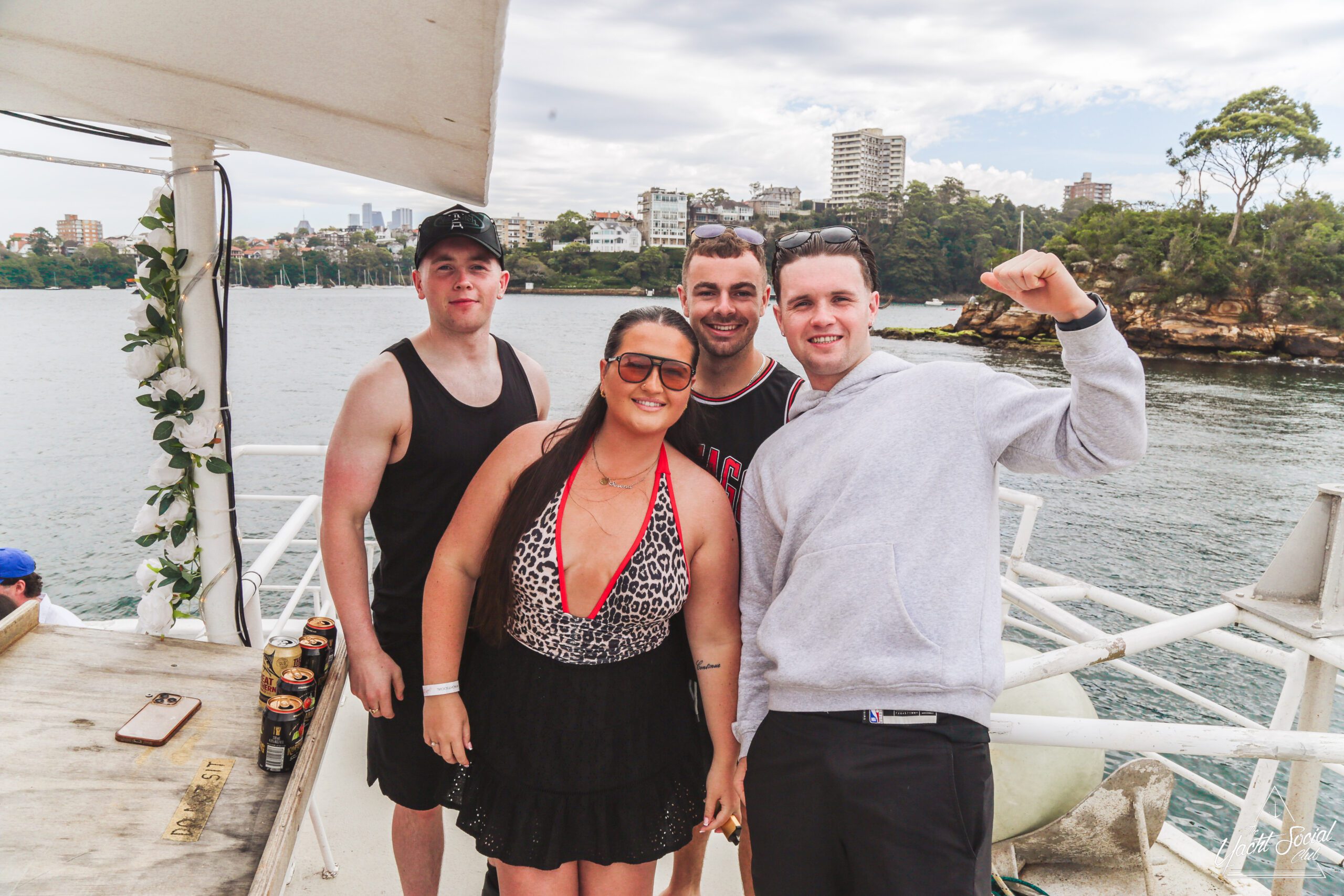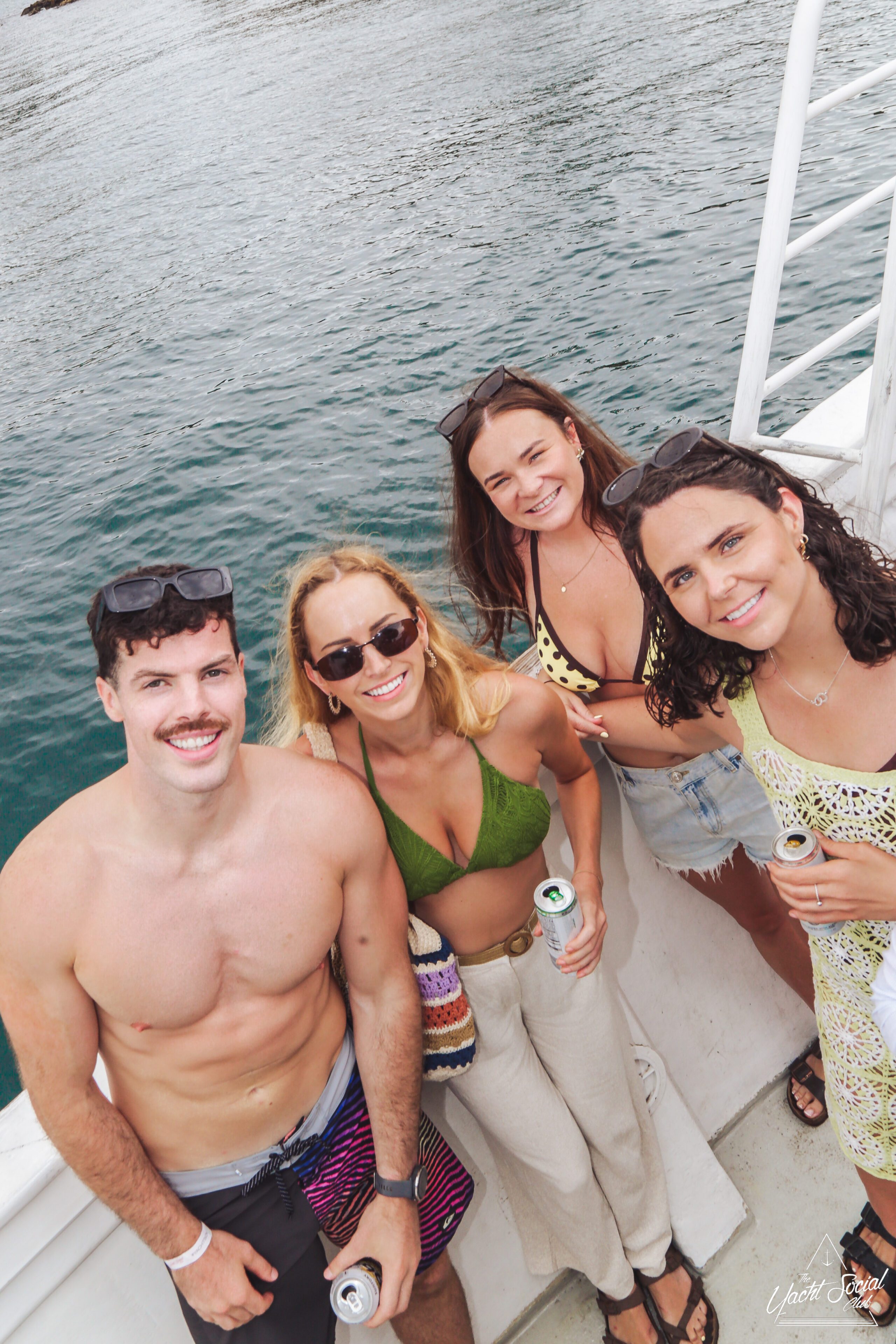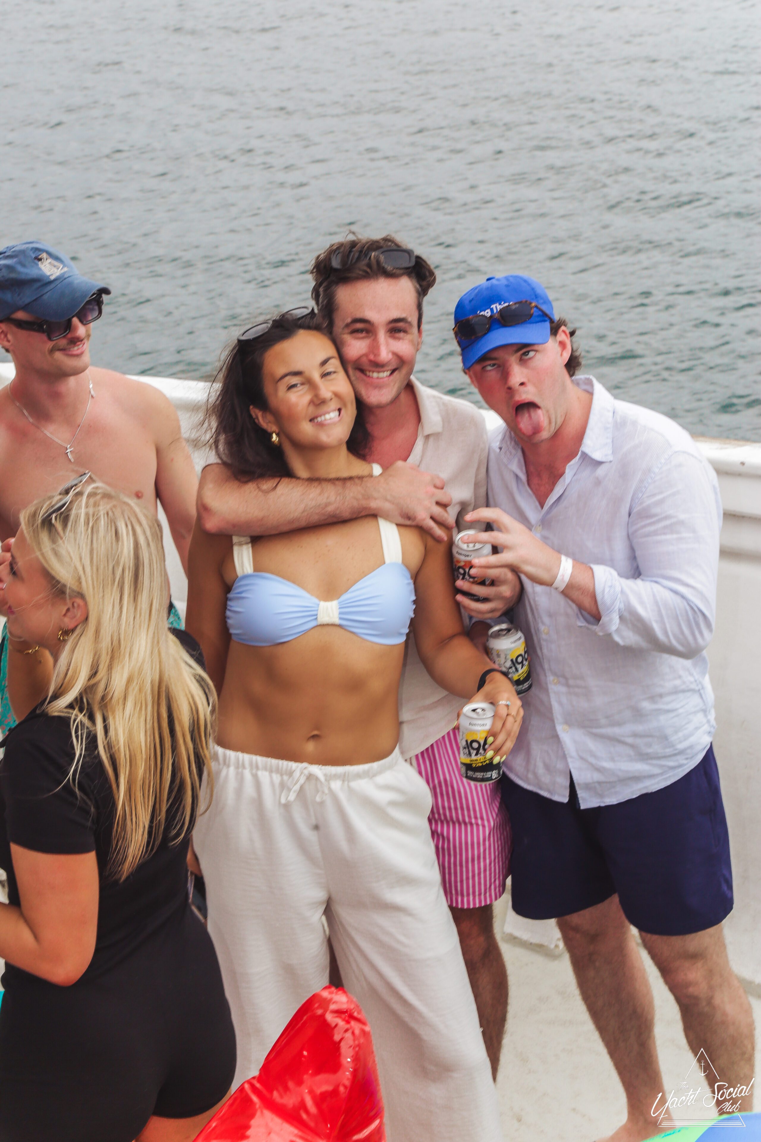 Four young adults on a boat, smiling and posing for a photo. The woman in front wears a light blue bikini top and white pants. The man behind her hugs her, while another man in a blue cap makes a funny face holding a drink.