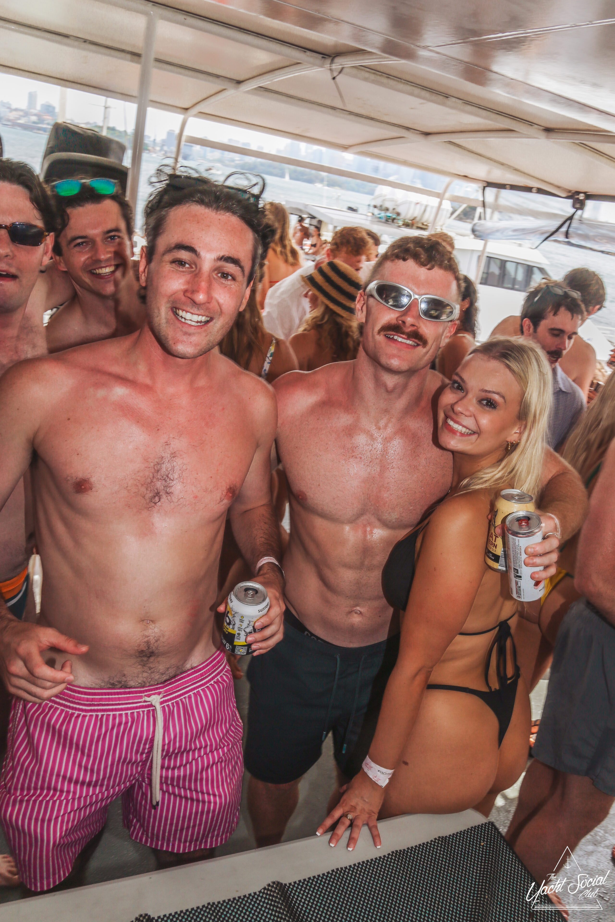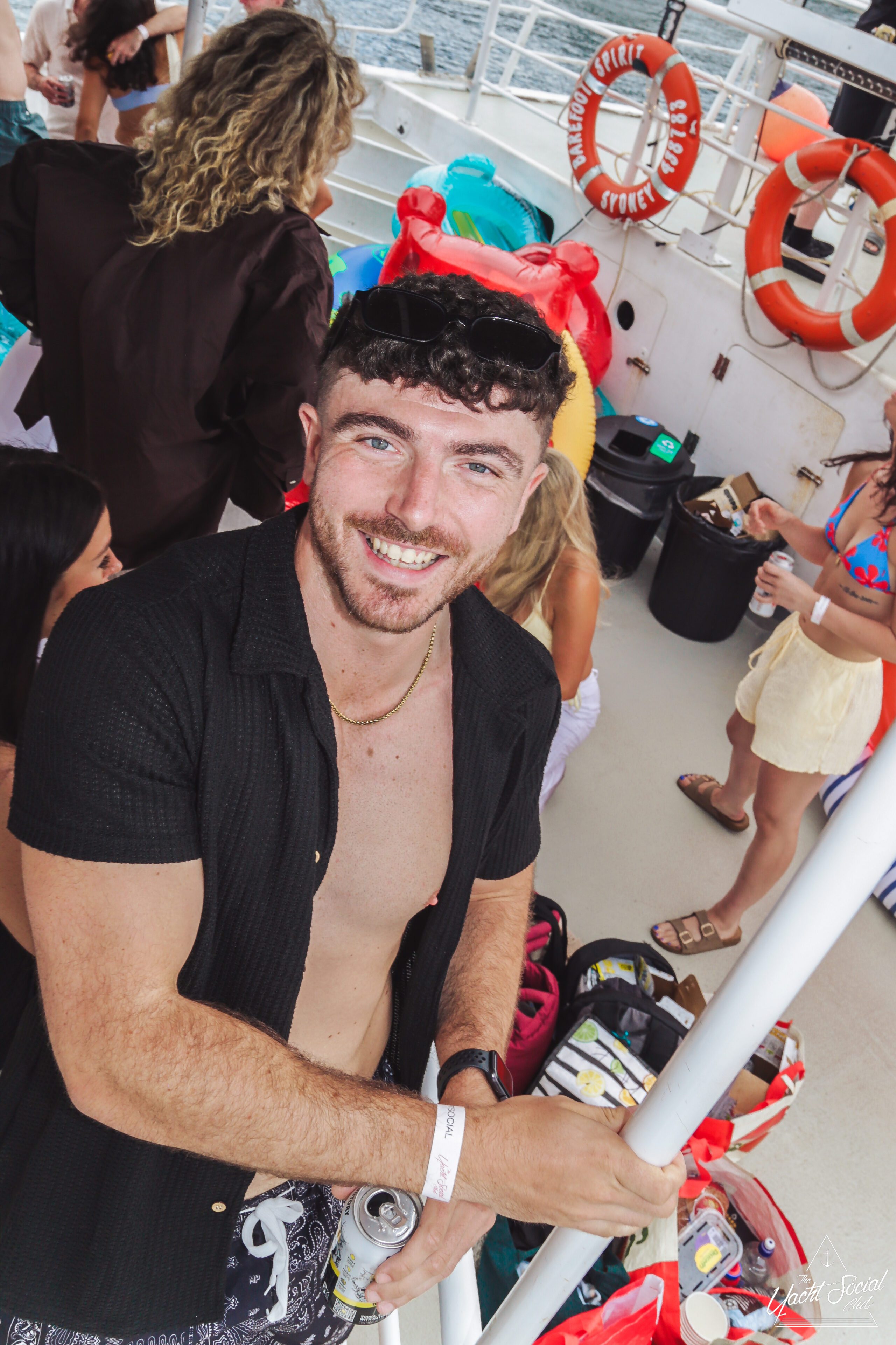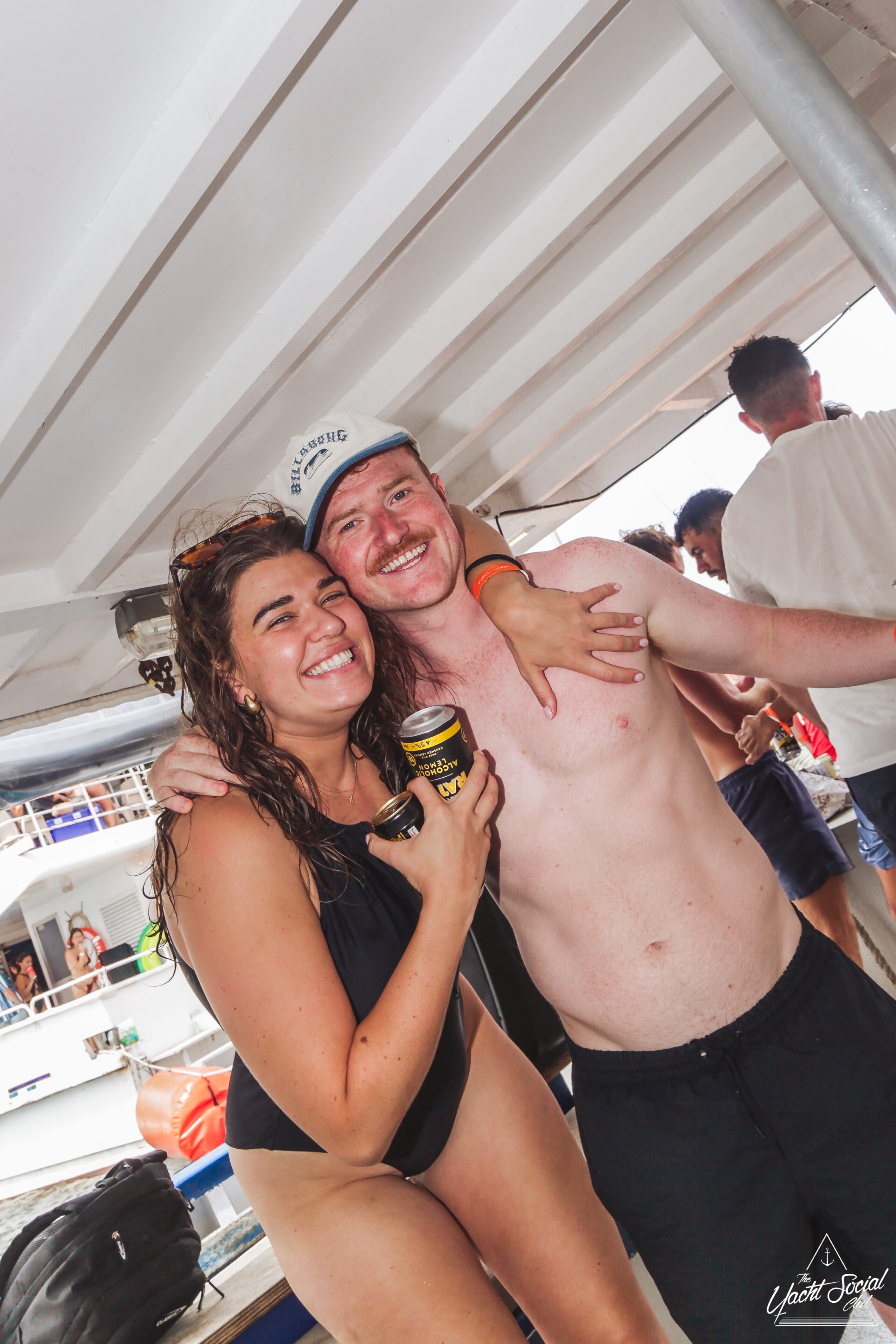 Three young adults in swimwear smile on a boat; two men hold inflatable tubes and drinks, while a woman in a green bikini top and white pants stands between them. Several people are in the background, enjoying the gathering.