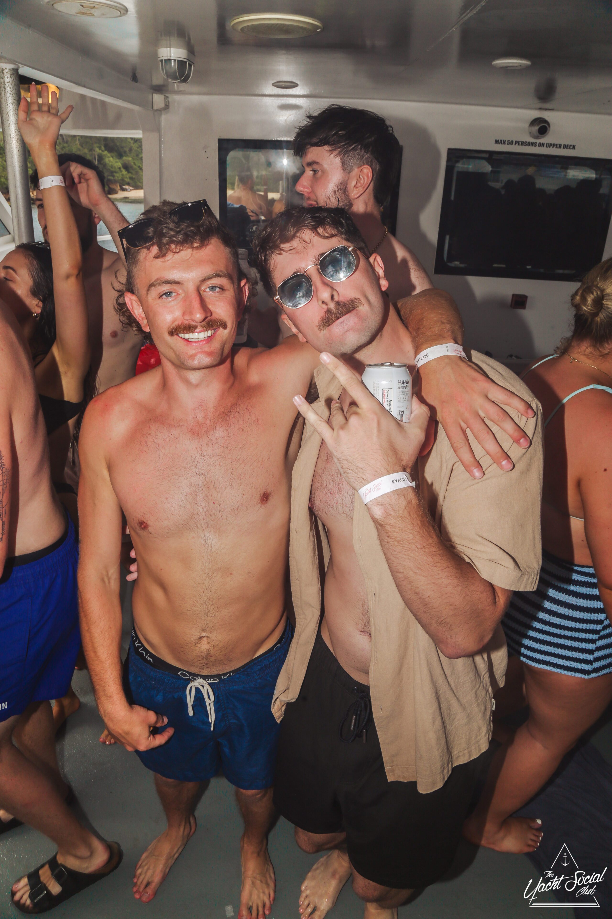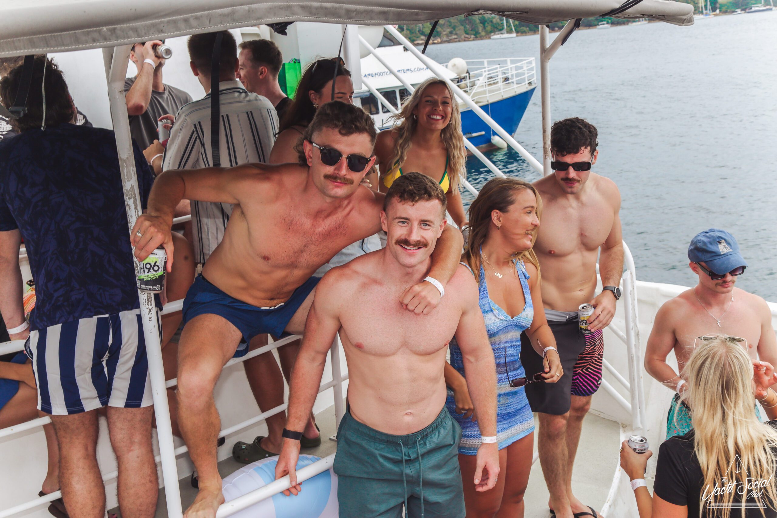 A group of young adults in swimwear, some with mustaches, smiling and posing on a boat. The scene appears festive, with people enjoying themselves by the water on a cloudy day.