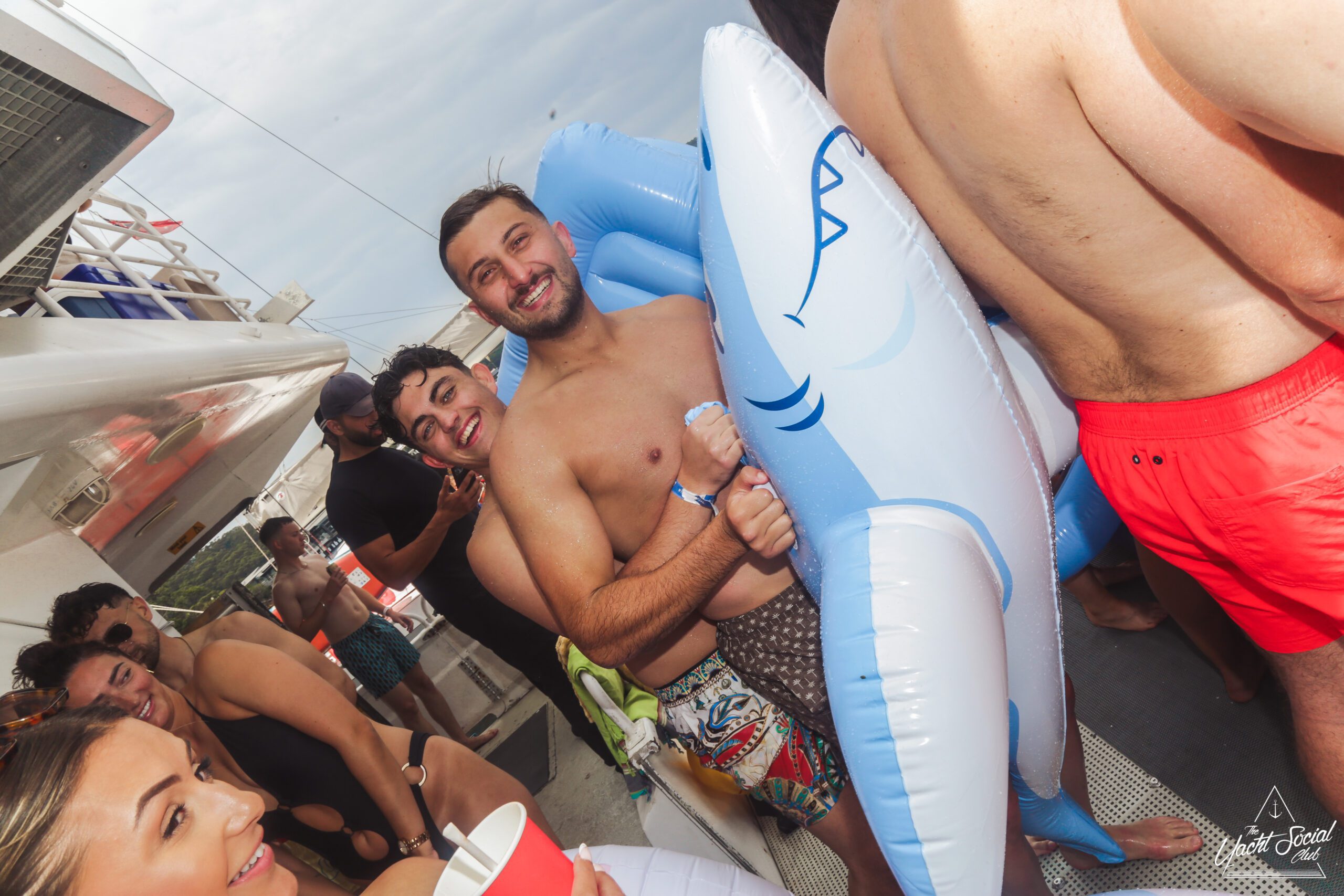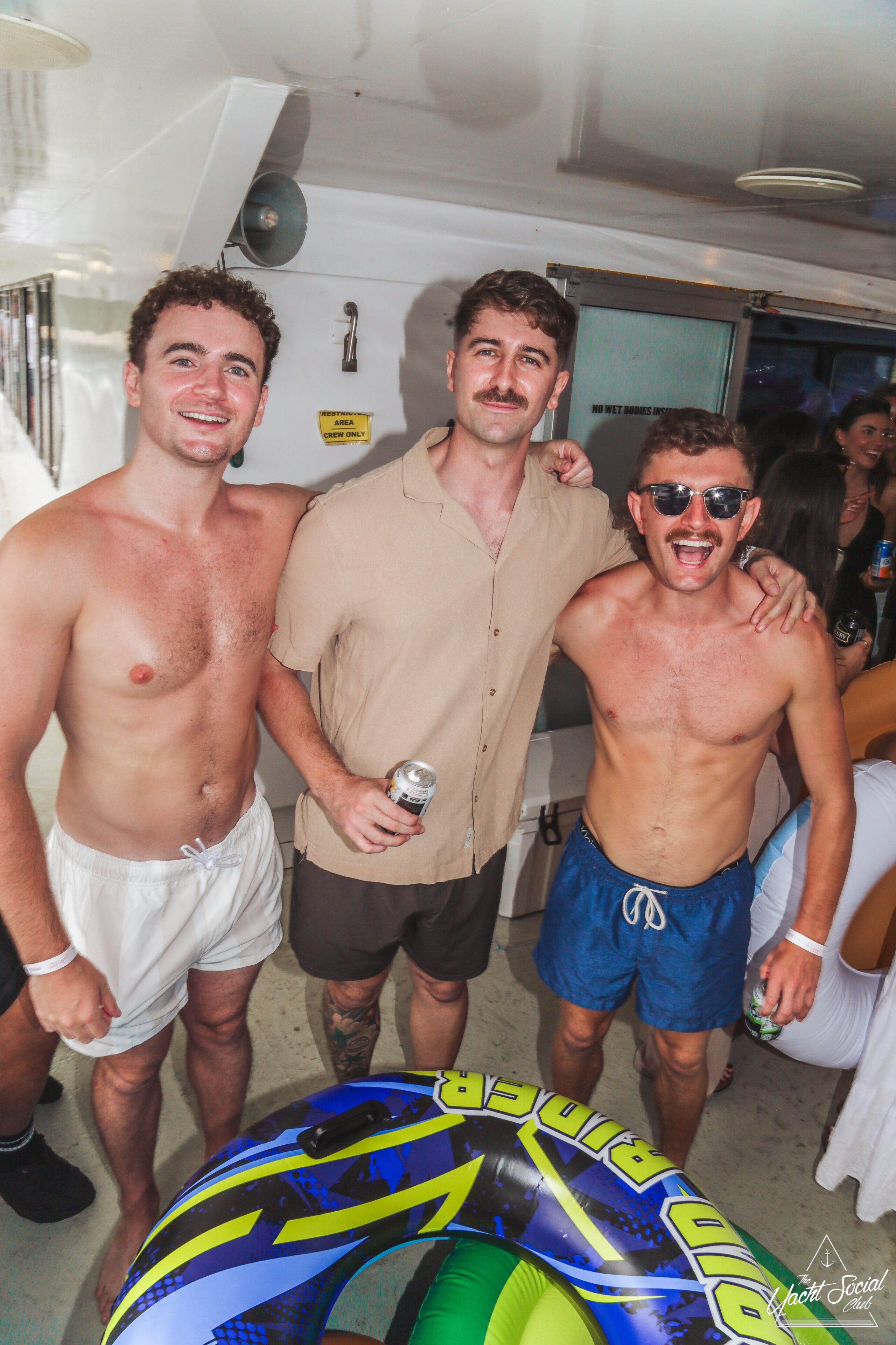 Three young men smile and pose together at a party on a boat. Two are shirtless in swim trunks, and one is wearing a beige shirt. People and colorful pool inflatables are in the background.