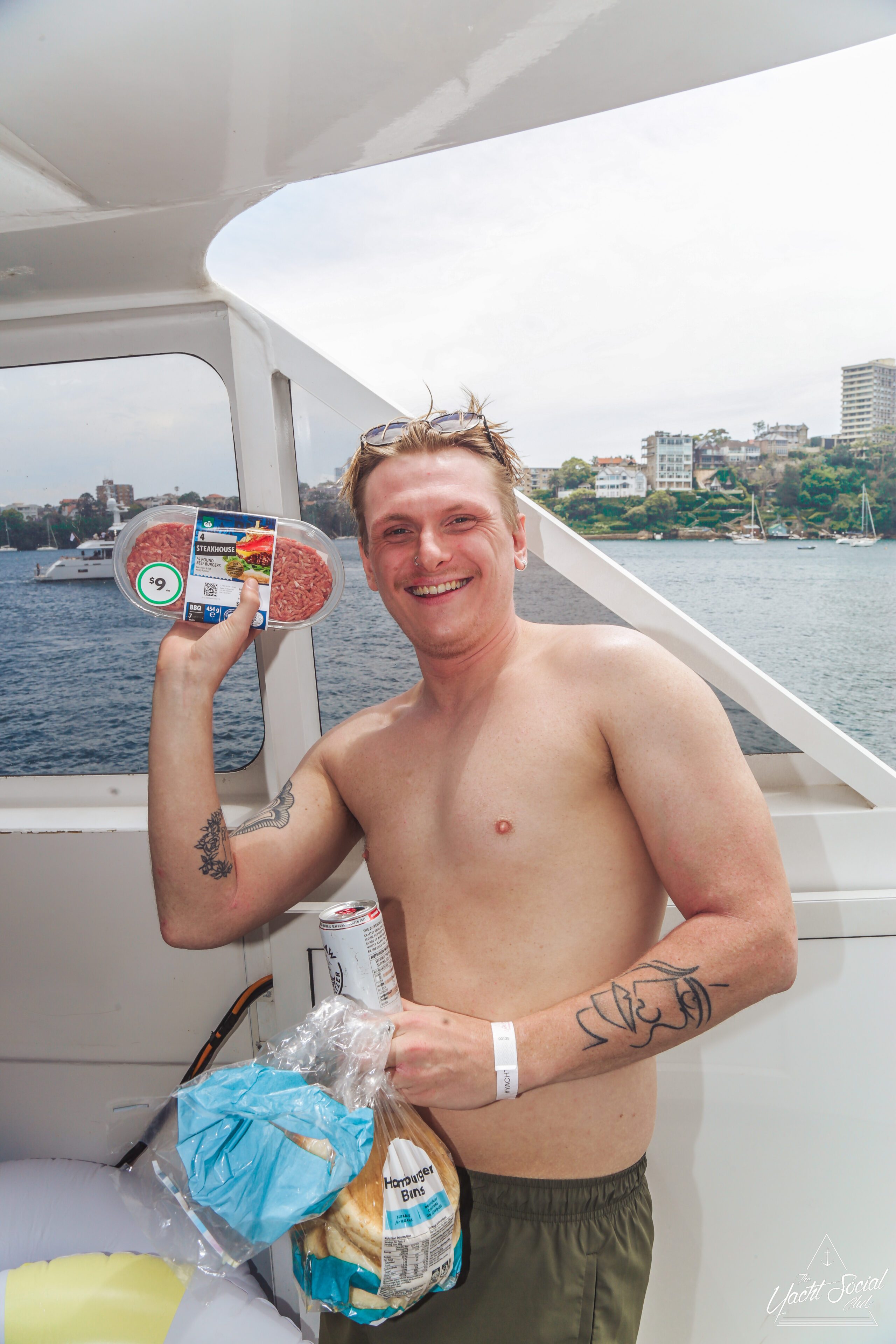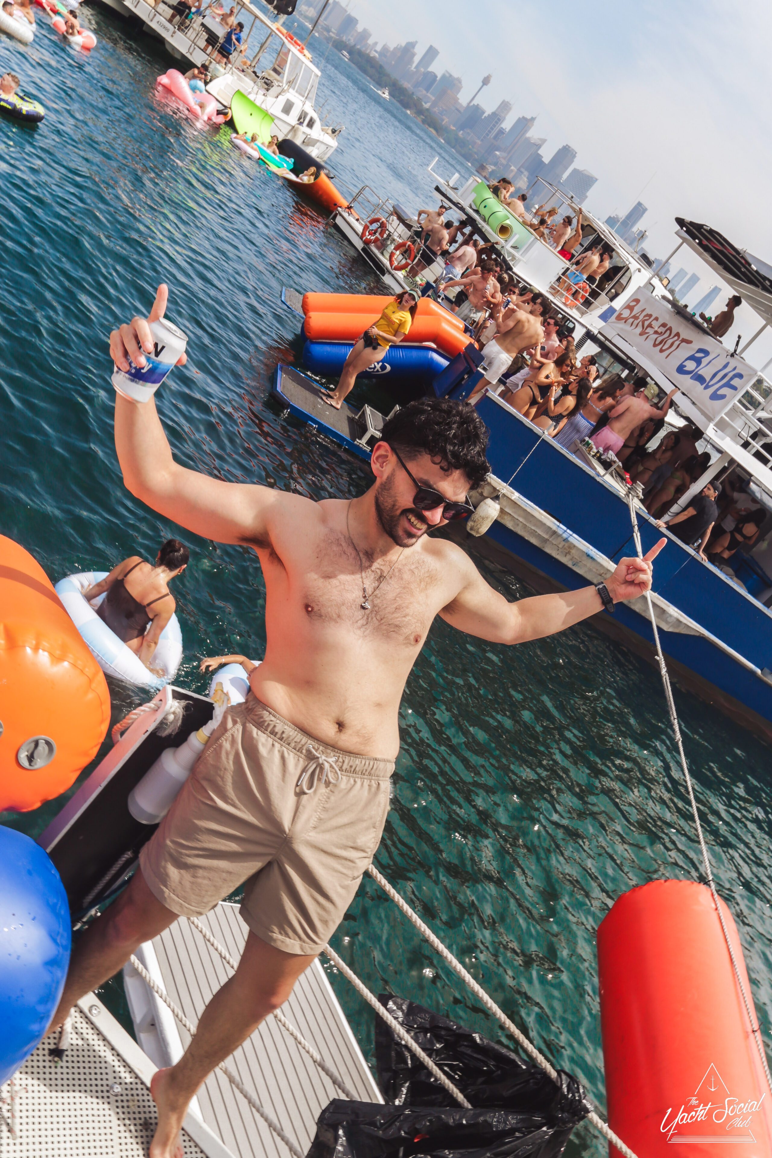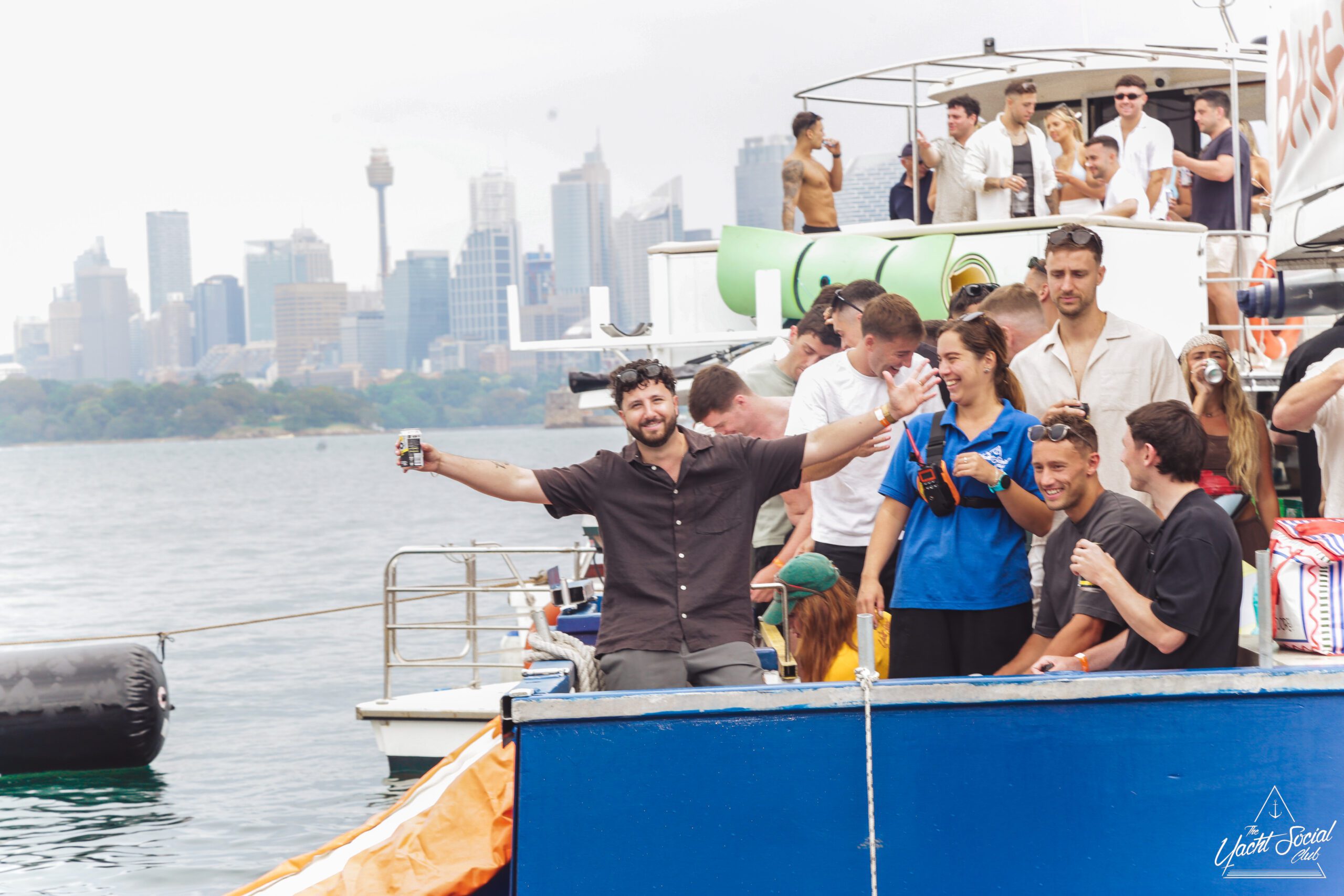 A group of people enjoy a lively boat party on the water with drinks, smiles, and city skyscrapers visible in the background under a bright sky. One man stands at the edge with arms wide open, posing for the camera.