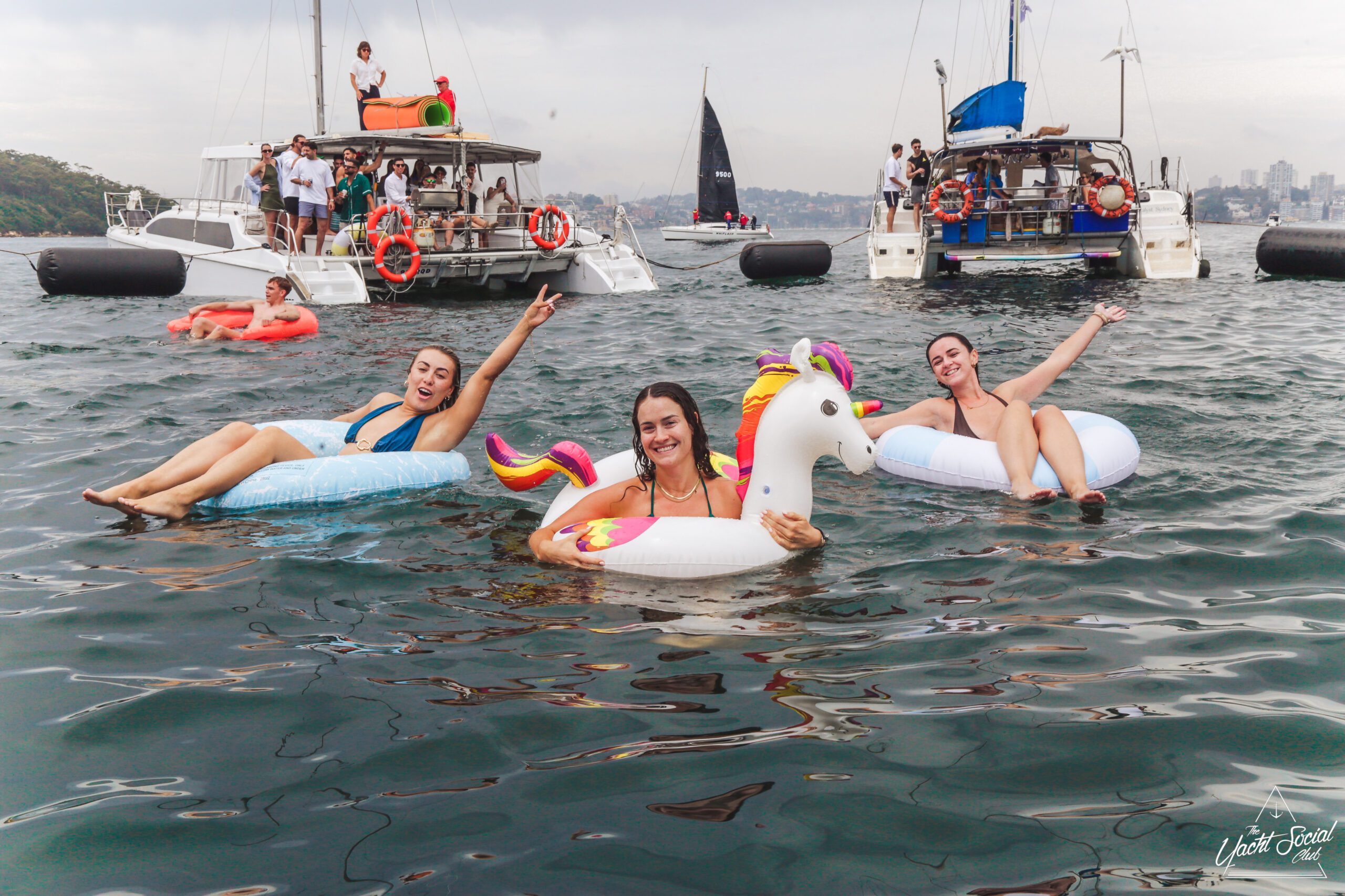 Three women smile and pose on inflatable floats in the water near several boats during a party; two women are on unicorn floats and one on a seashell, with people watching from nearby yachts.