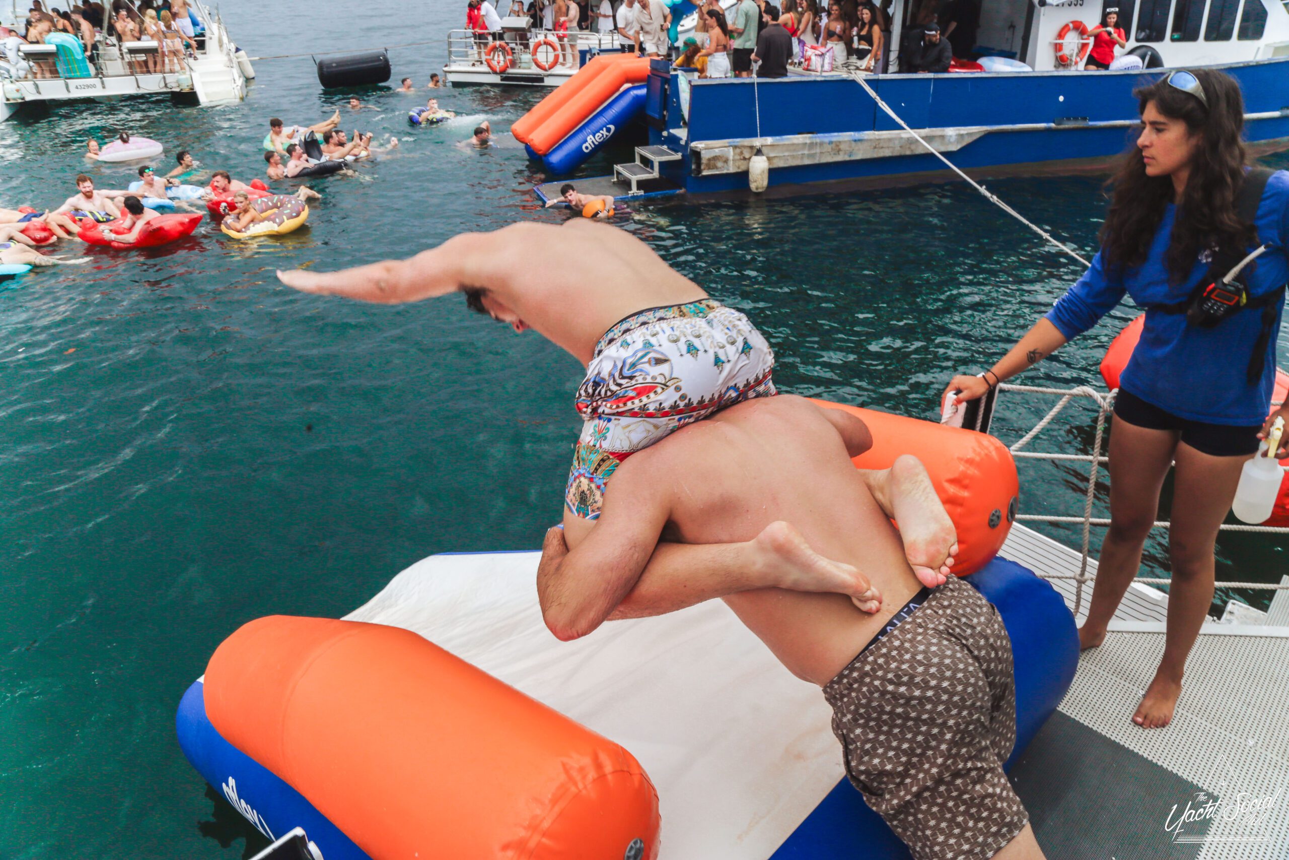 Two men in swim trunks are playfully diving off an inflatable platform into the water, while people swim and relax on floats nearby. A woman stands watching on the ramp, with boats and a crowd in the background.
