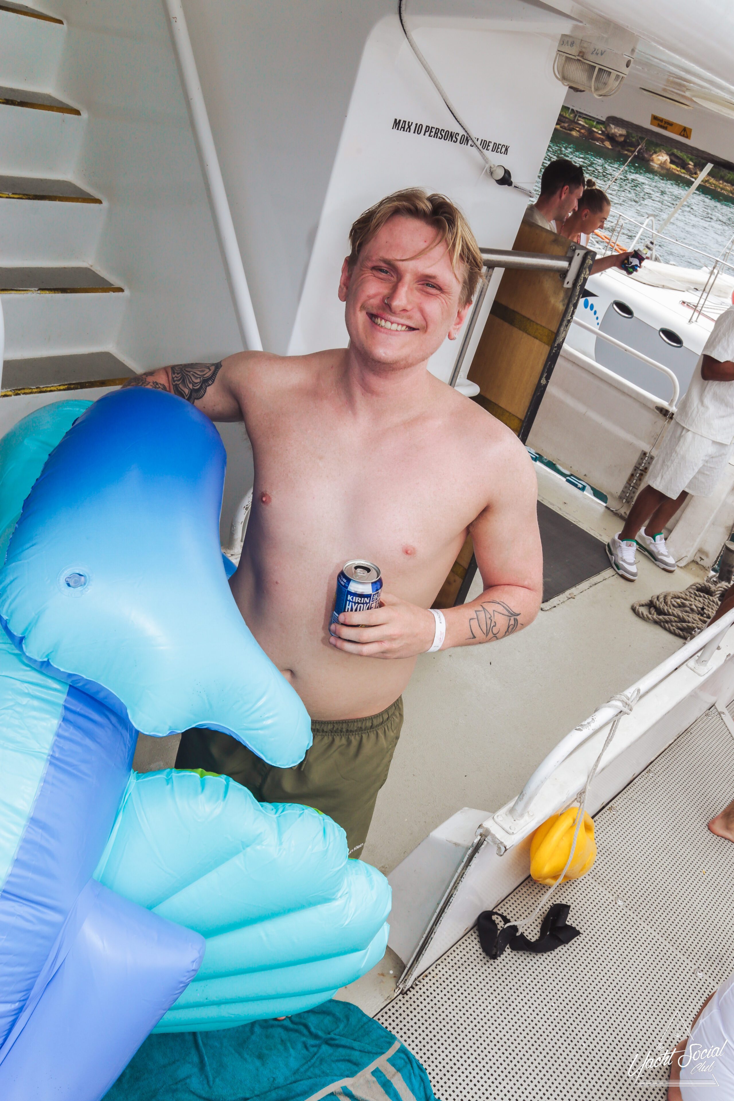 A smiling, shirtless man with tattoos holds a can of beer and stands beside a blue inflatable pool float on a boat. Other people are in the background, and the boat is docked near the water.