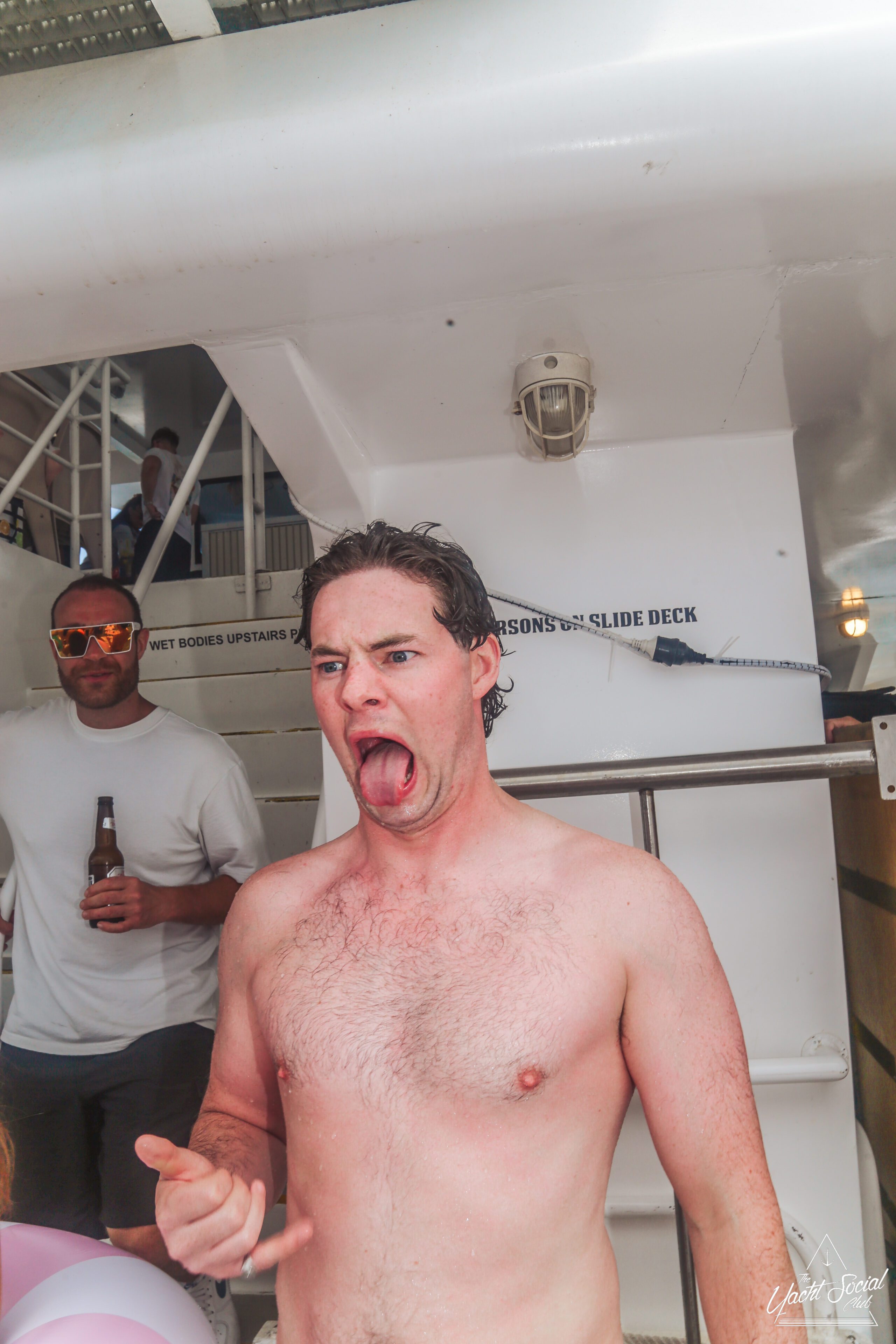 A shirtless man with wet hair makes a funny face, sticking out his tongue and squinting. Another man in sunglasses and holding a beer stands in the background on a boat with white railings and stairs.