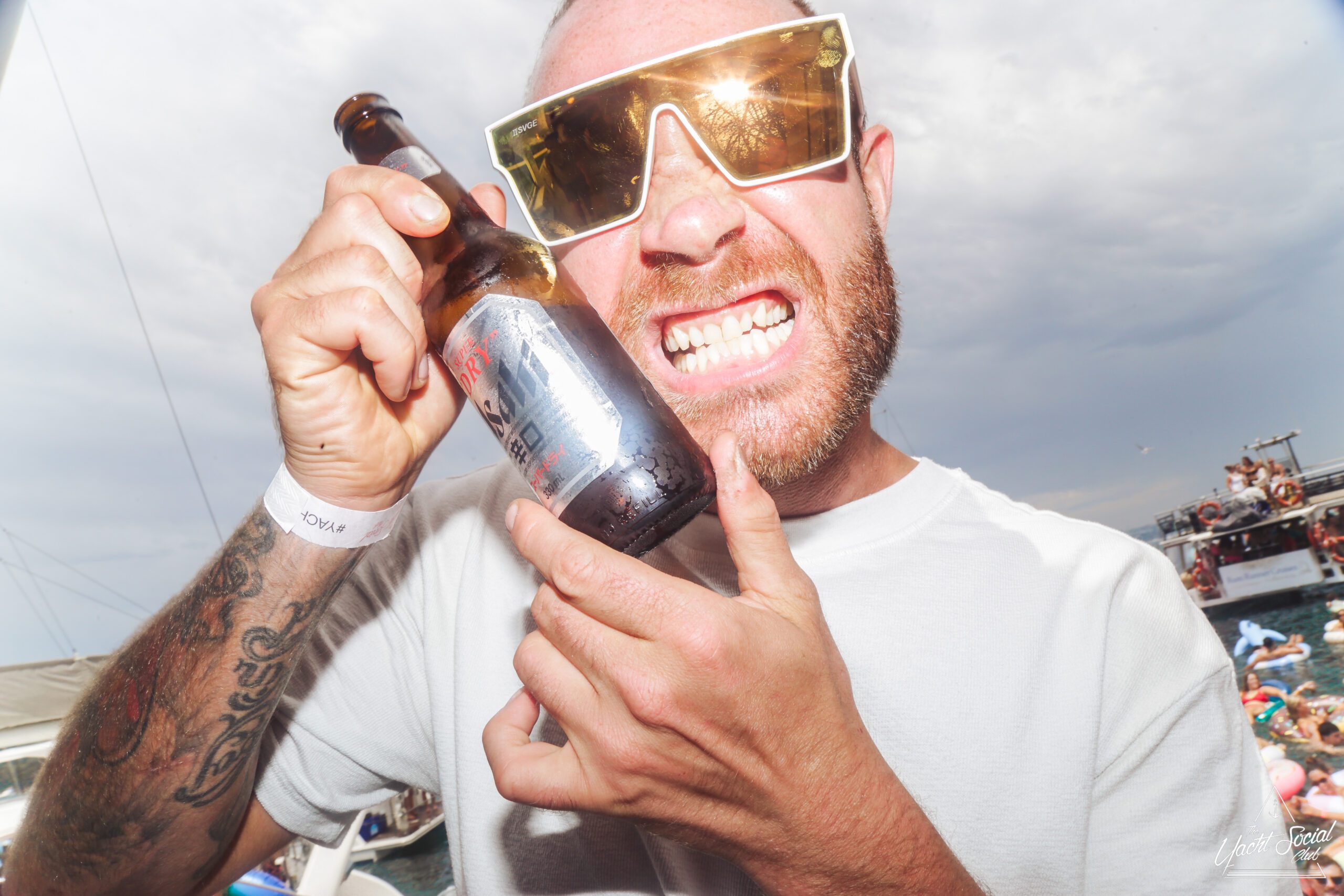 A man in sunglasses grins and holds a beer bottle to his face at an outdoor event. People and boats are visible in the background, and he wears a white wristband and T-shirt. The scene looks festive and lively.