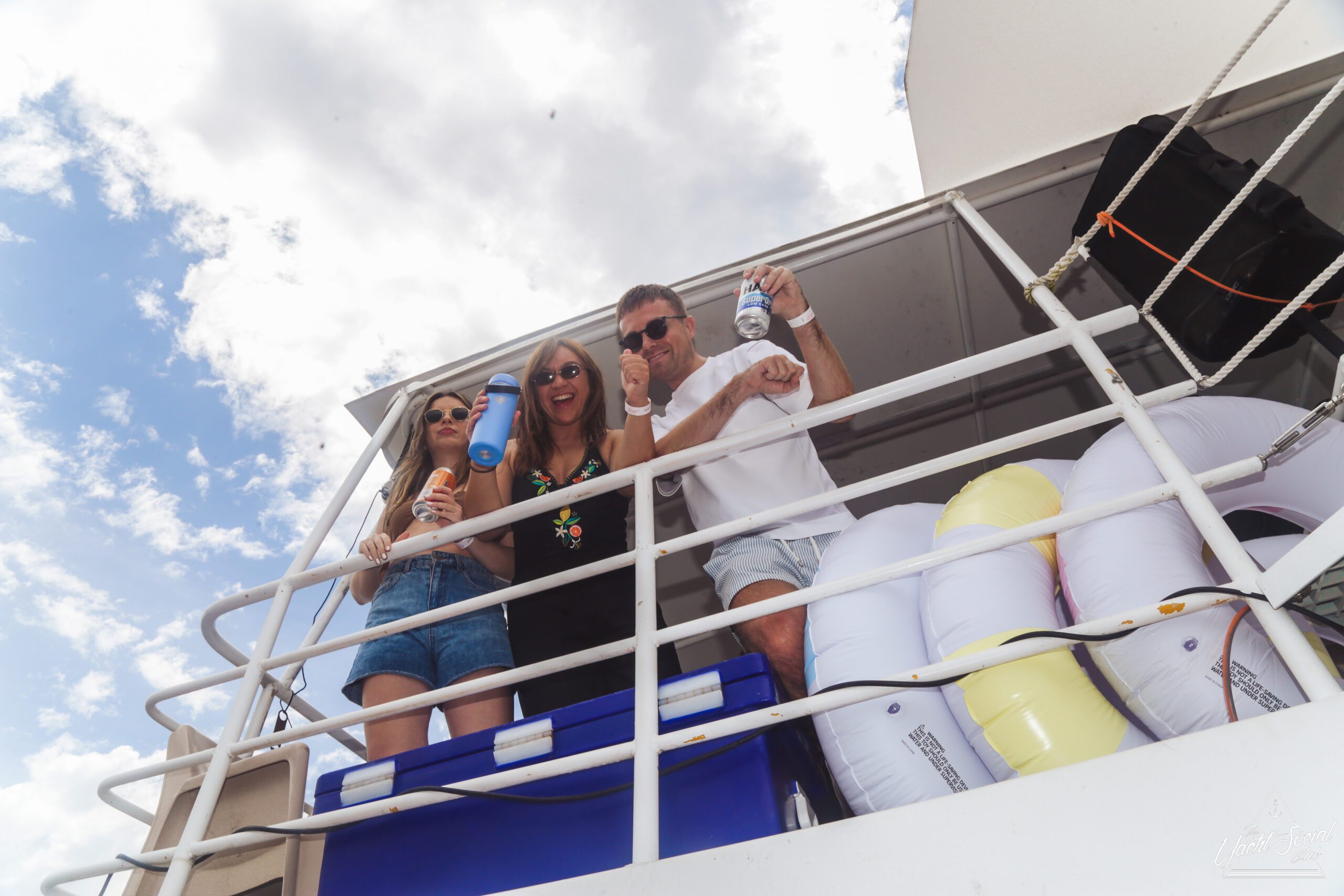 Three people stand on a boat deck holding drinks and smiling, with inflatable pool floats and a blue cooler beside them. The sky is partly cloudy in the background.