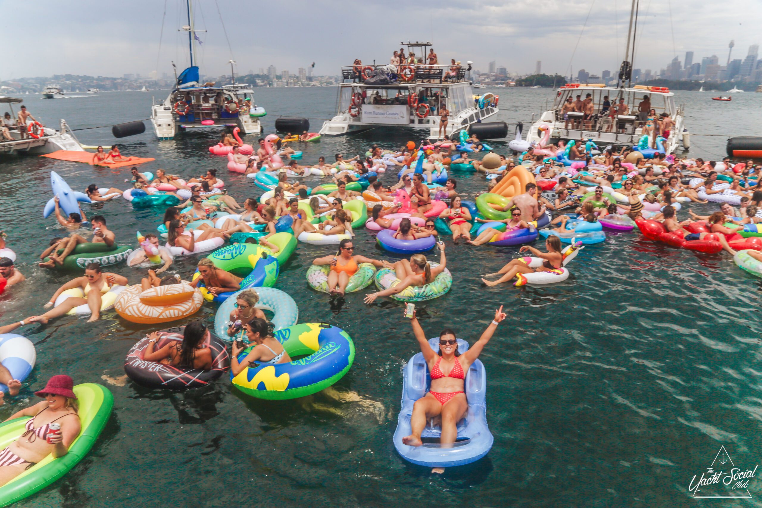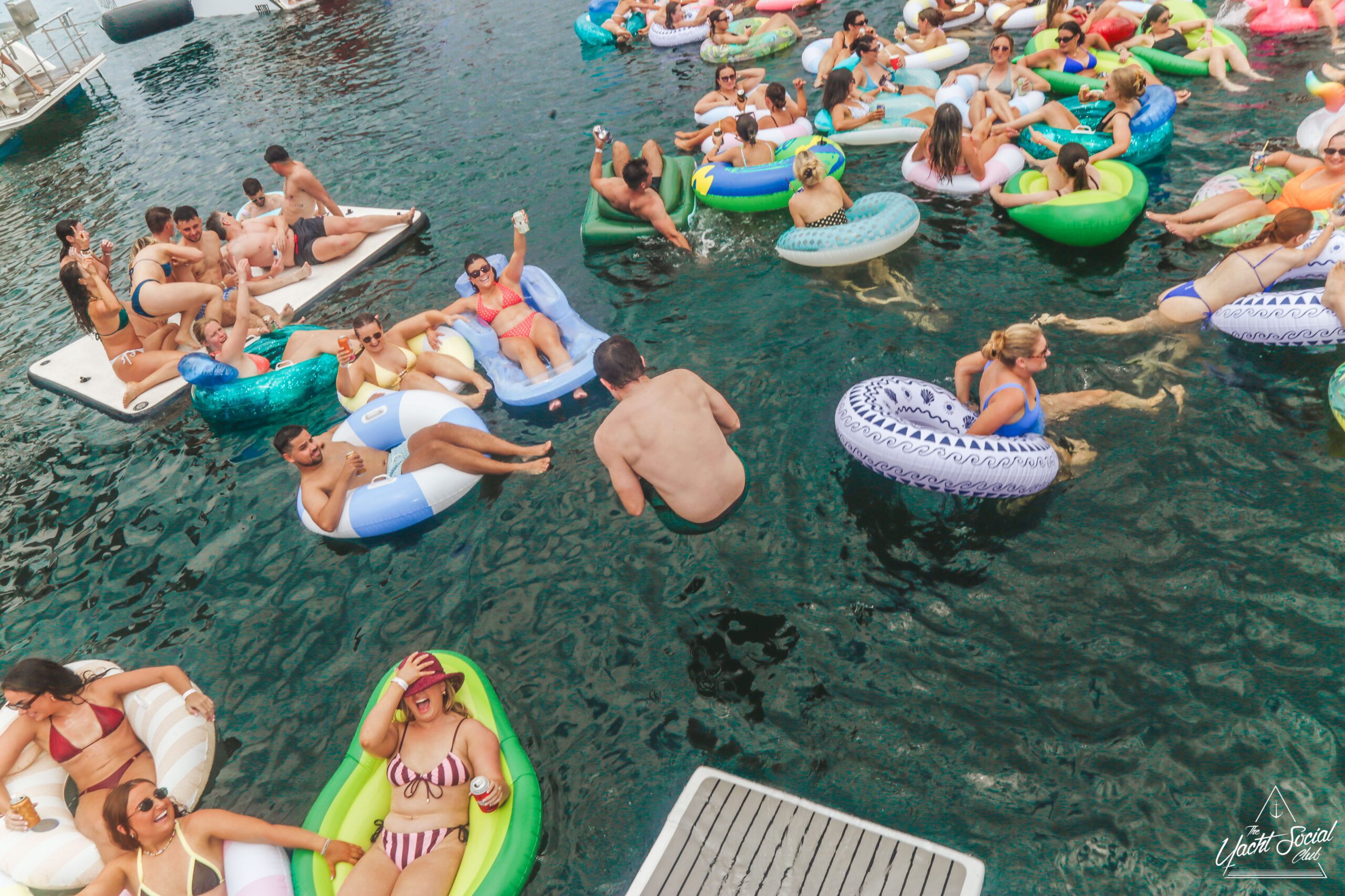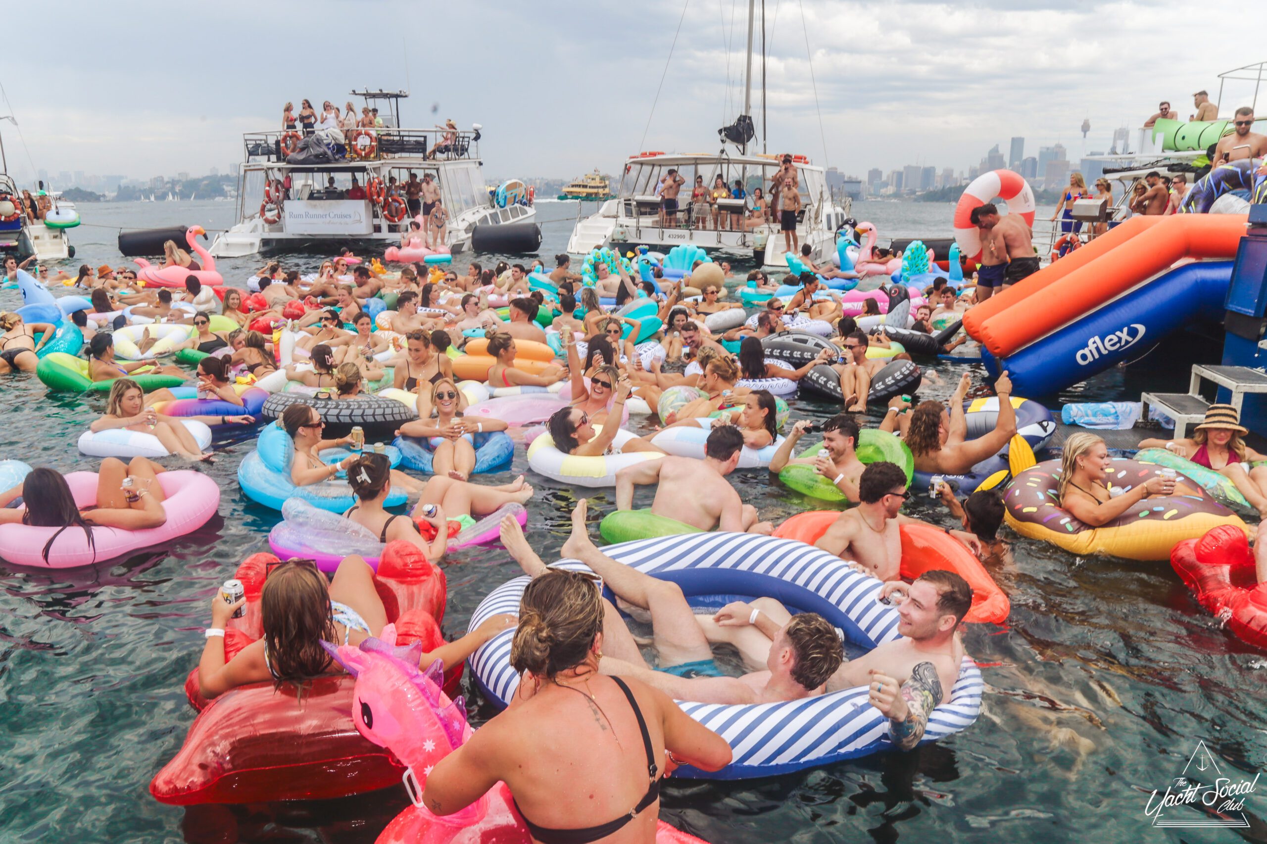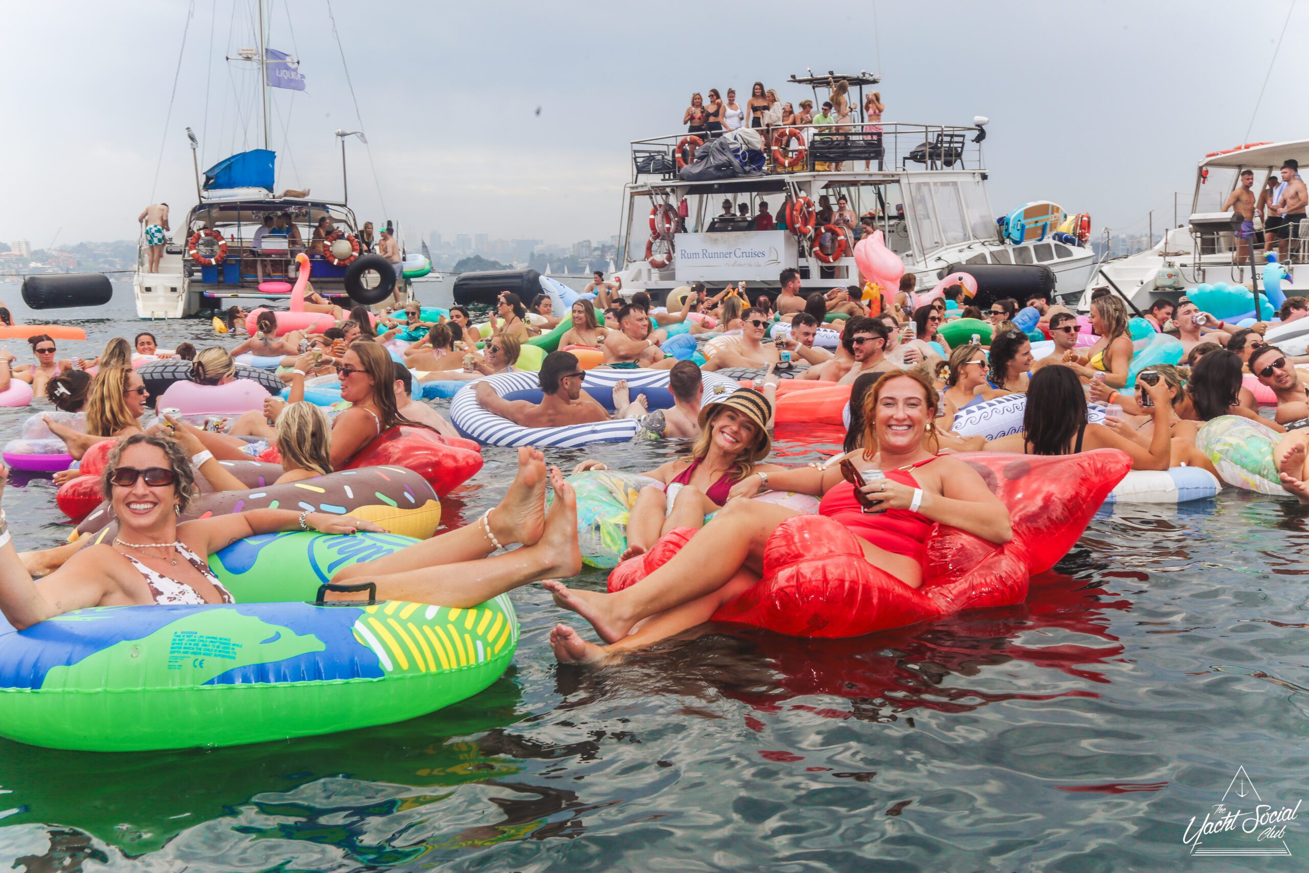 A lively crowd of people floats on colorful inflatable rafts and pool toys in the water, surrounded by boats, enjoying a sunny day party with a city skyline visible in the background.