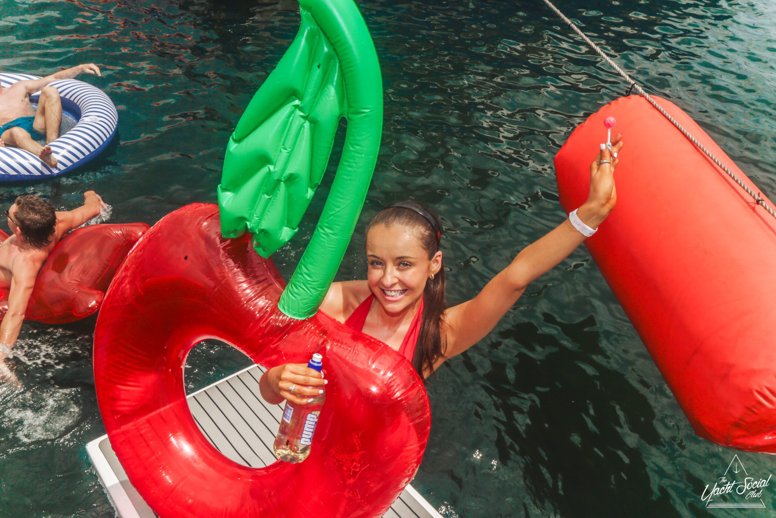 A smiling woman in a red swimsuit holds a red inflatable ring and a lollipop on a dock, surrounded by people and colorful inflatables at a lively pool party on the water.