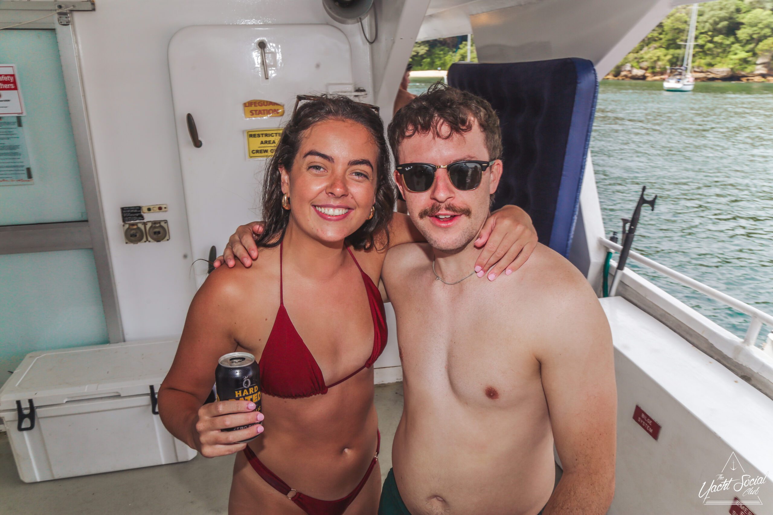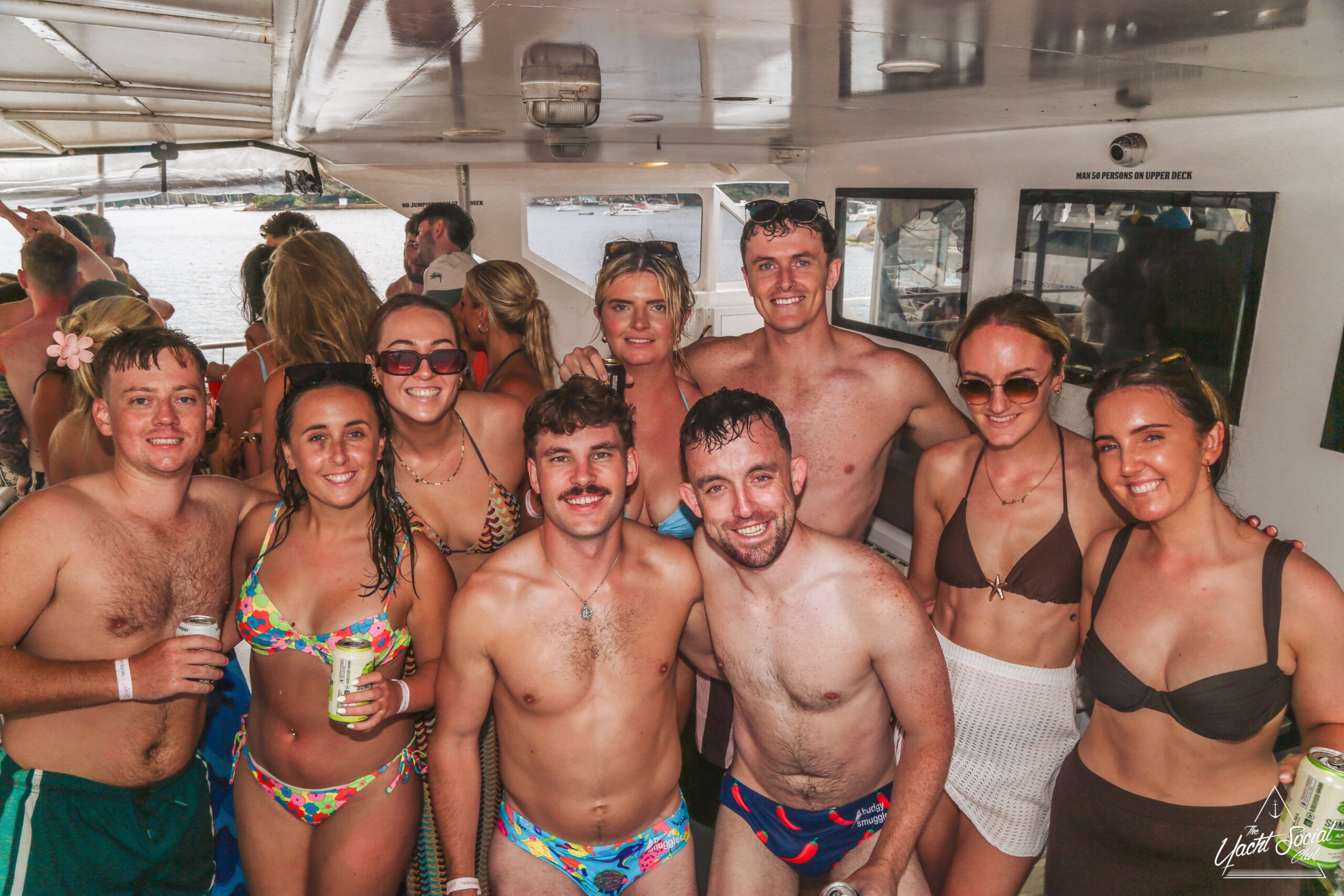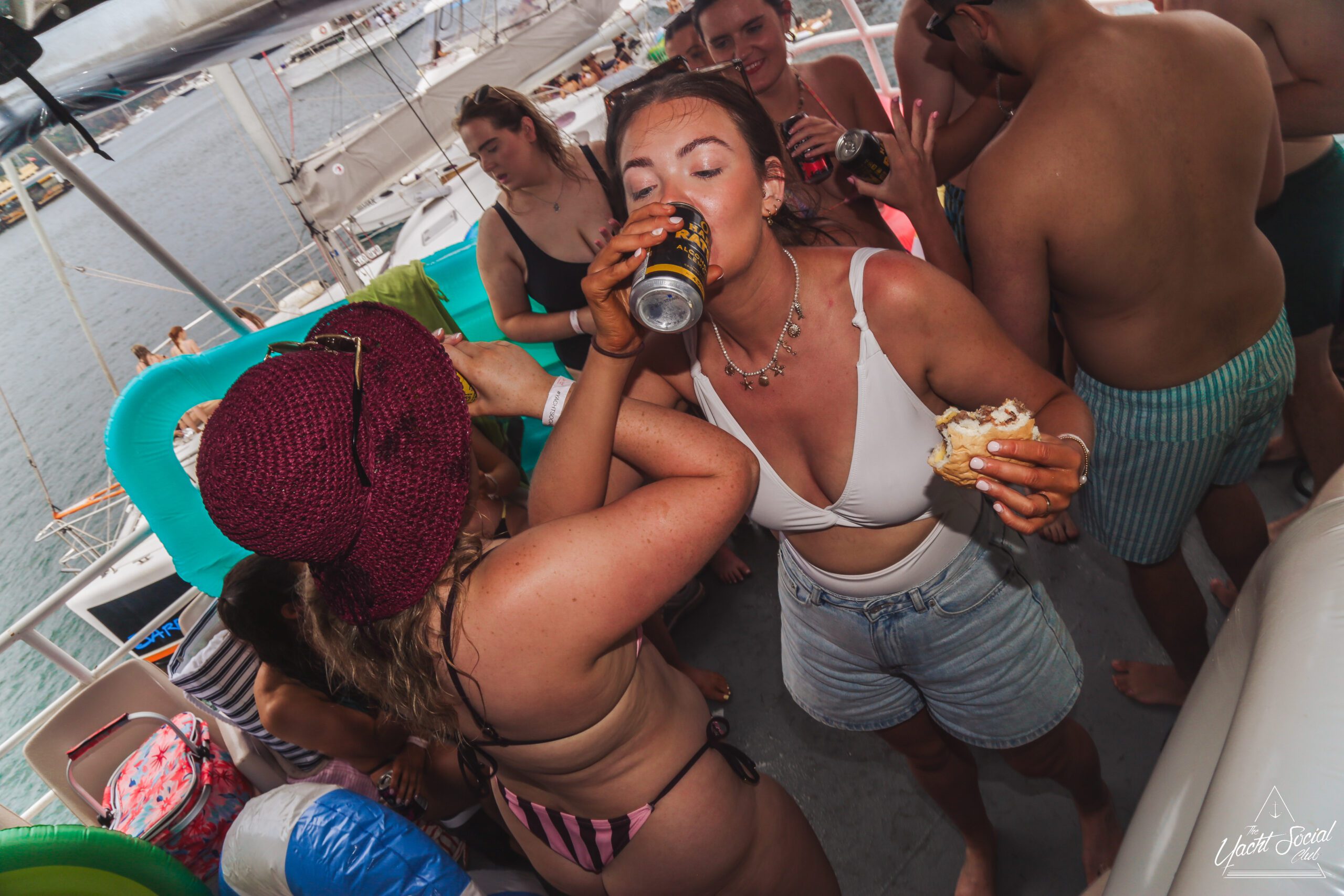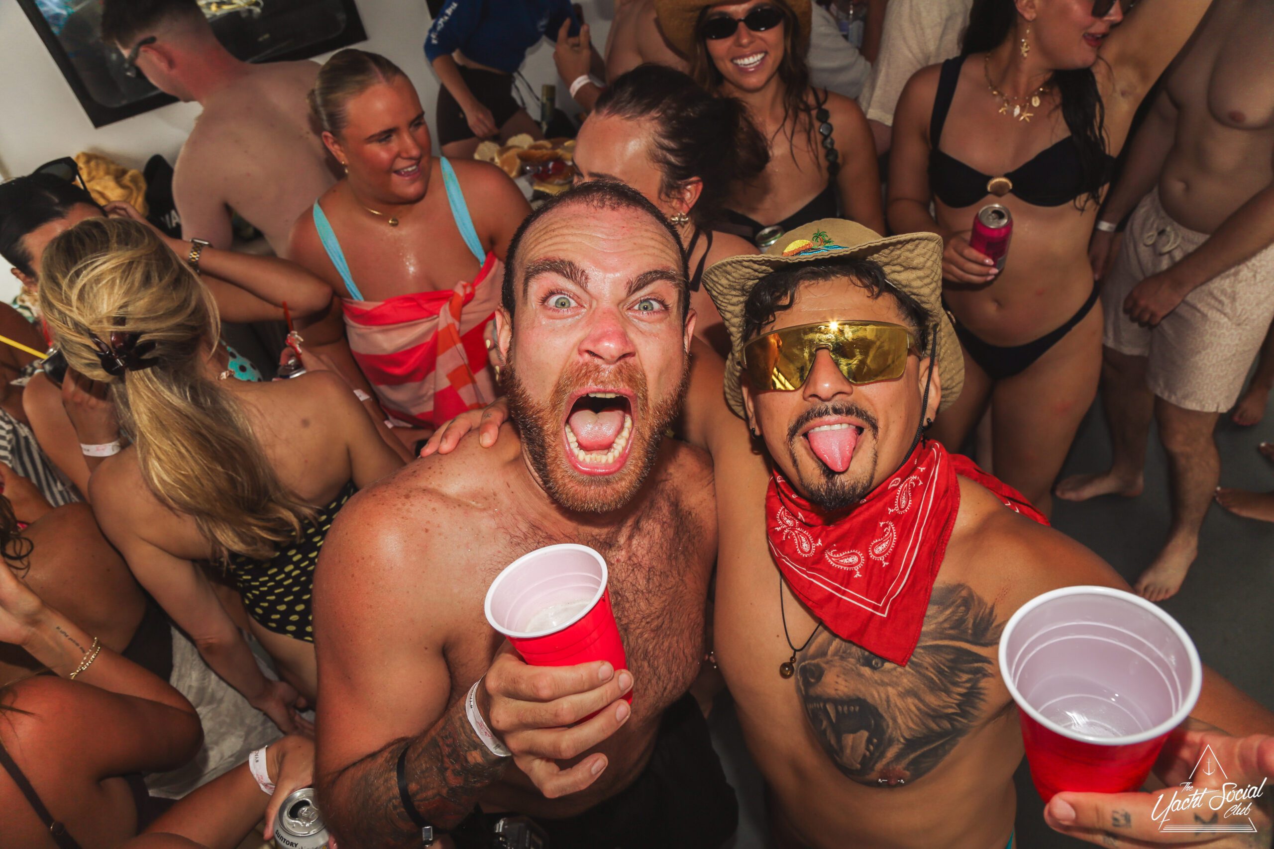 Two smiling women in swimsuits pose with drinks on a boat, surrounded by friends. One woman wears red, the other a blue bikini and hat. Water is visible outside as others mingle and enjoy the party atmosphere.
