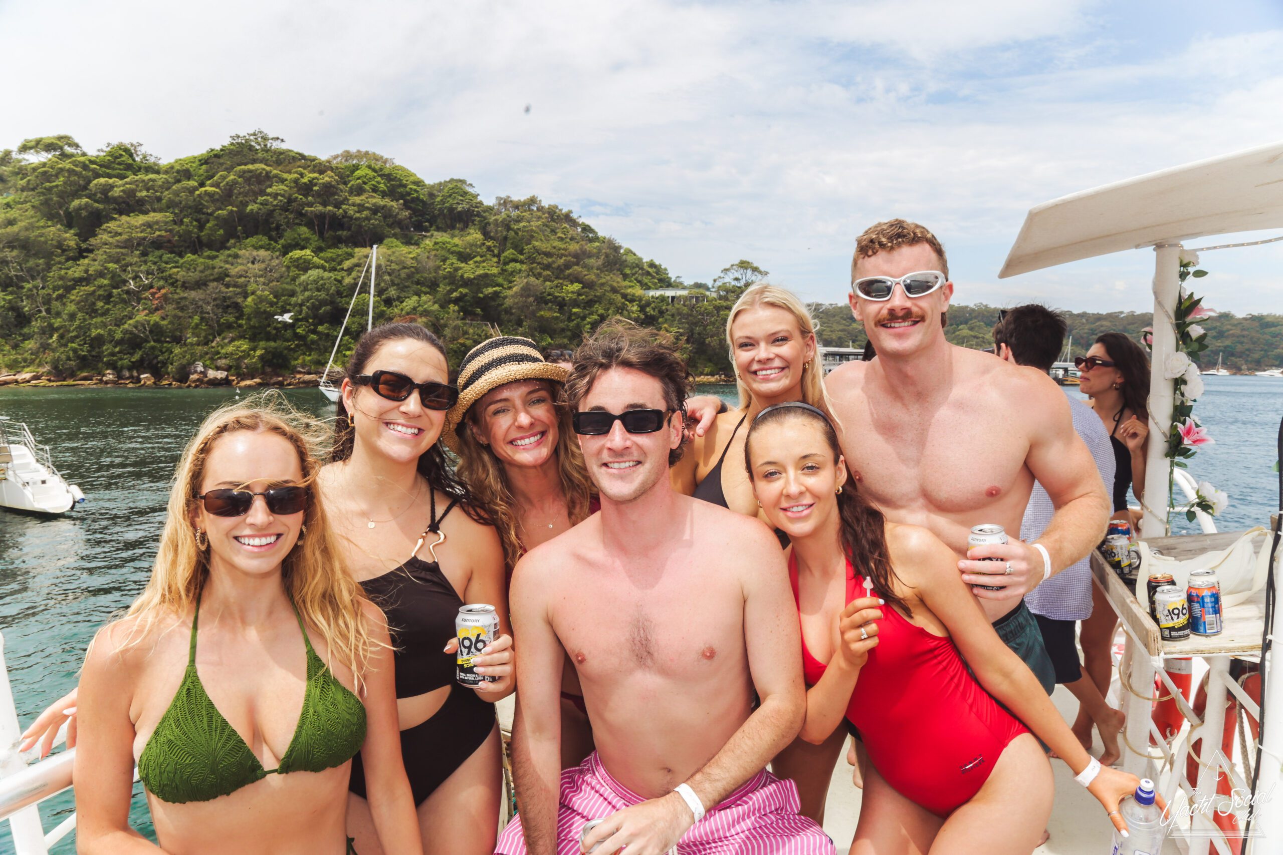 A group of eight smiling people, dressed in swimsuits and summer clothing, stand together on a boat holding drinks. The background shows water, trees, and a city skyline under a sunny sky.