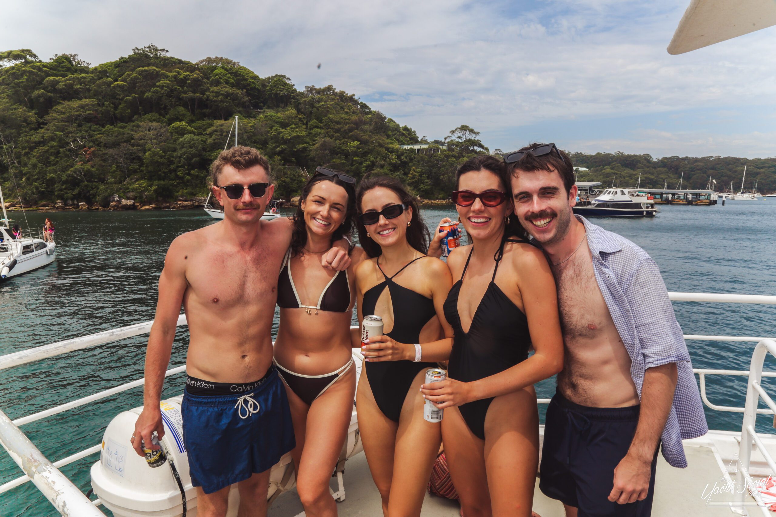 Four women in swimsuits smile and pose together on a boat during a lively daytime party; the background shows water, other boats, and people enjoying the sunny weather.