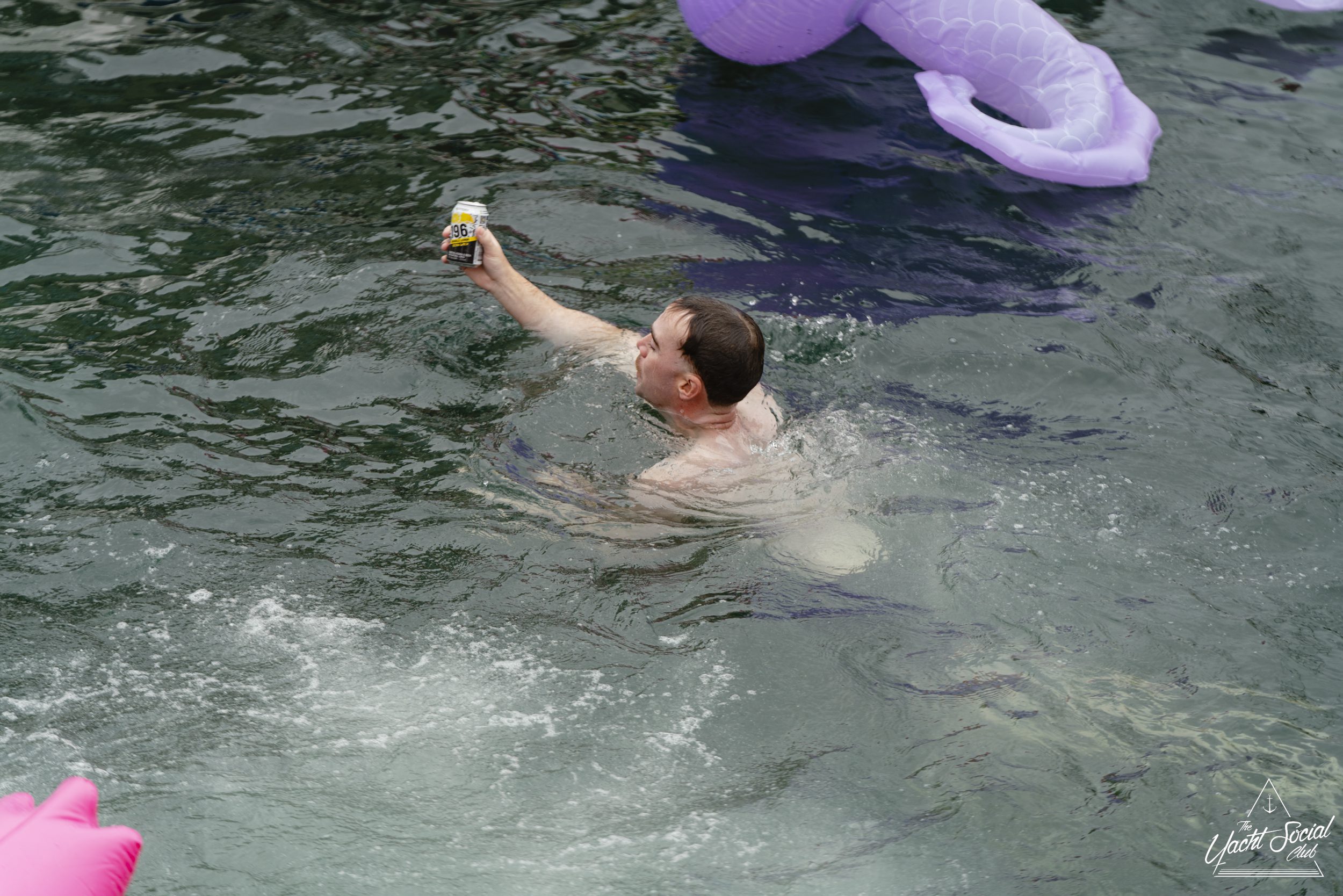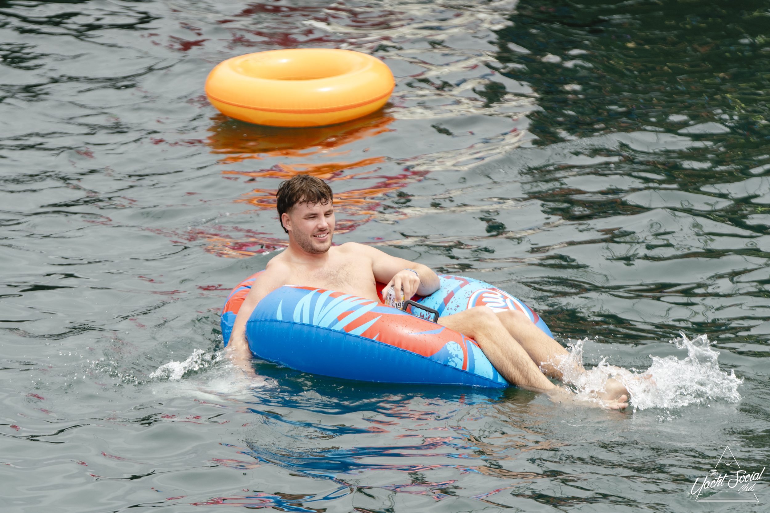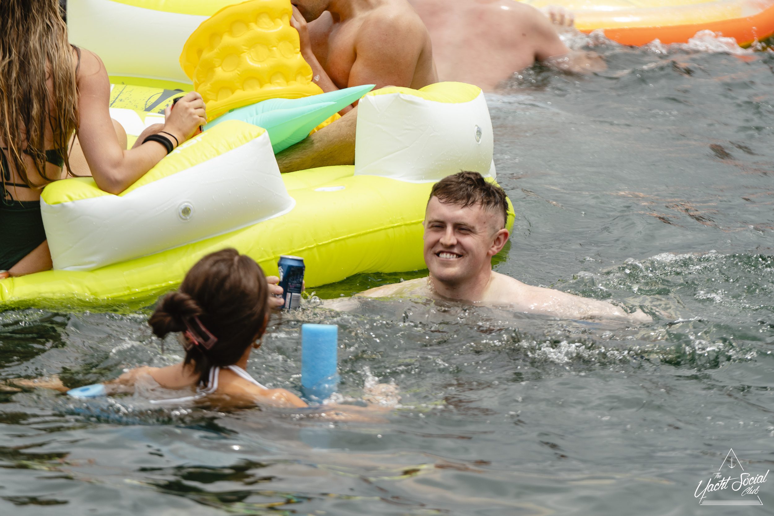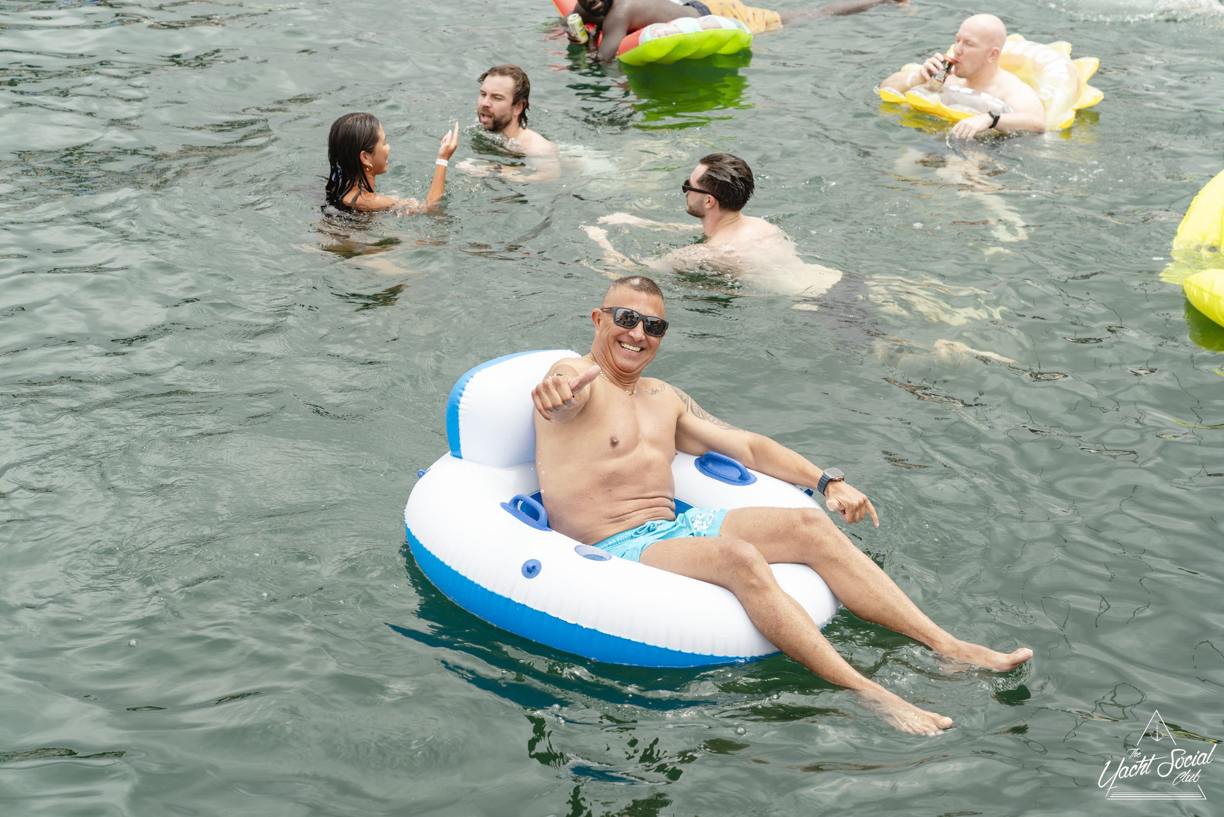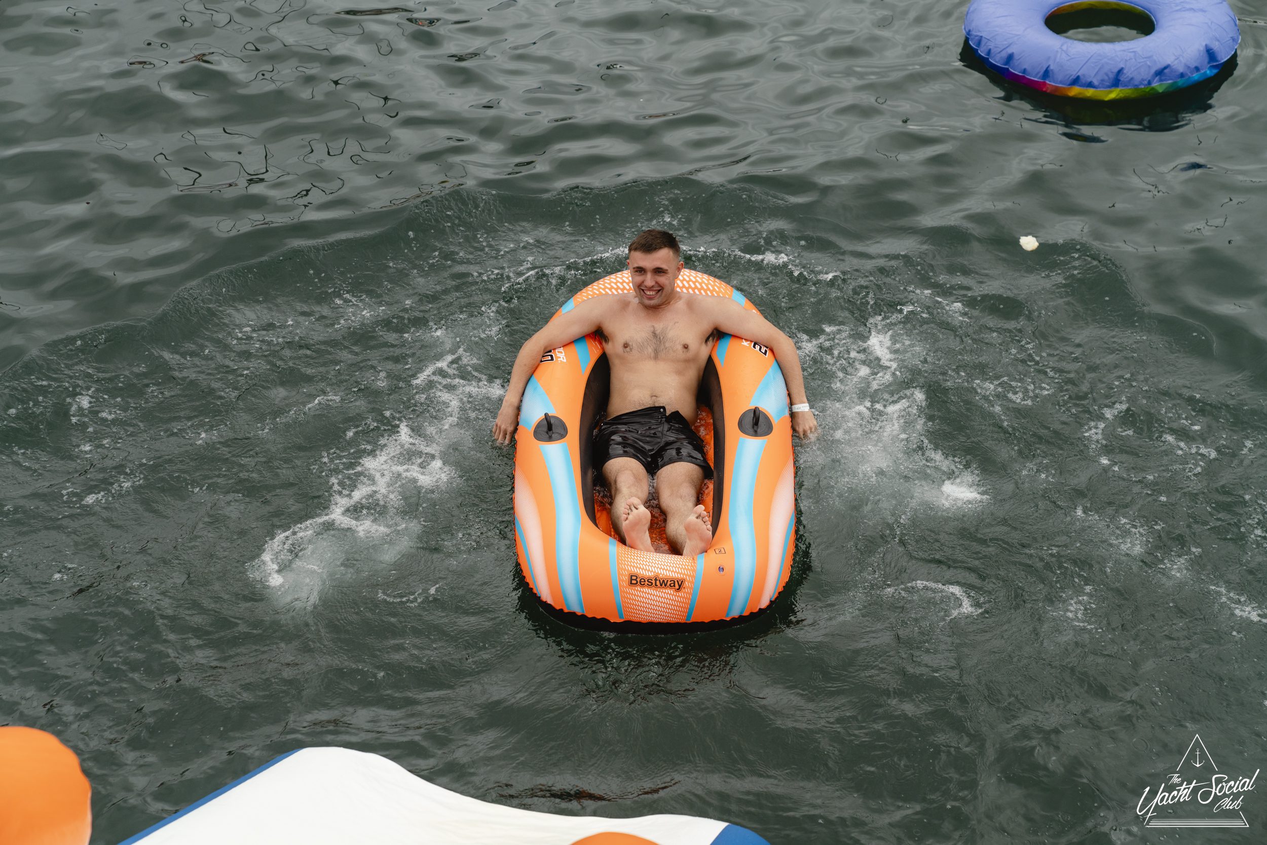 A man relaxes on an inflatable chair in the water, giving a thumbs-up and holding a drink. Behind him, people are enjoying a party on a boat and various floaties. The atmosphere is lively and festive, with a cloudy sky overhead.