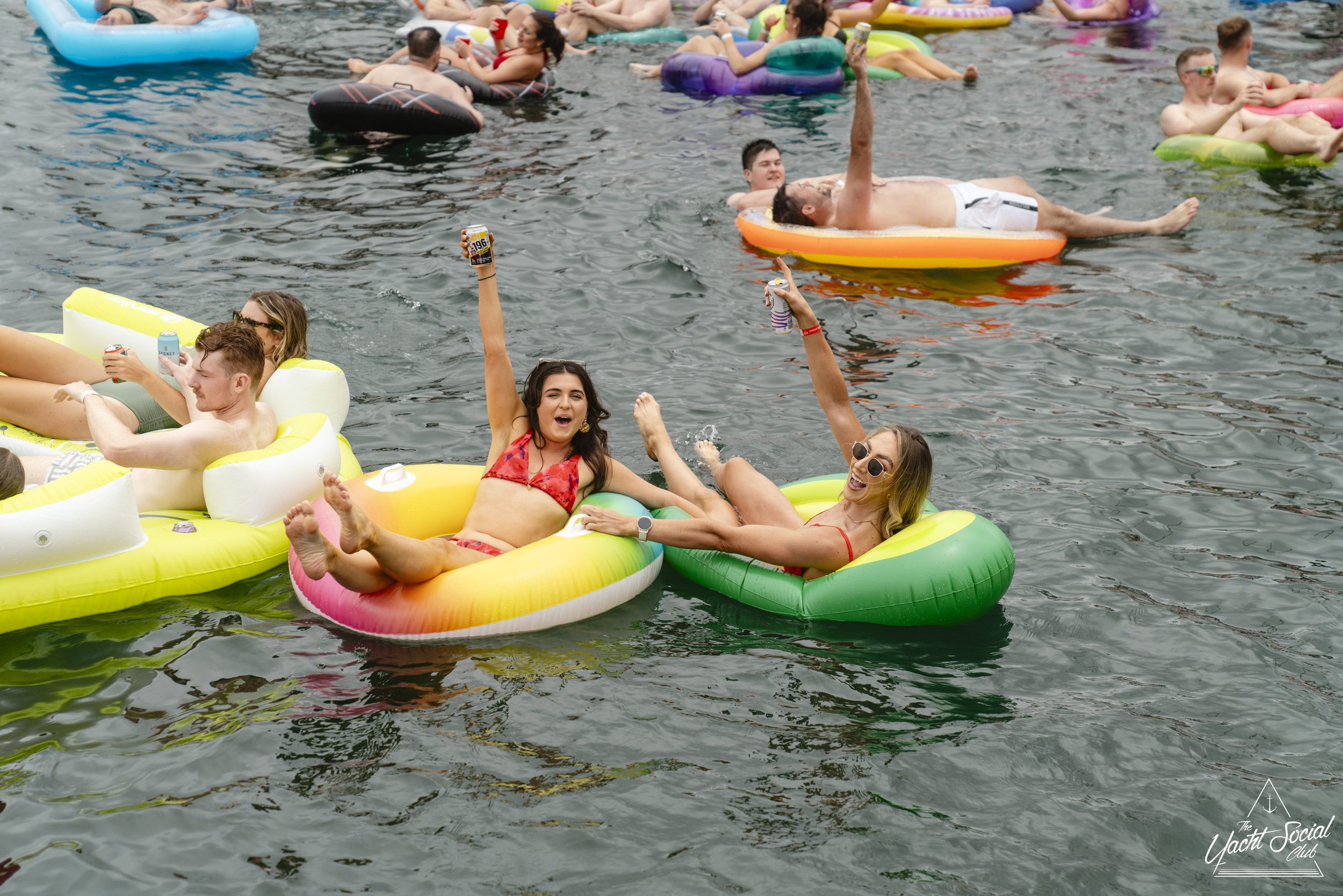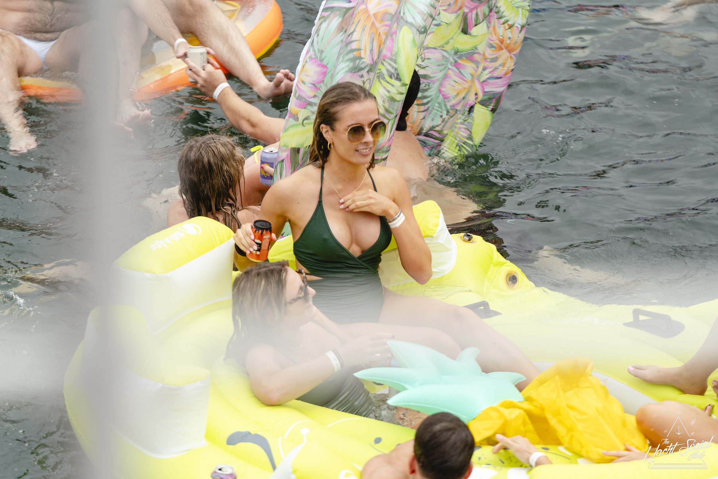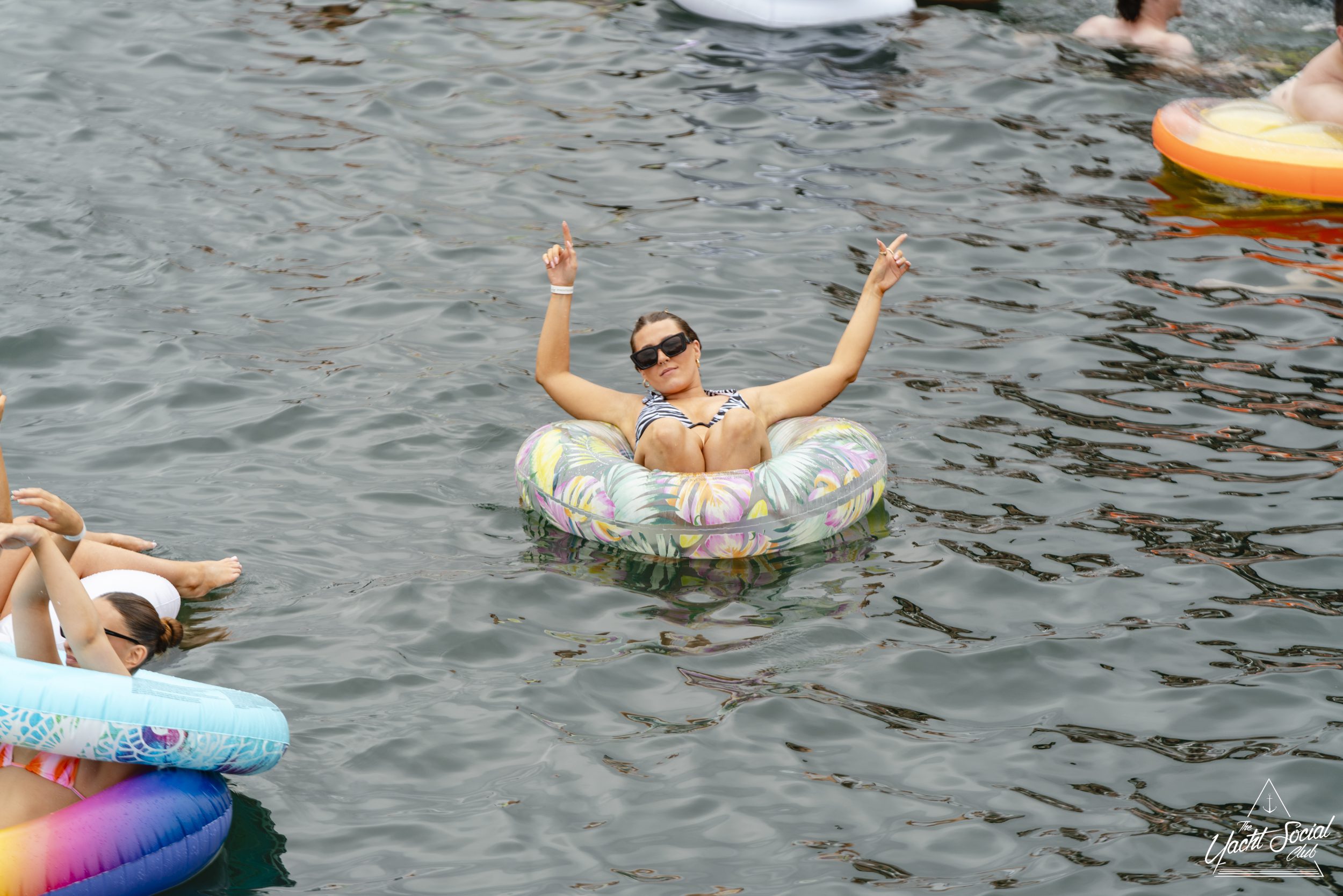 A group of people enjoying a boat party, lounging on colorful inflatable floats in the water. A woman wearing sunglasses strikes a playful pose with one arm and leg up. Boats and greenery are visible in the background under a cloudy sky.