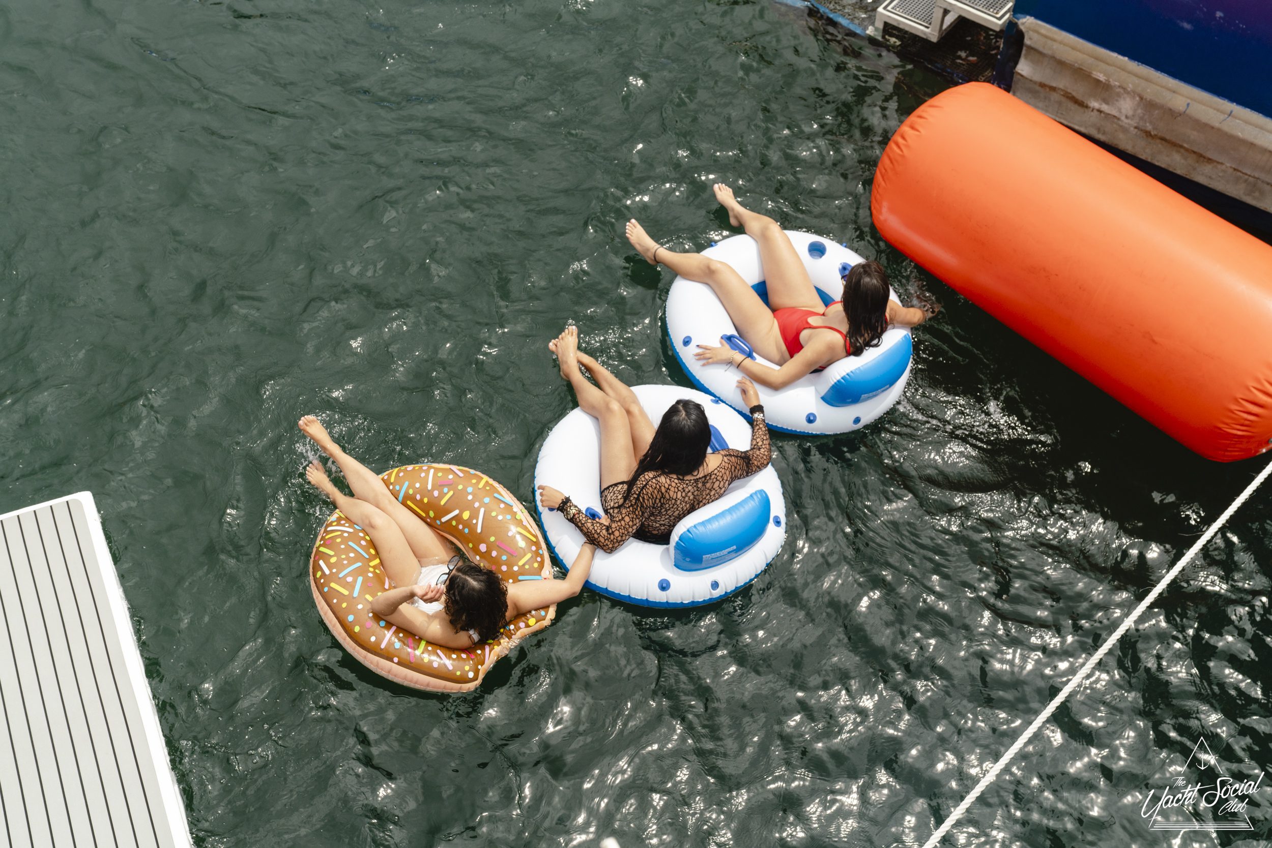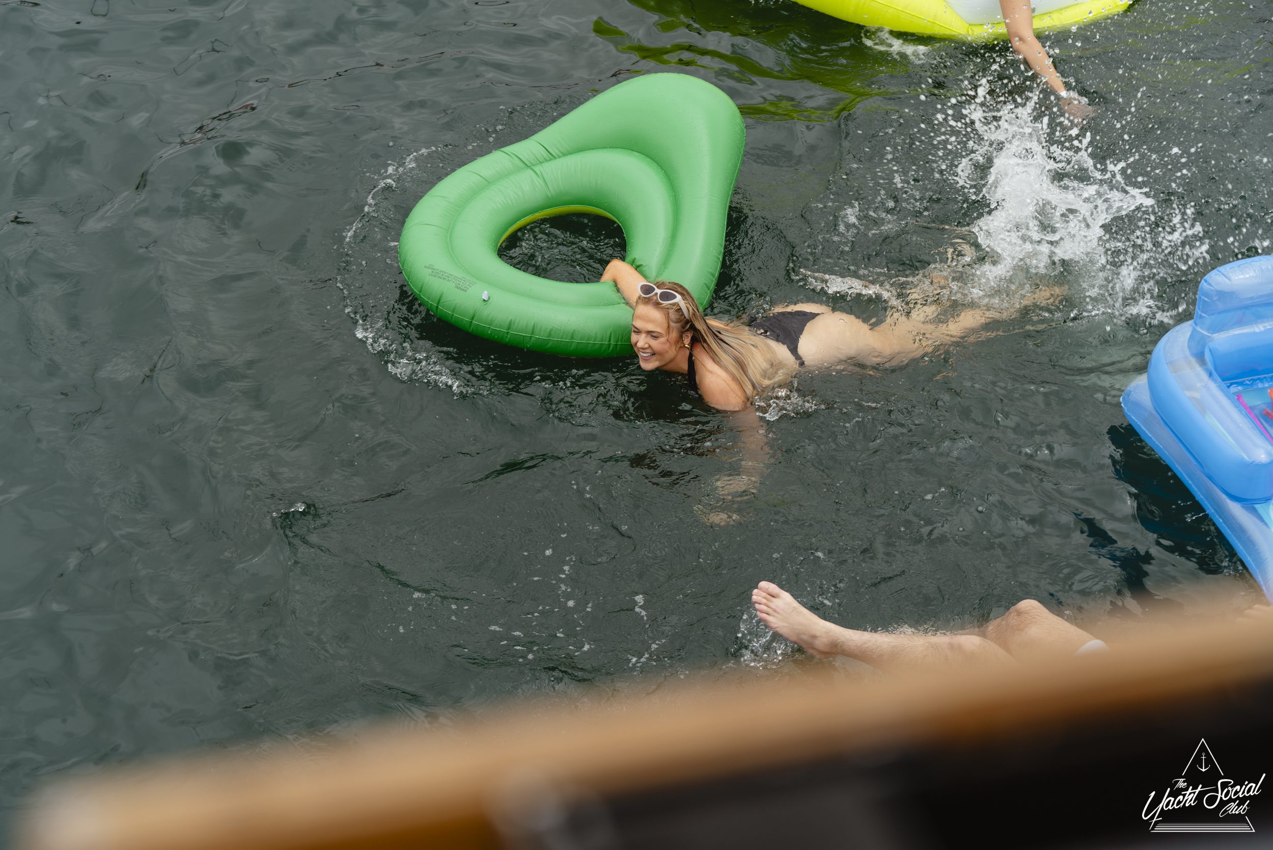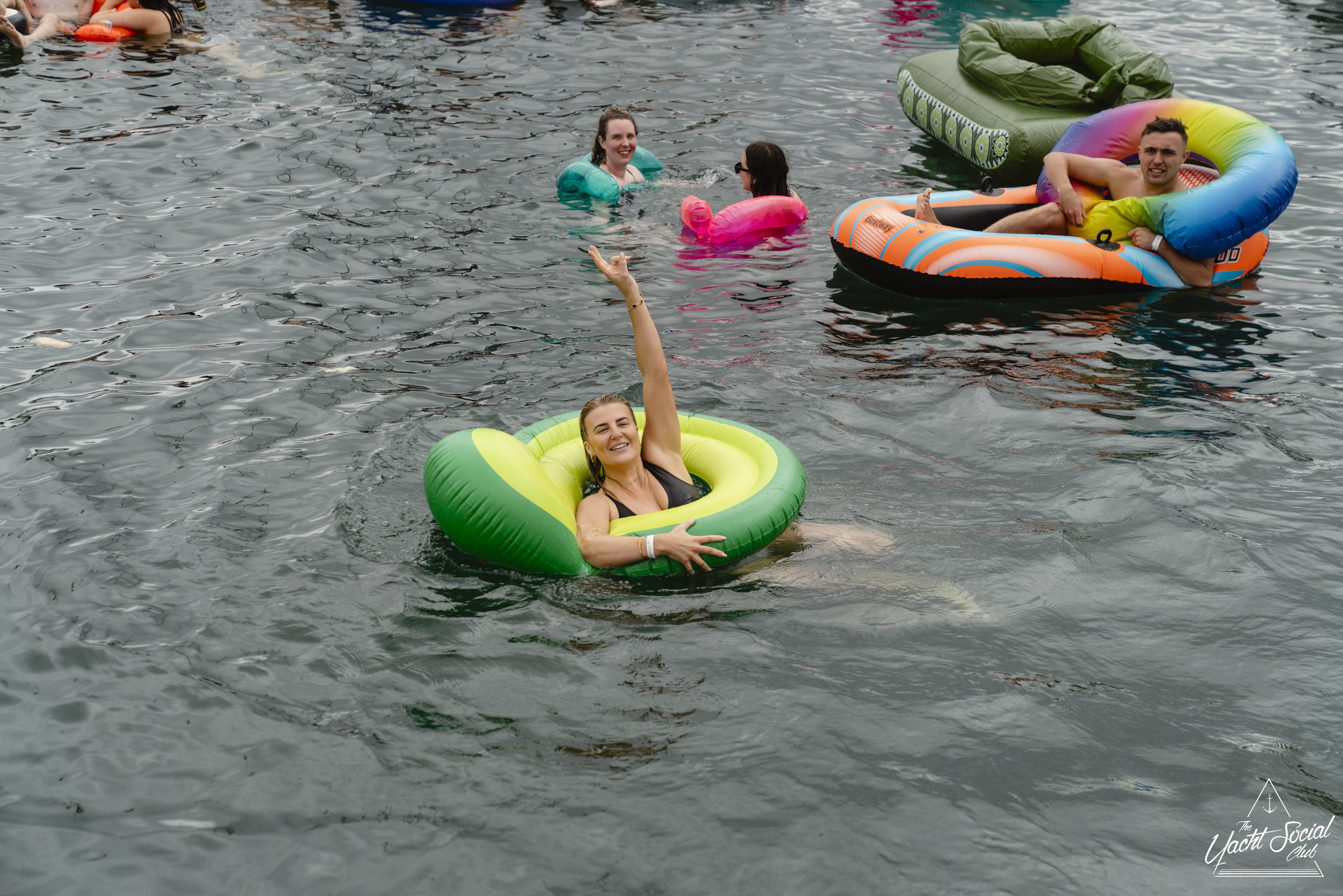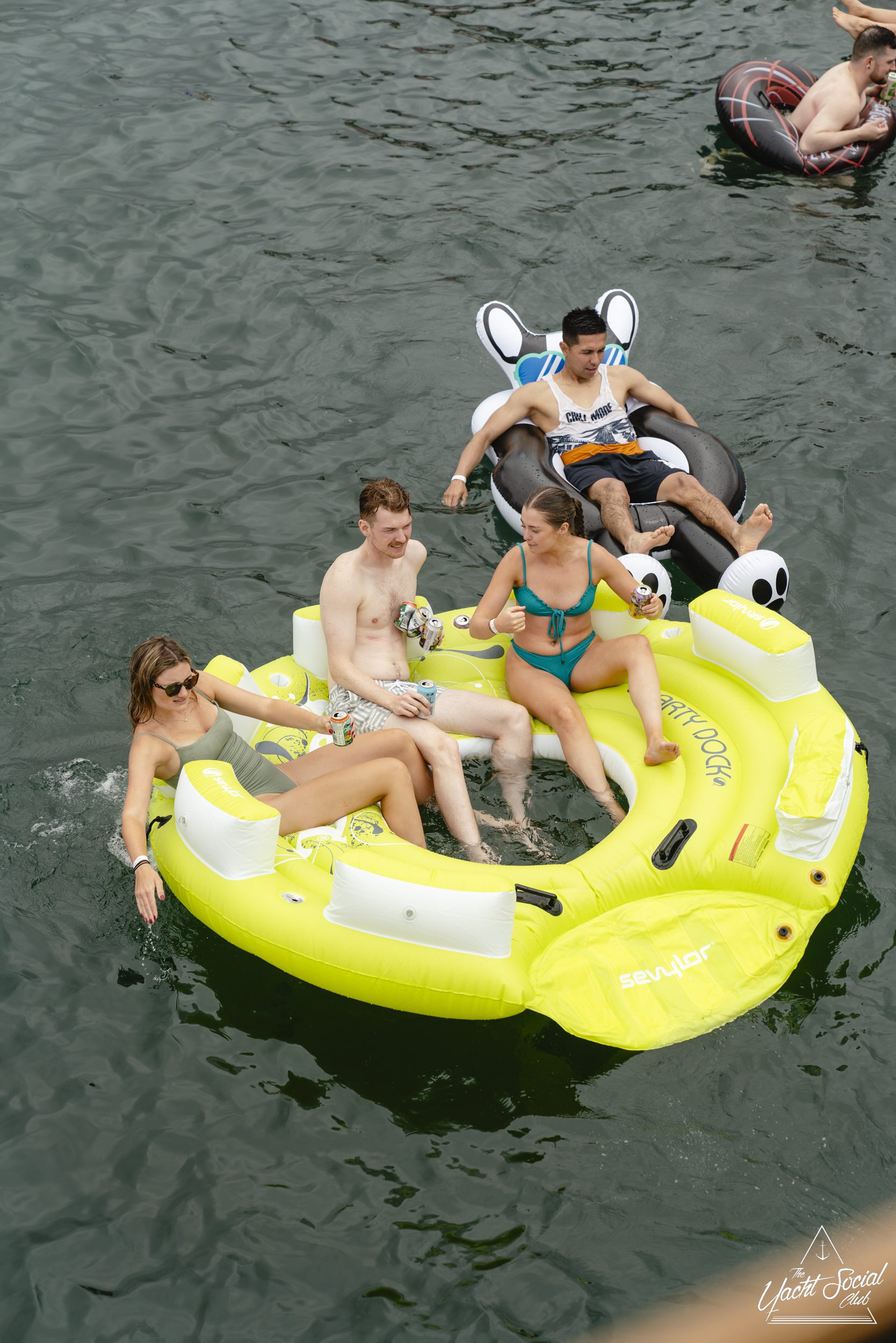 A group of people enjoying a boat party, lounging on colorful inflatable floats in the water. A woman wearing sunglasses strikes a playful pose with one arm and leg up. Boats and greenery are visible in the background under a cloudy sky.