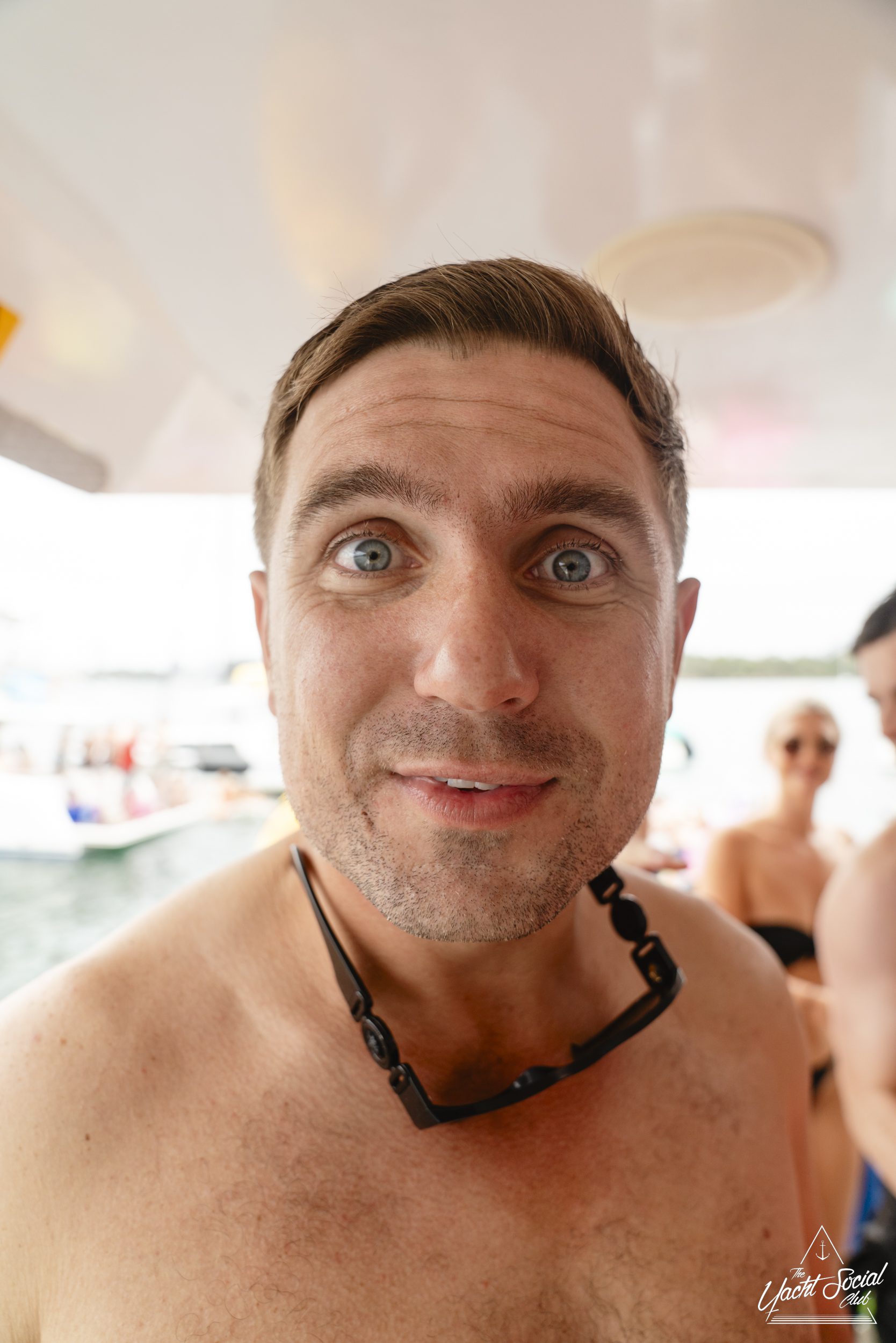A man with short hair, wearing sunglasses around his neck, smiles into the camera on a boat. He is shirtless, and in the background, people relax near the water.