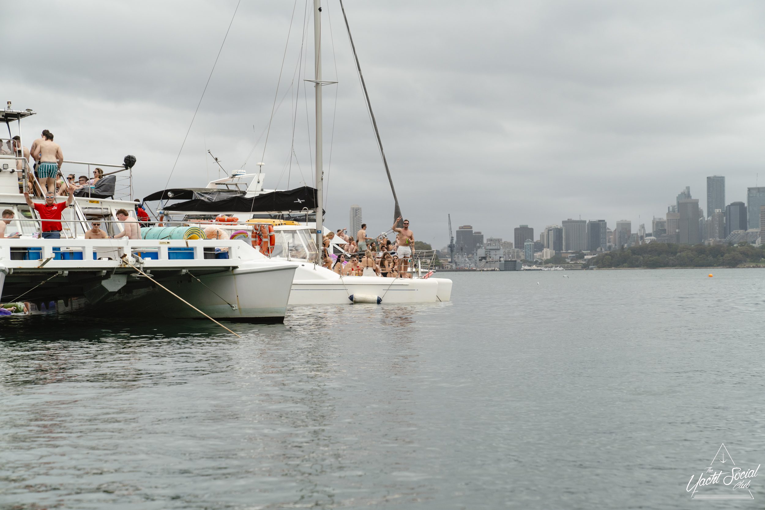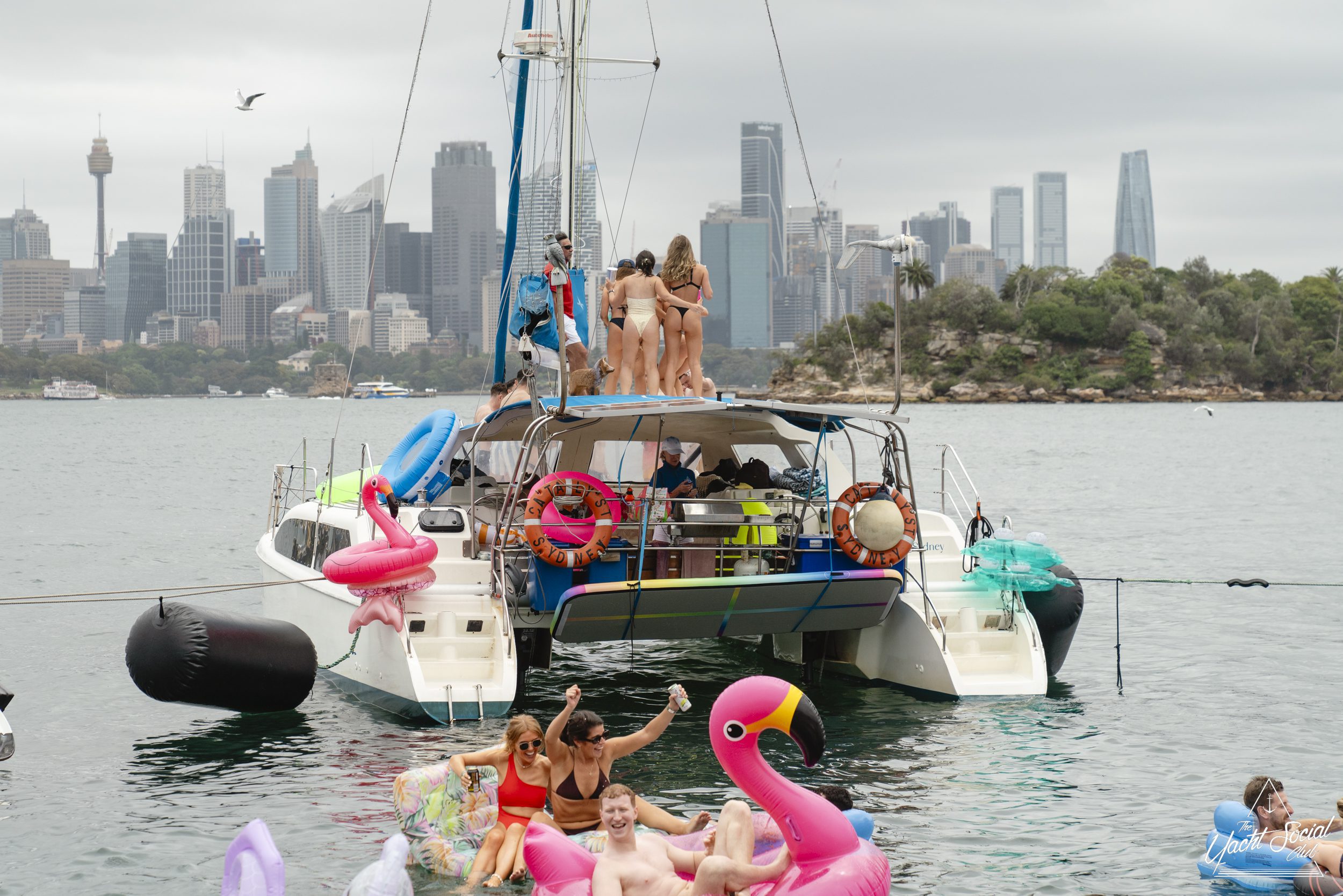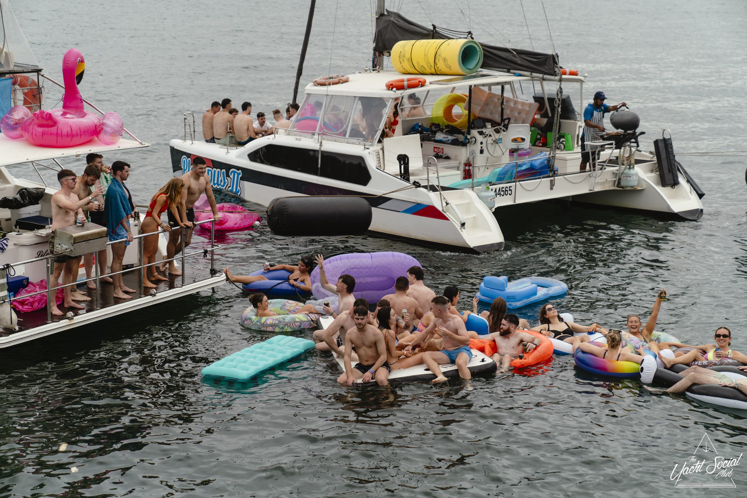 A group of people on a catamaran enjoying a boat party. Some are standing on the deck with drinks, while others are in the water on floating mats. The sky is overcast, and trees are visible in the background.
