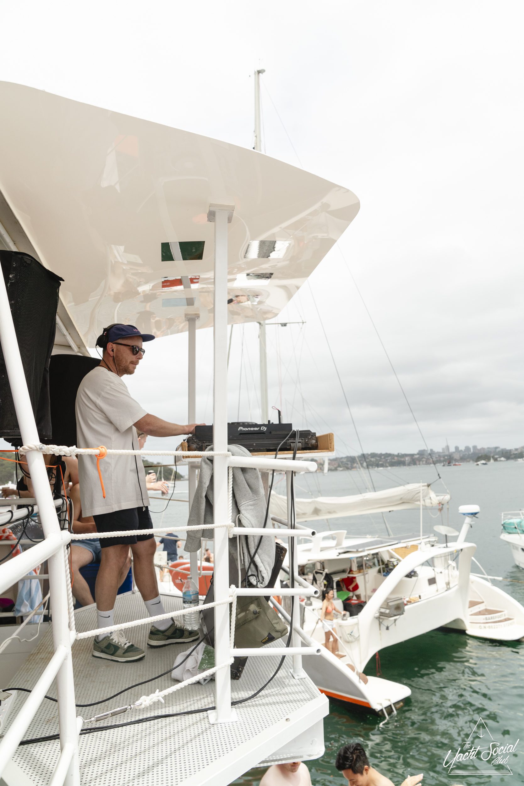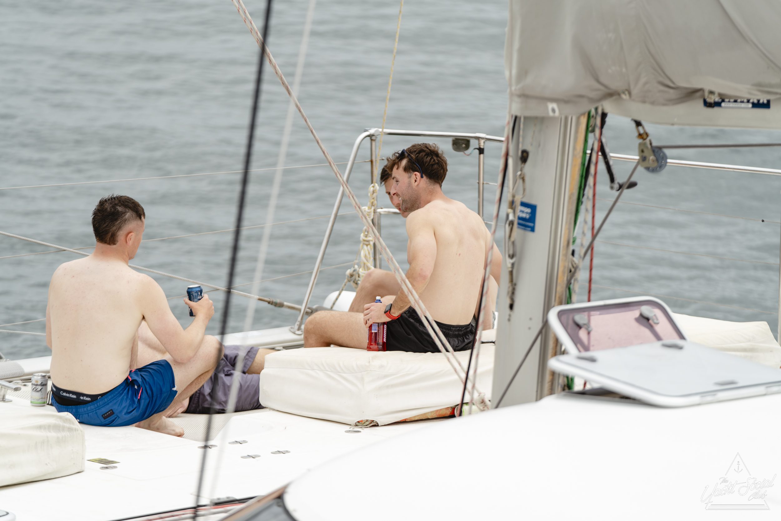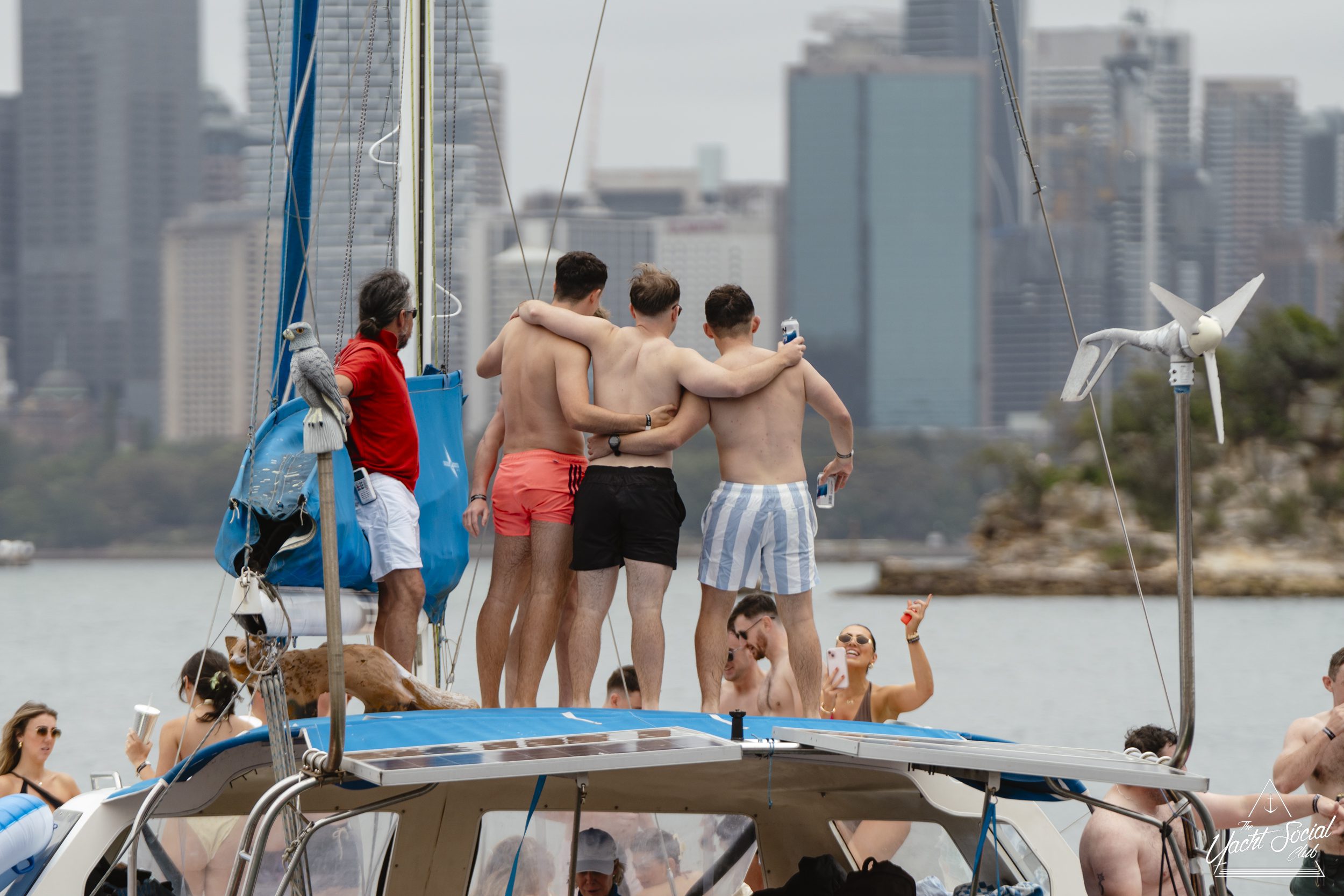 A group of people on a catamaran enjoying a boat party. Some are standing on the deck with drinks, while others are in the water on floating mats. The sky is overcast, and trees are visible in the background.