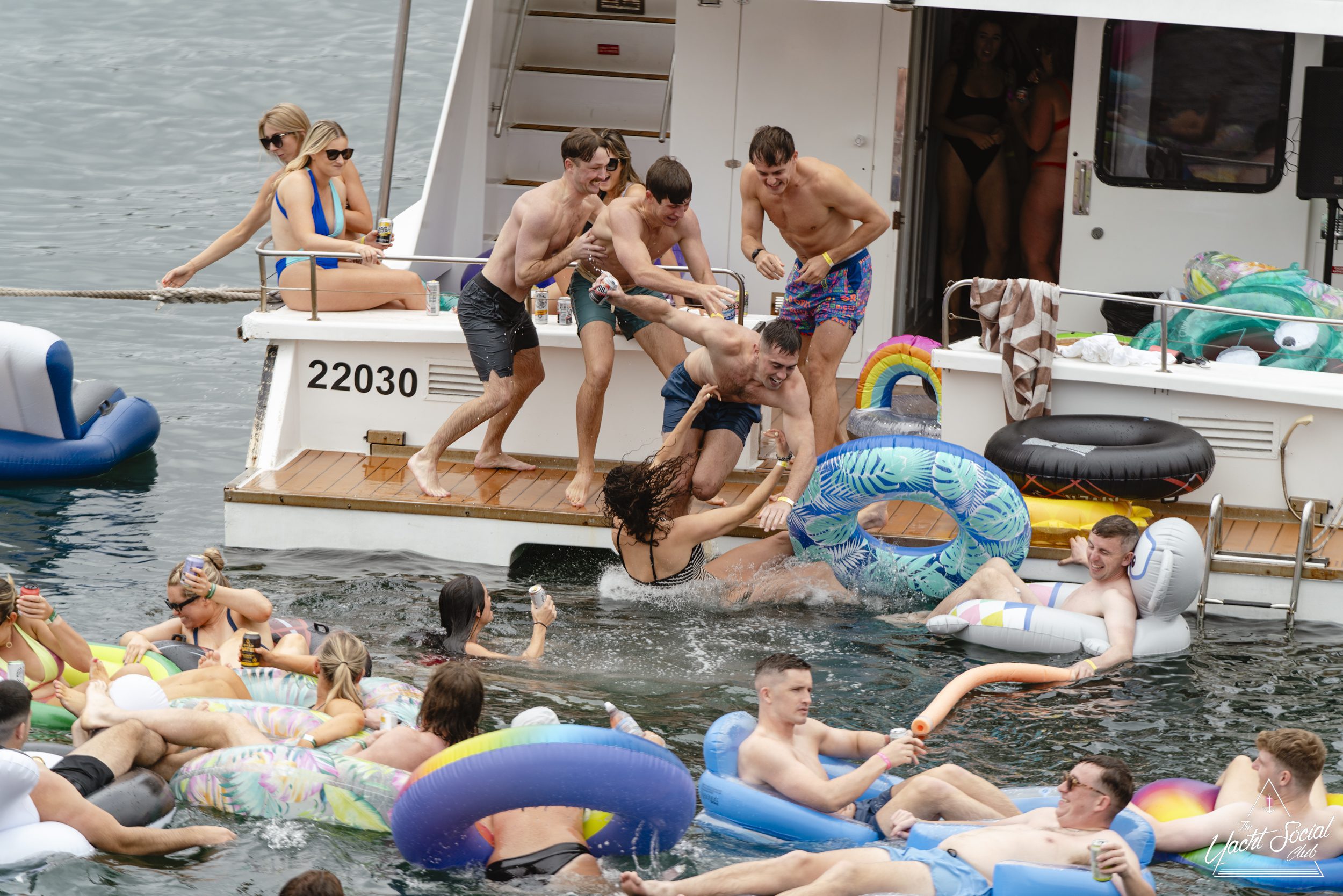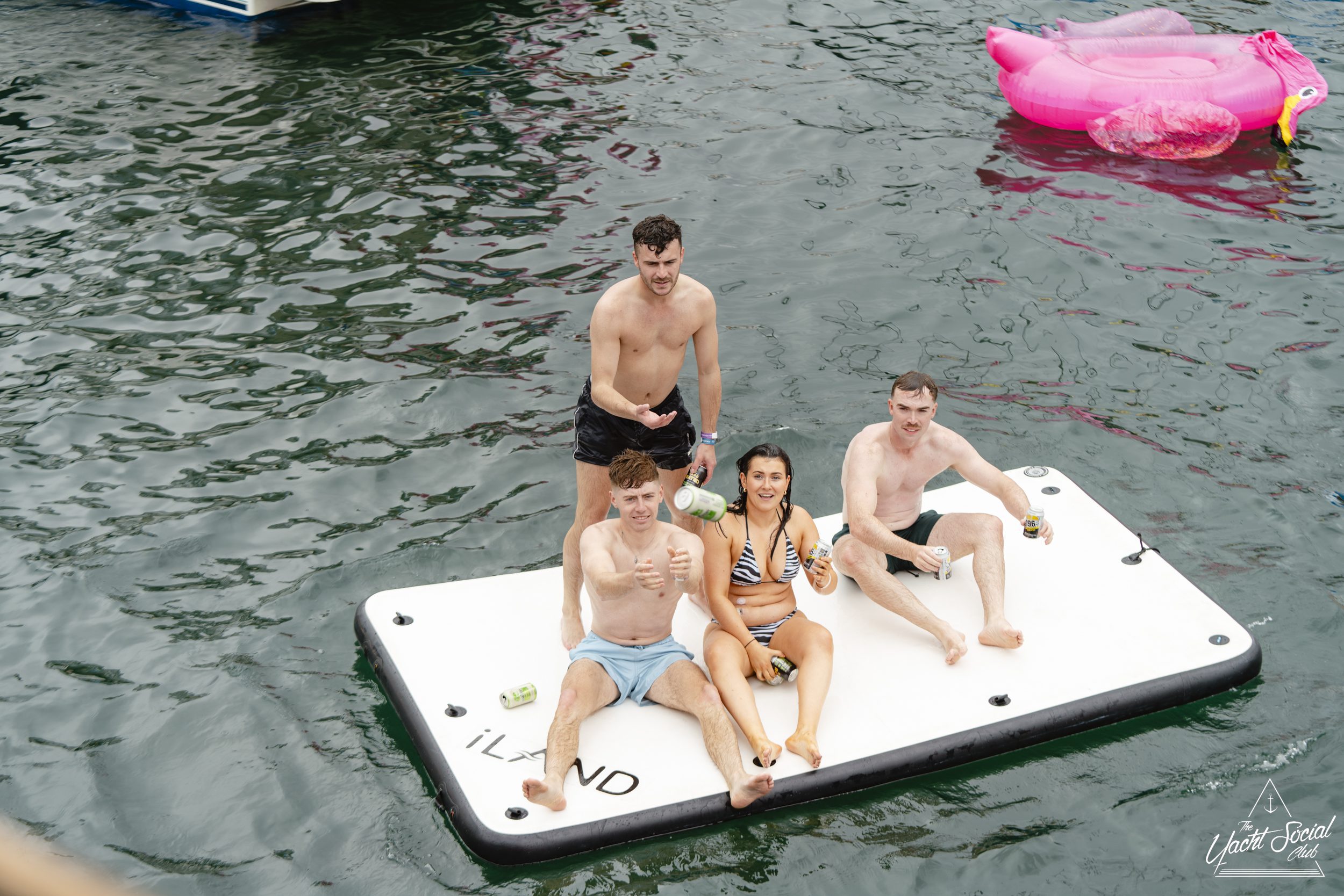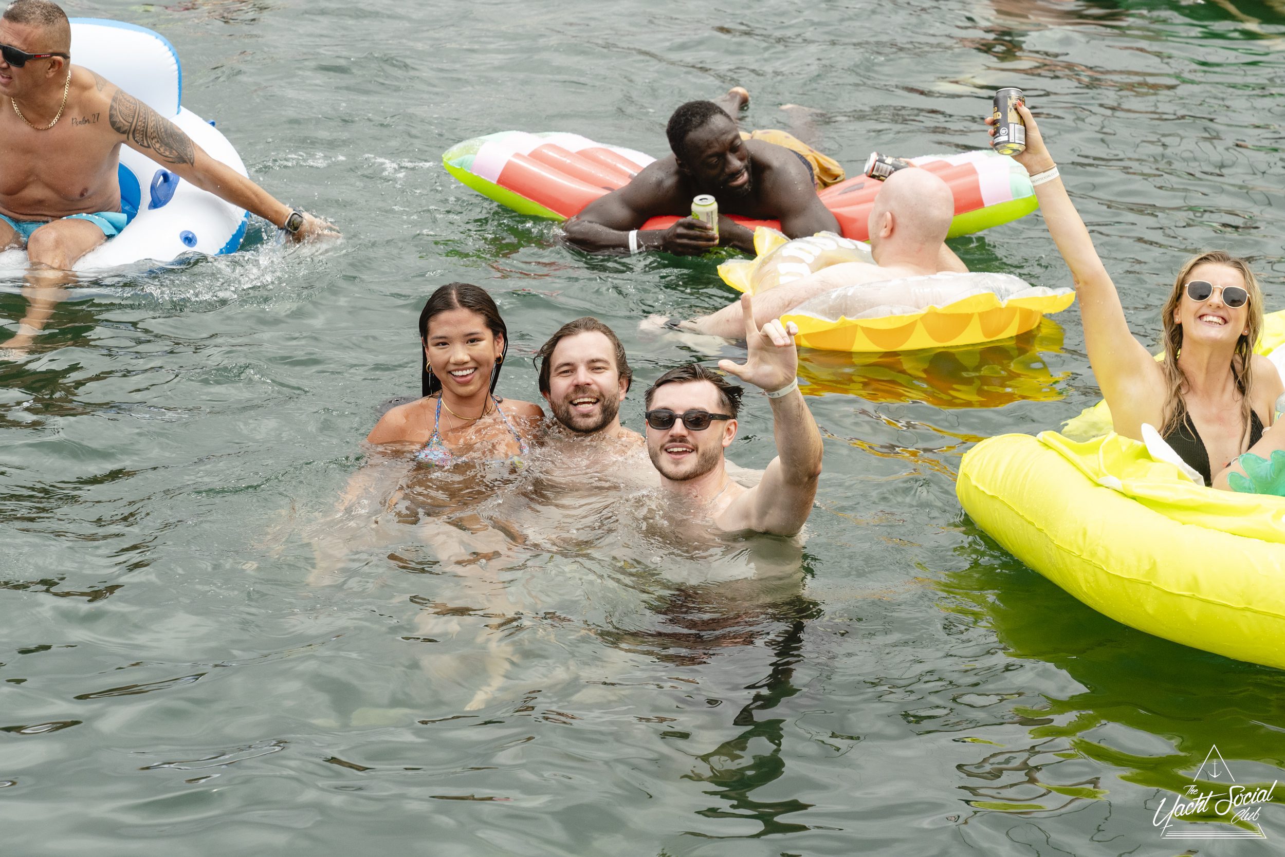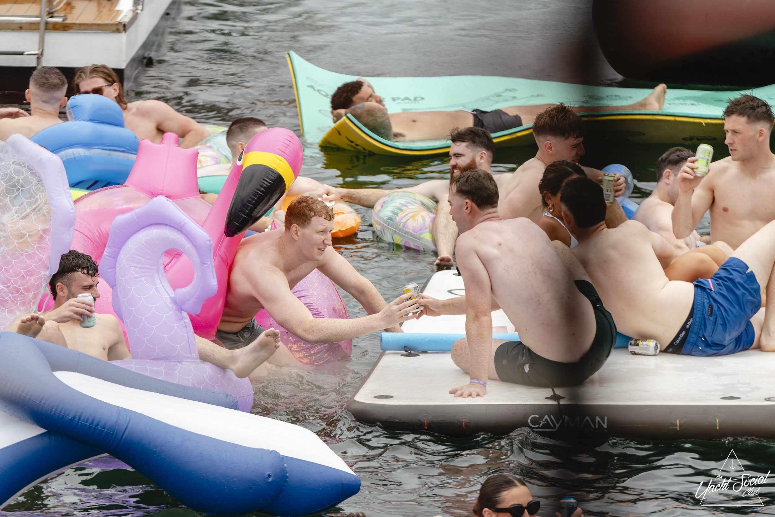 A group of people in swimwear stands on a boat, holding drinks and smiling. In the background, other boats and inflatables are visible on the water, with a city skyline under a cloudy sky.