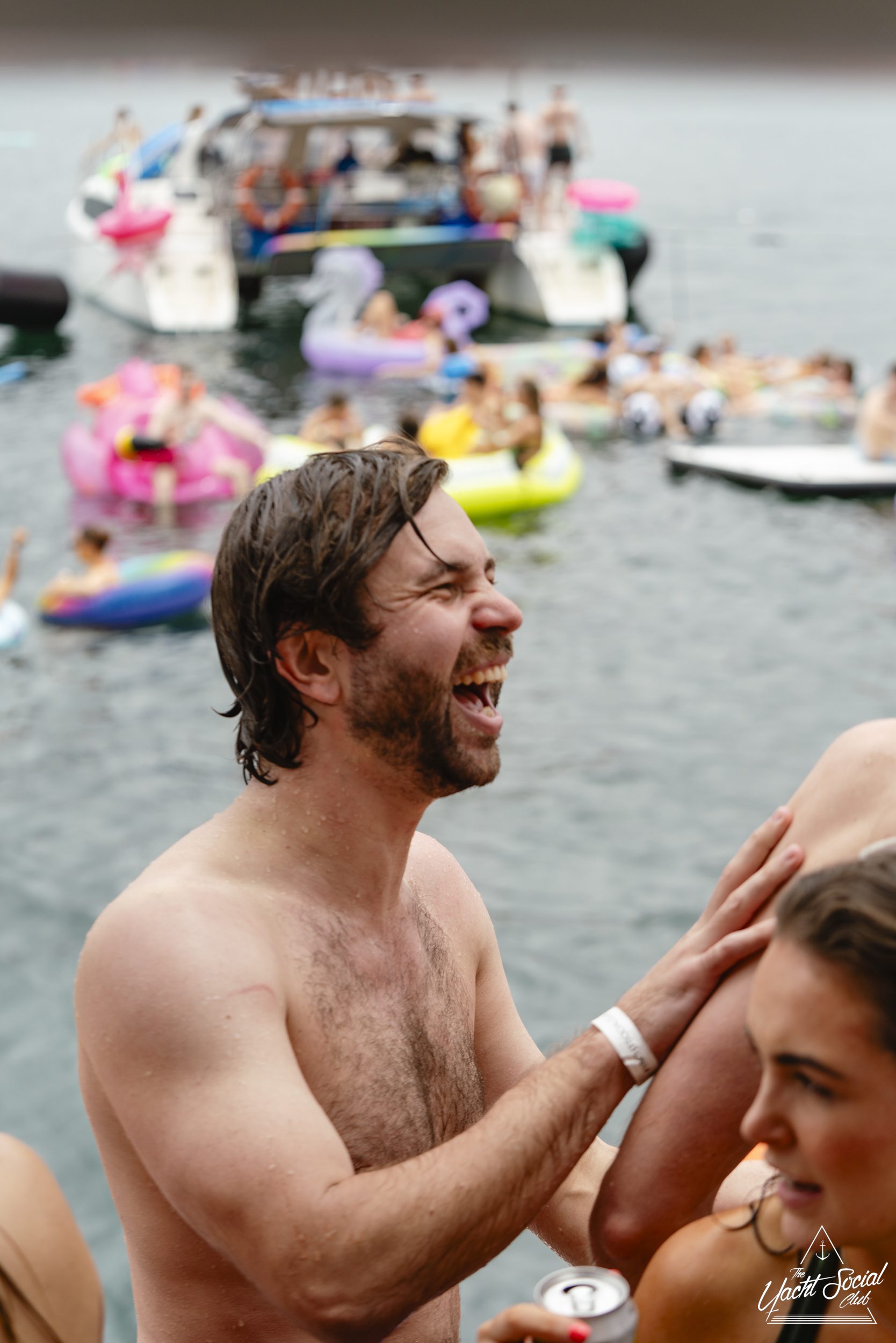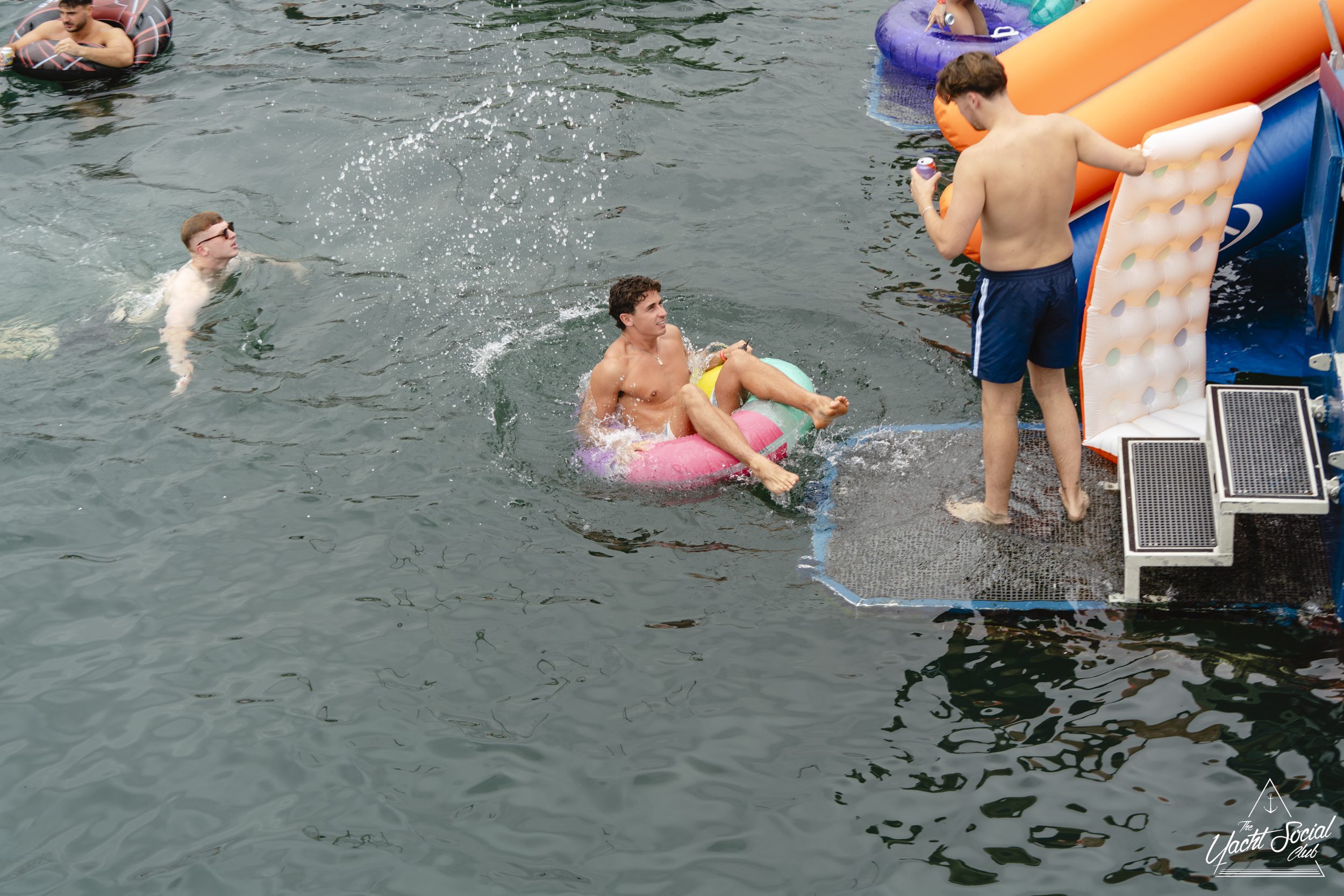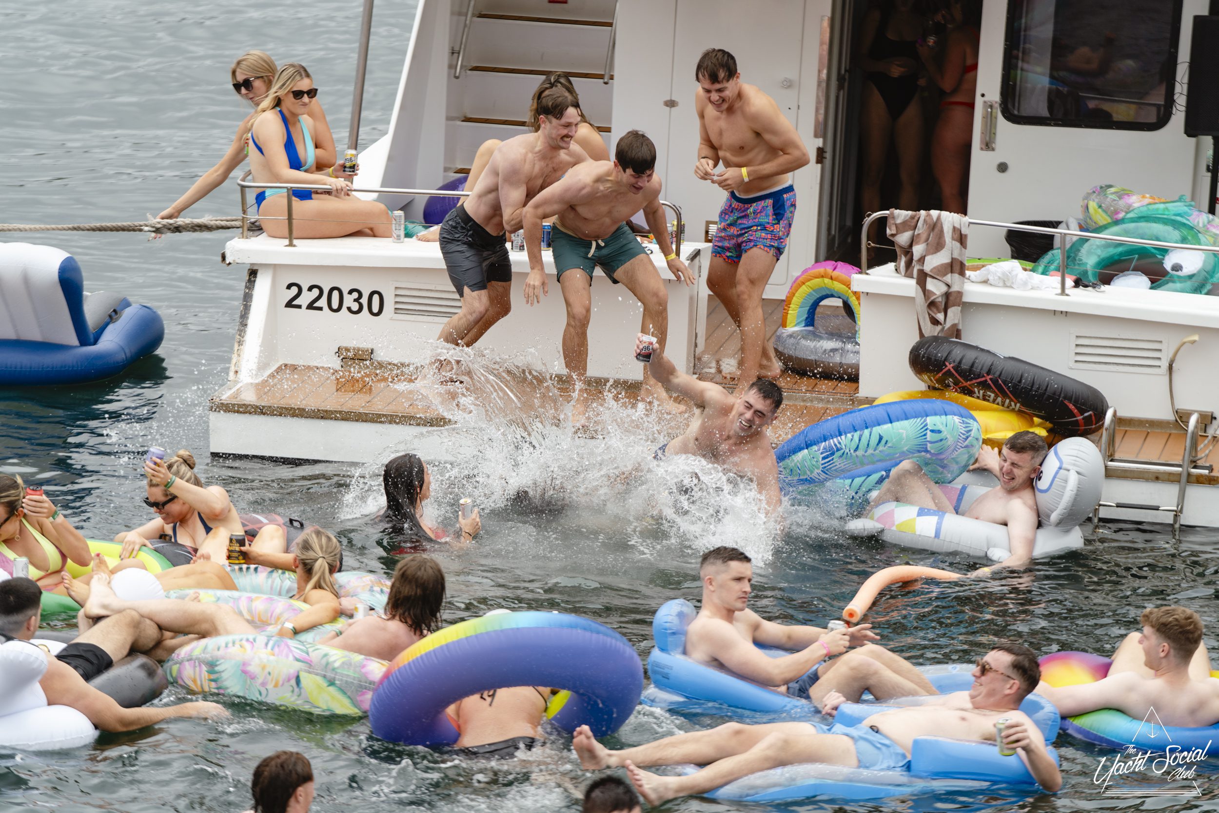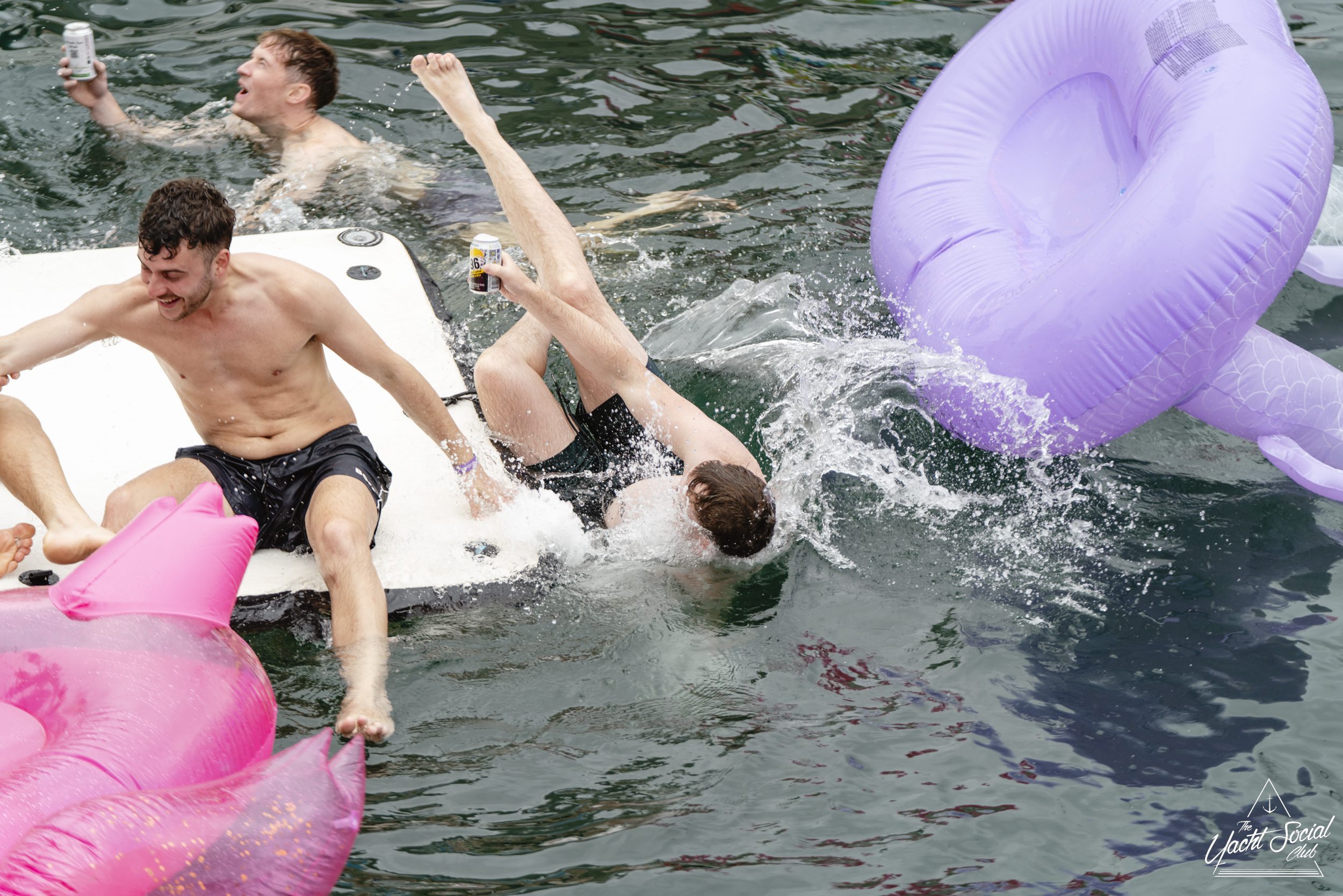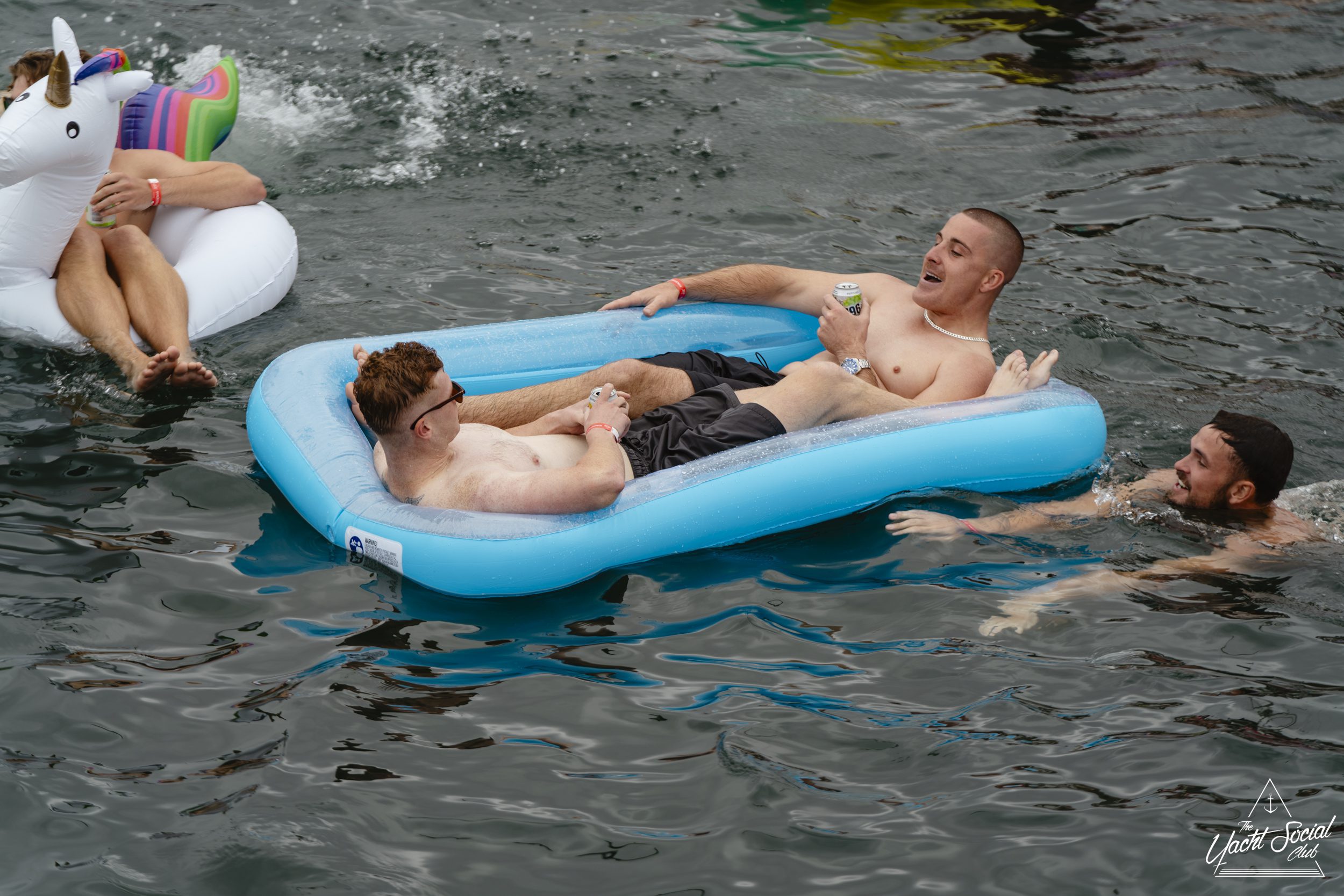 A group of people in swimwear stands on a boat, holding drinks and smiling. In the background, other boats and inflatables are visible on the water, with a city skyline under a cloudy sky.