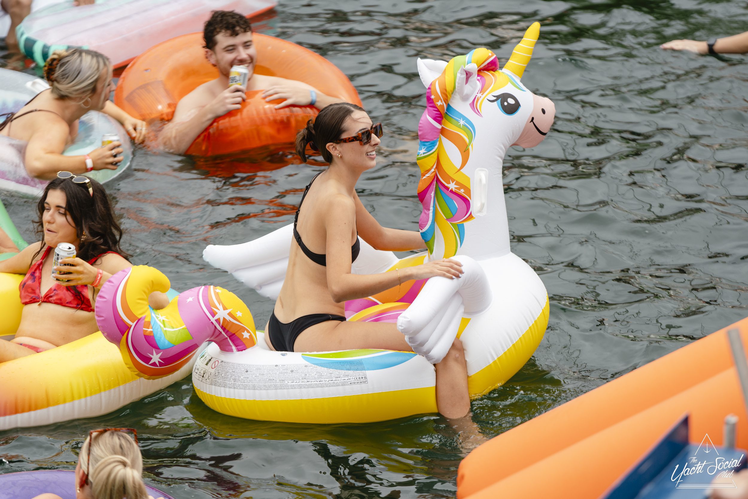 A group of people relax on inflatable rafts in the water near boats. One person is holding a drink while lounging on a unicorn-shaped float. The sky is cloudy, and others are seen socializing and enjoying the water.