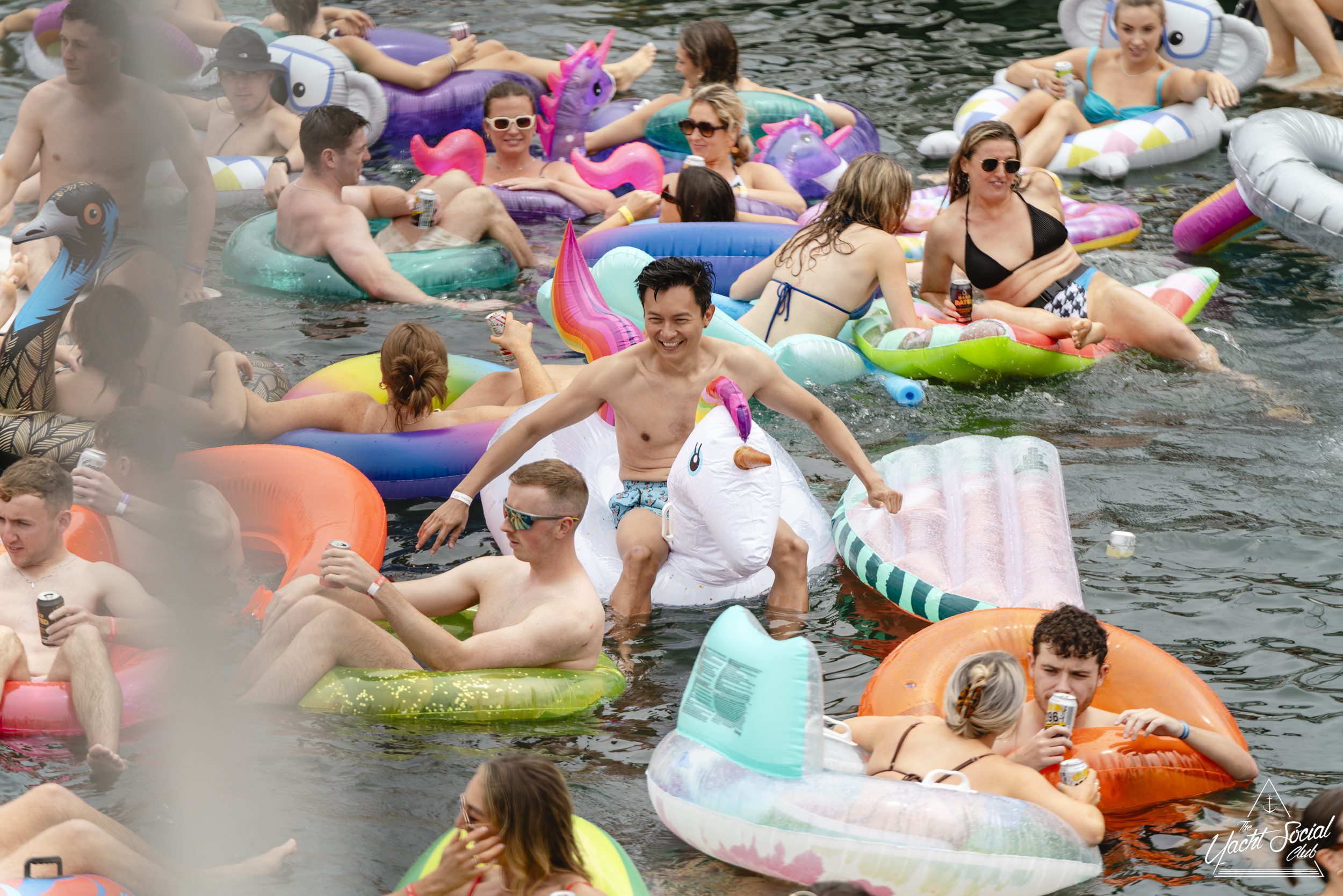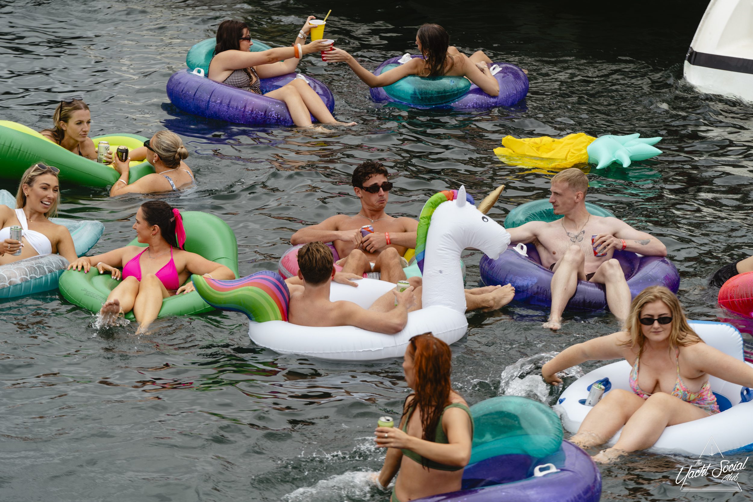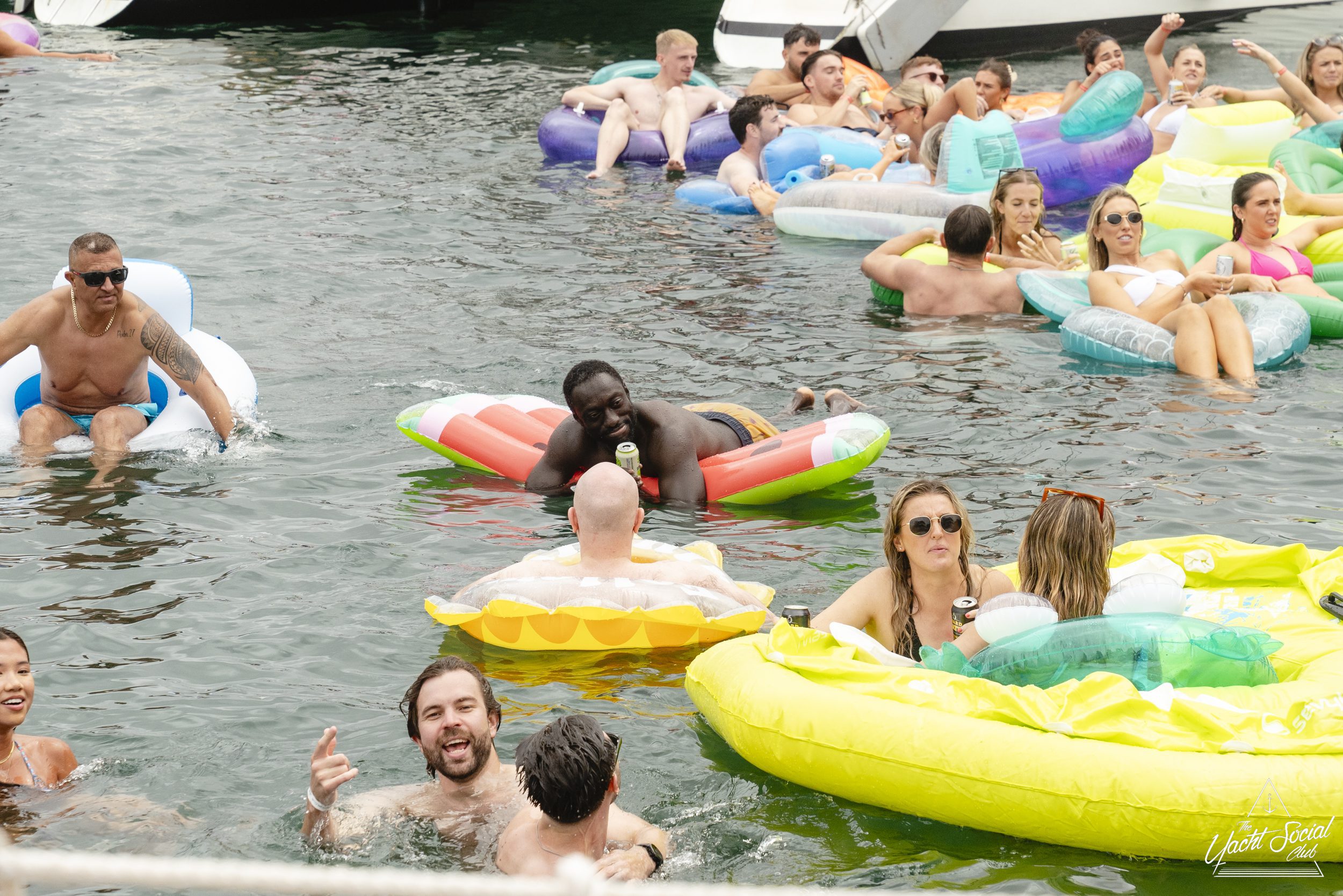 A large group of people enjoying a party on a boat and in the water, surrounded by colorful inflatable tubes and rafts. The sky is overcast, and the scene is lively with smiling attendees. The backdrop includes buildings and a marina.