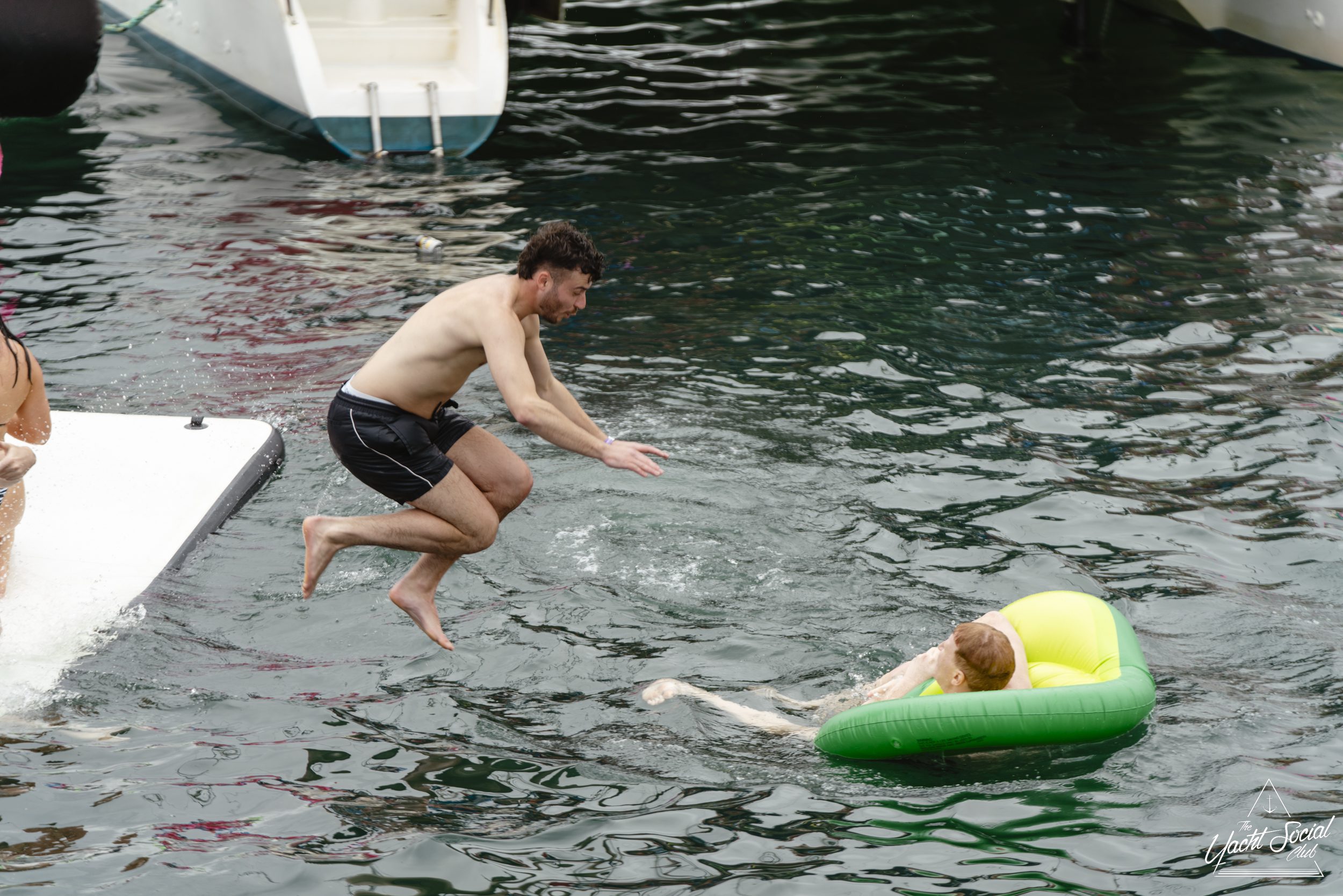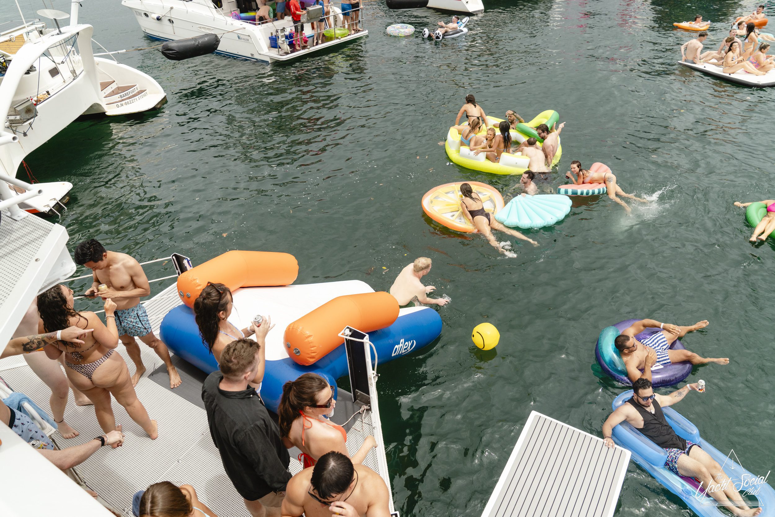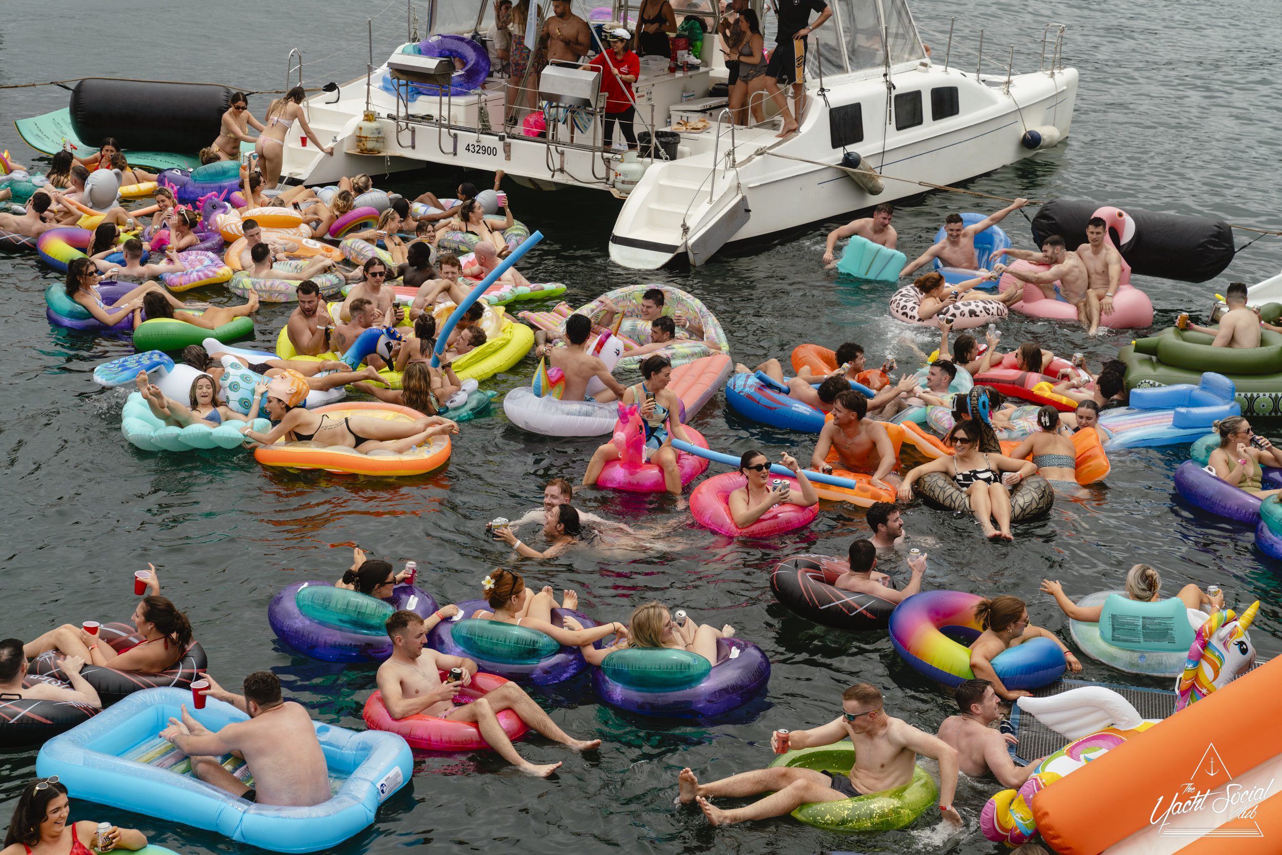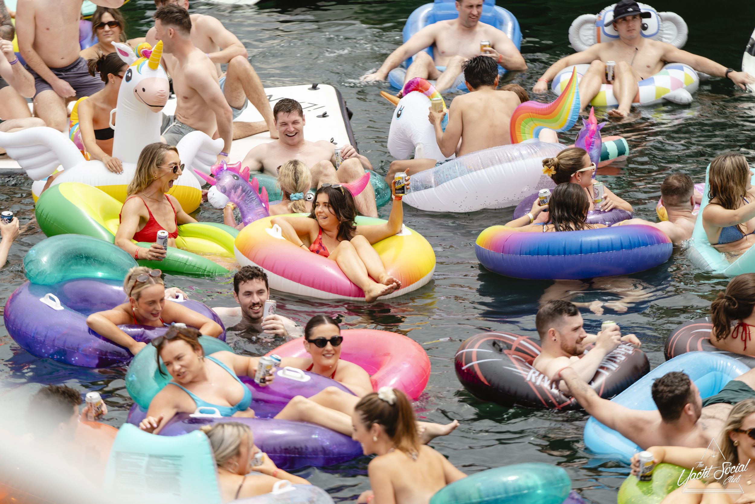 A large group of people enjoying a party on a boat and in the water, surrounded by colorful inflatable tubes and rafts. The sky is overcast, and the scene is lively with smiling attendees. The backdrop includes buildings and a marina.
