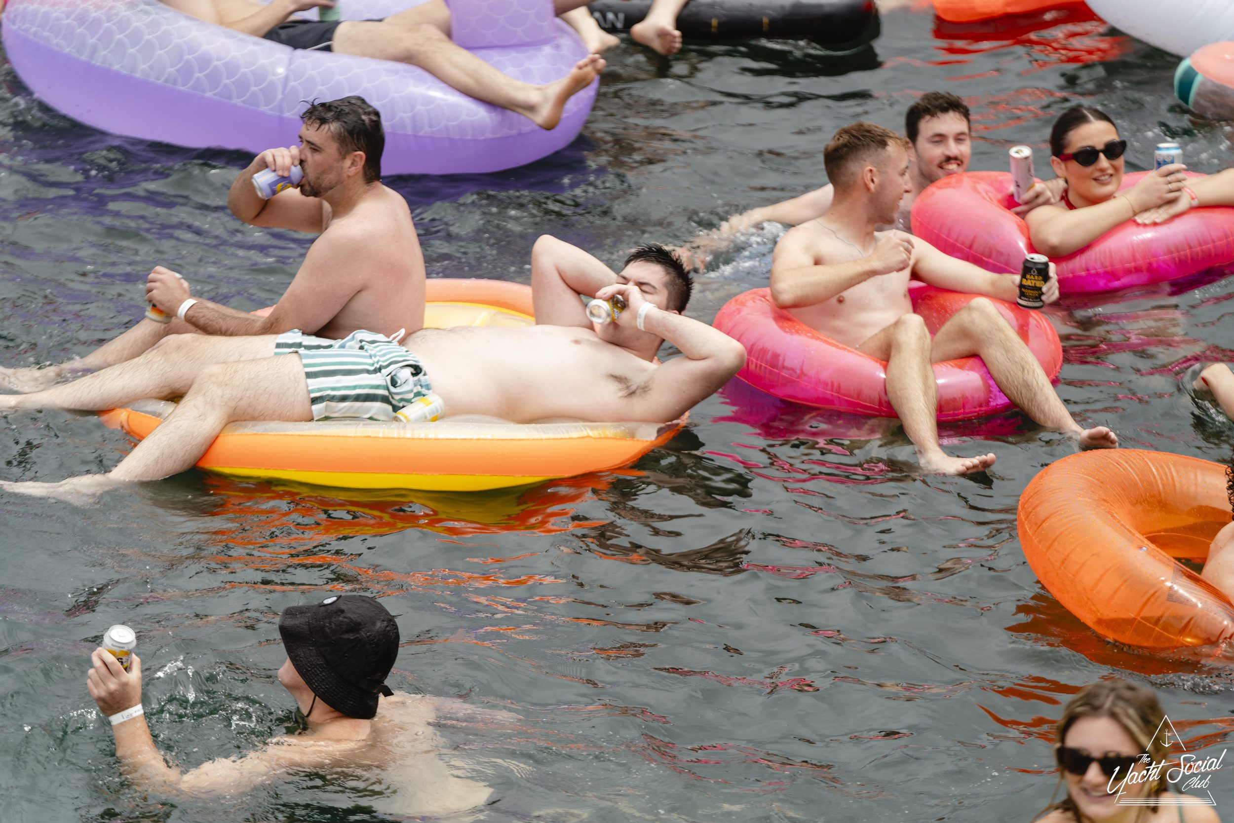 A group of people enjoying a day on the water, lounging on inflatable rafts. They are smiling and holding drinks, surrounded by boats. The atmosphere is relaxed and festive. Overcast skies set the backdrop.