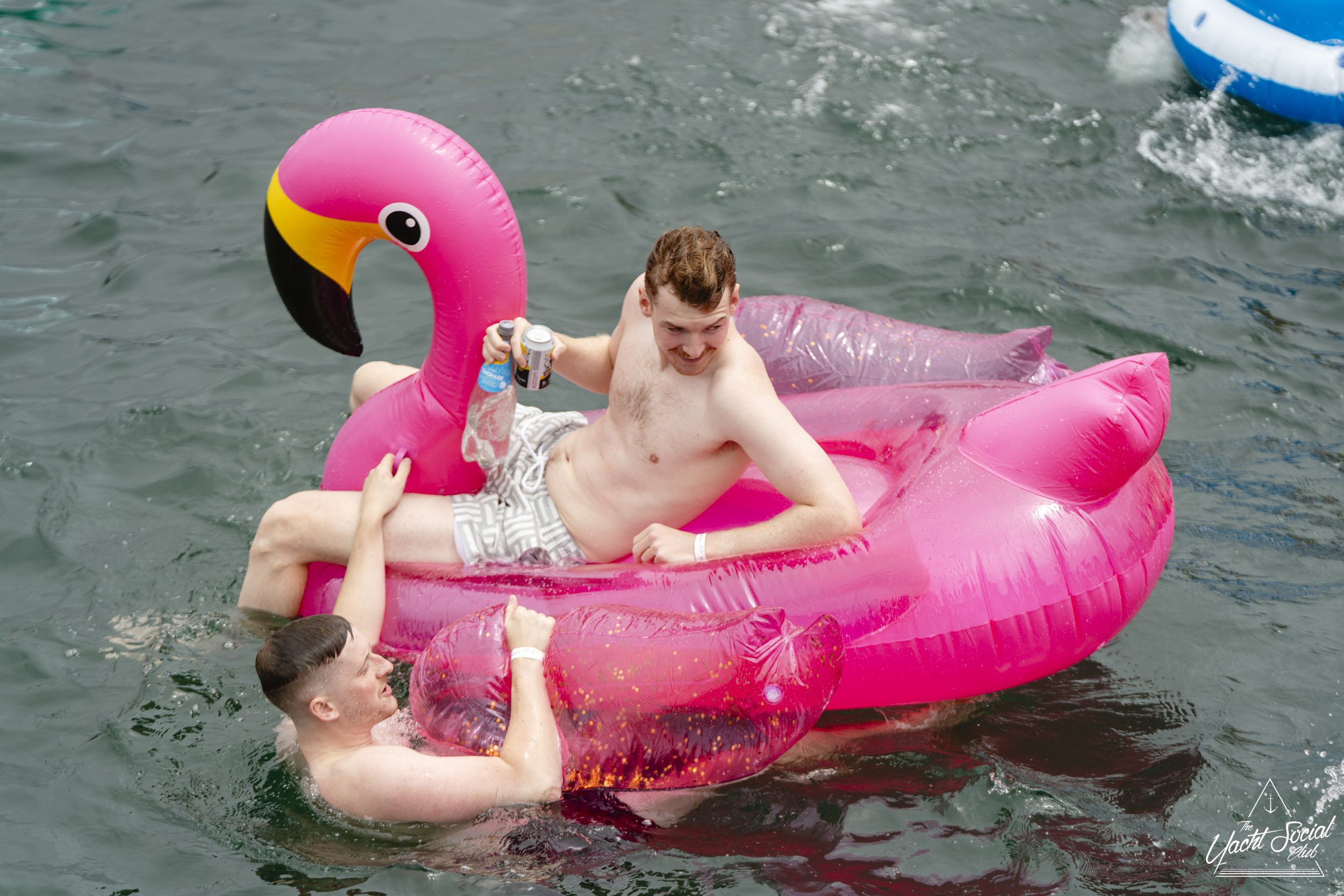 A man and woman relax on inflatable pool floats in the water, smiling and holding drinks. Behind them, a yacht with a large pink flamingo float and another boat are visible, along with partygoers. The scene is joyful and festive.