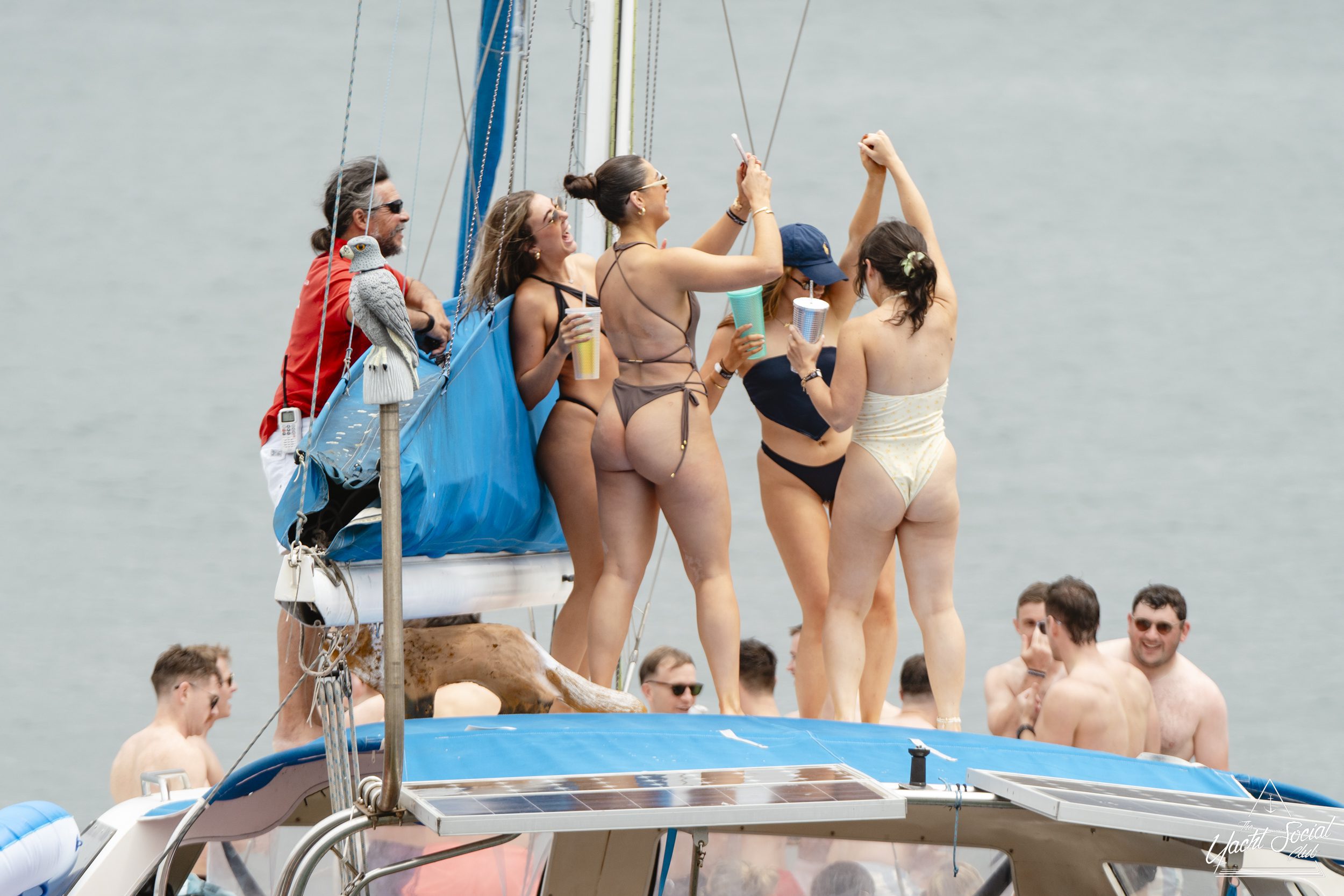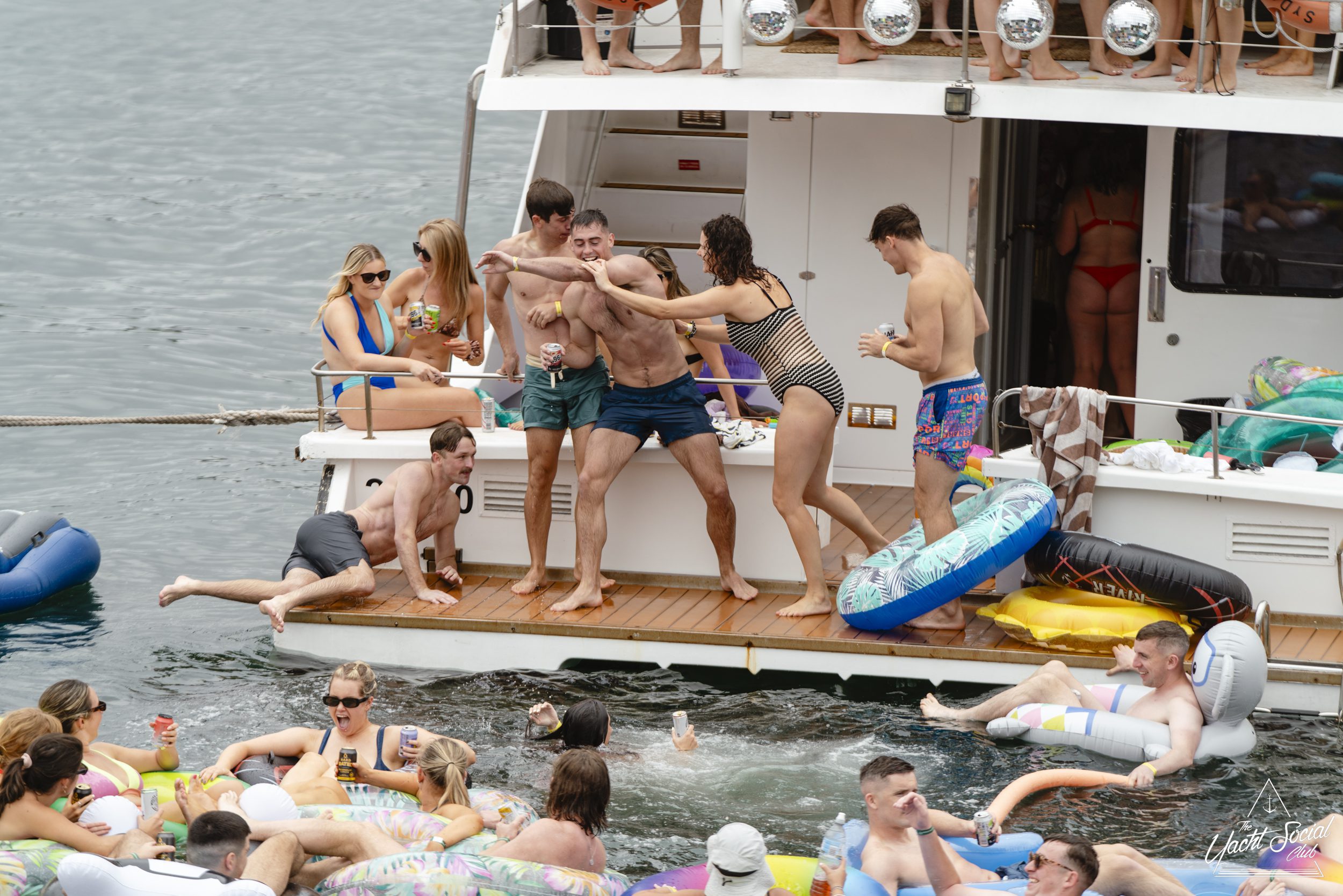 A lively scene on a boat with a crowd of people in swimsuits enjoying a party. Some are holding drinks, and others are socializing. Boats and inflatables are visible in the water nearby. The atmosphere is festive and relaxed.