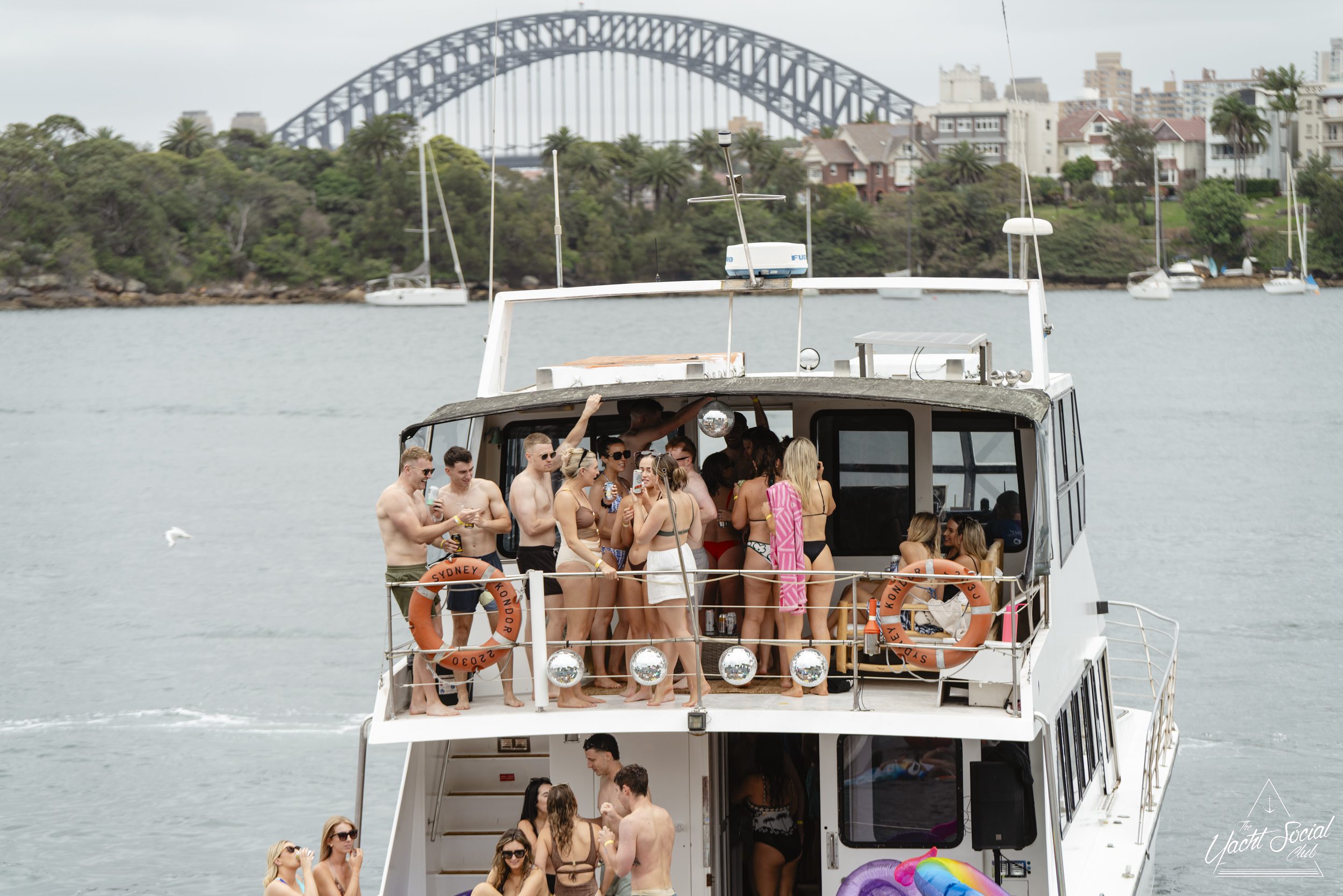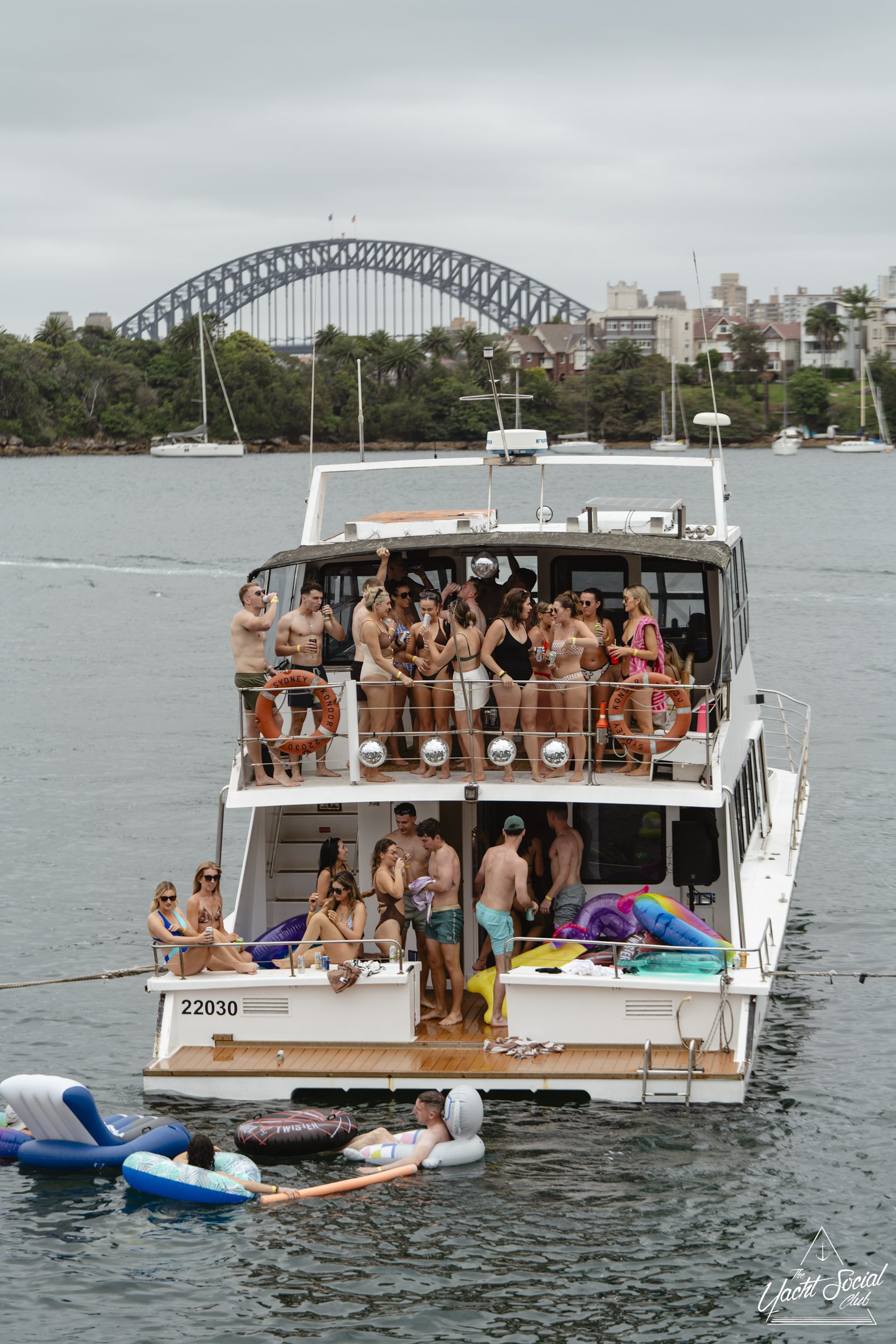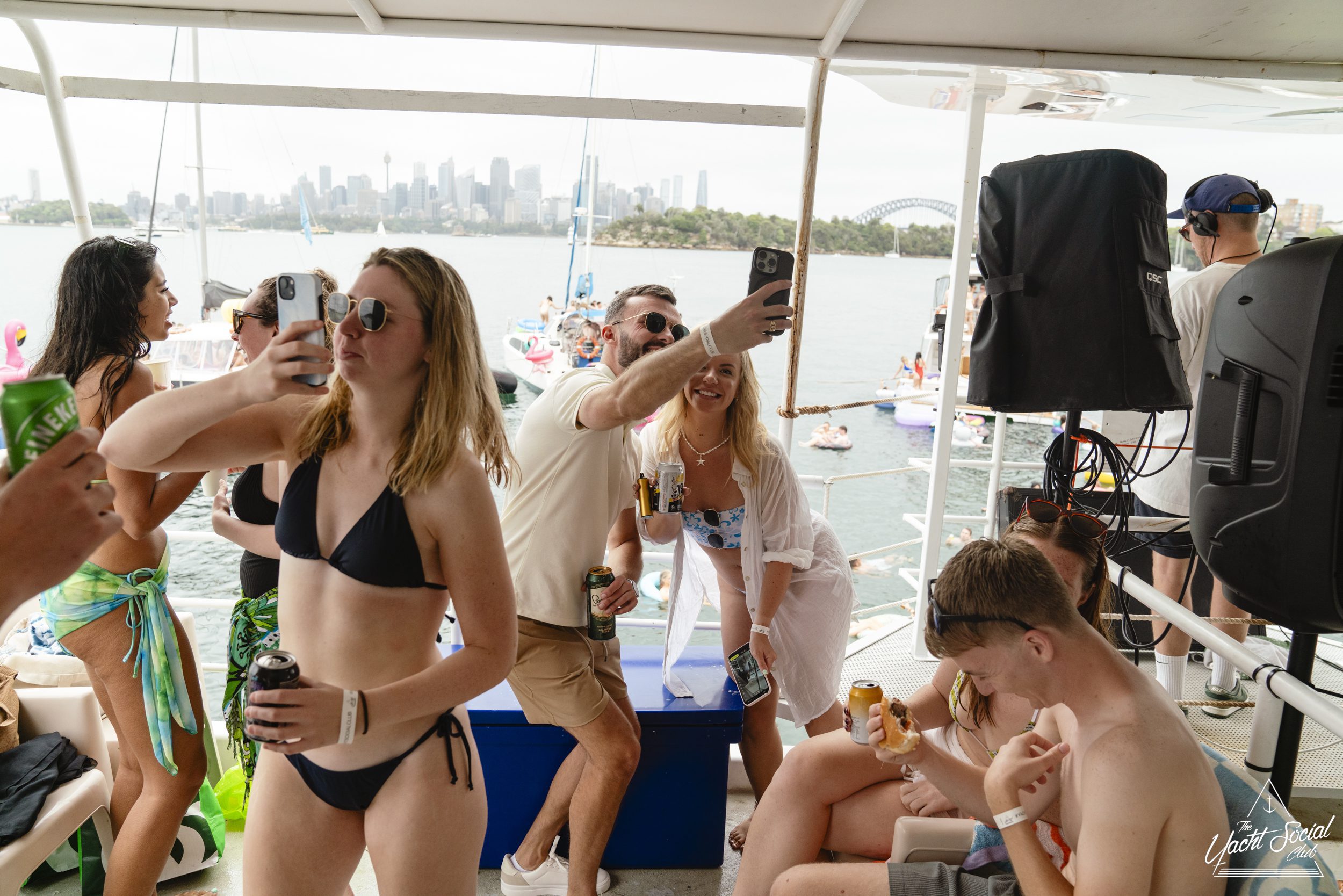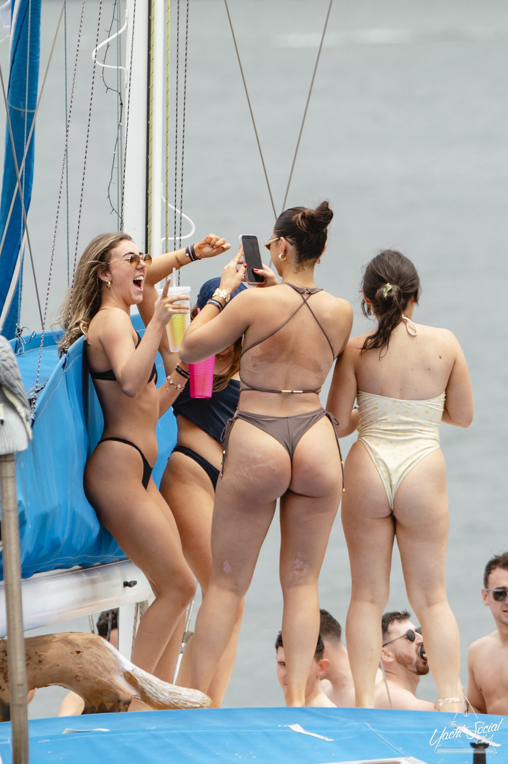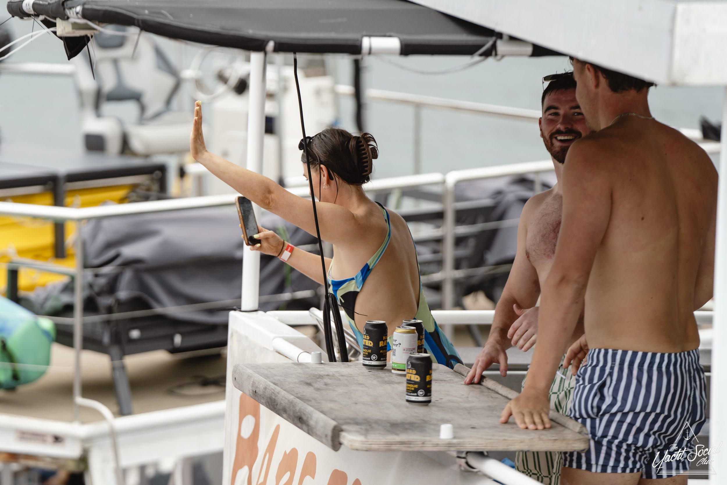 People on a boat enjoying a party; two women in swimwear take a selfie, surrounded by others holding drinks. There are inflatable items and a yacht in the background.