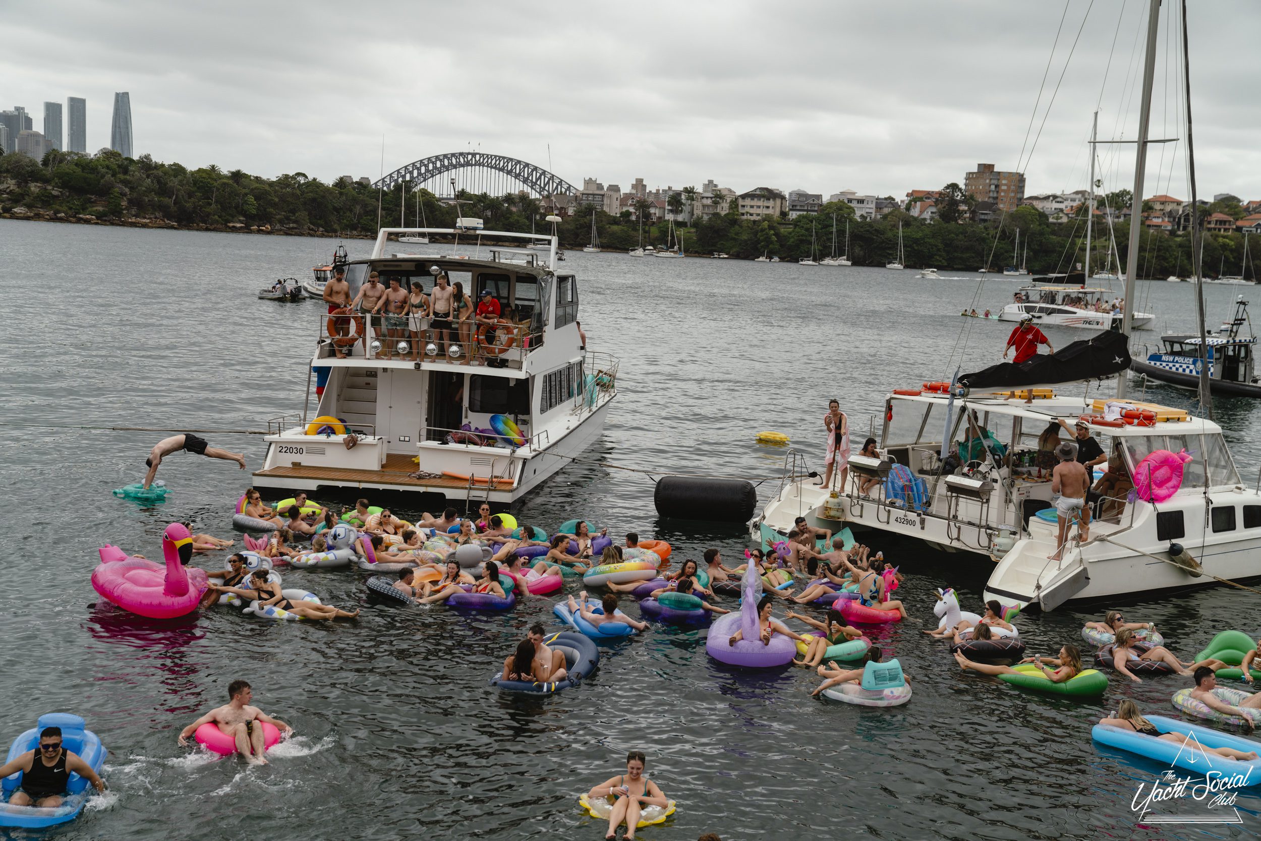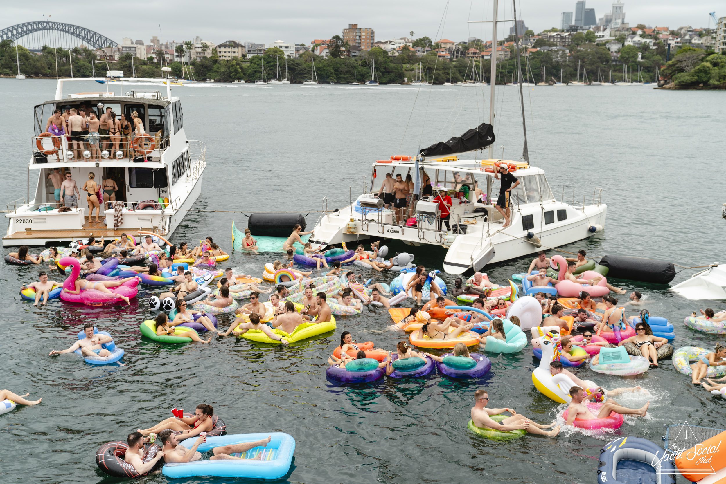 A lively scene of people enjoying a boat party in a harbor. Dozens of individuals are floating on colorful inflatables near two anchored boats, with a city skyline and bridge visible in the background. The atmosphere is fun and festive.