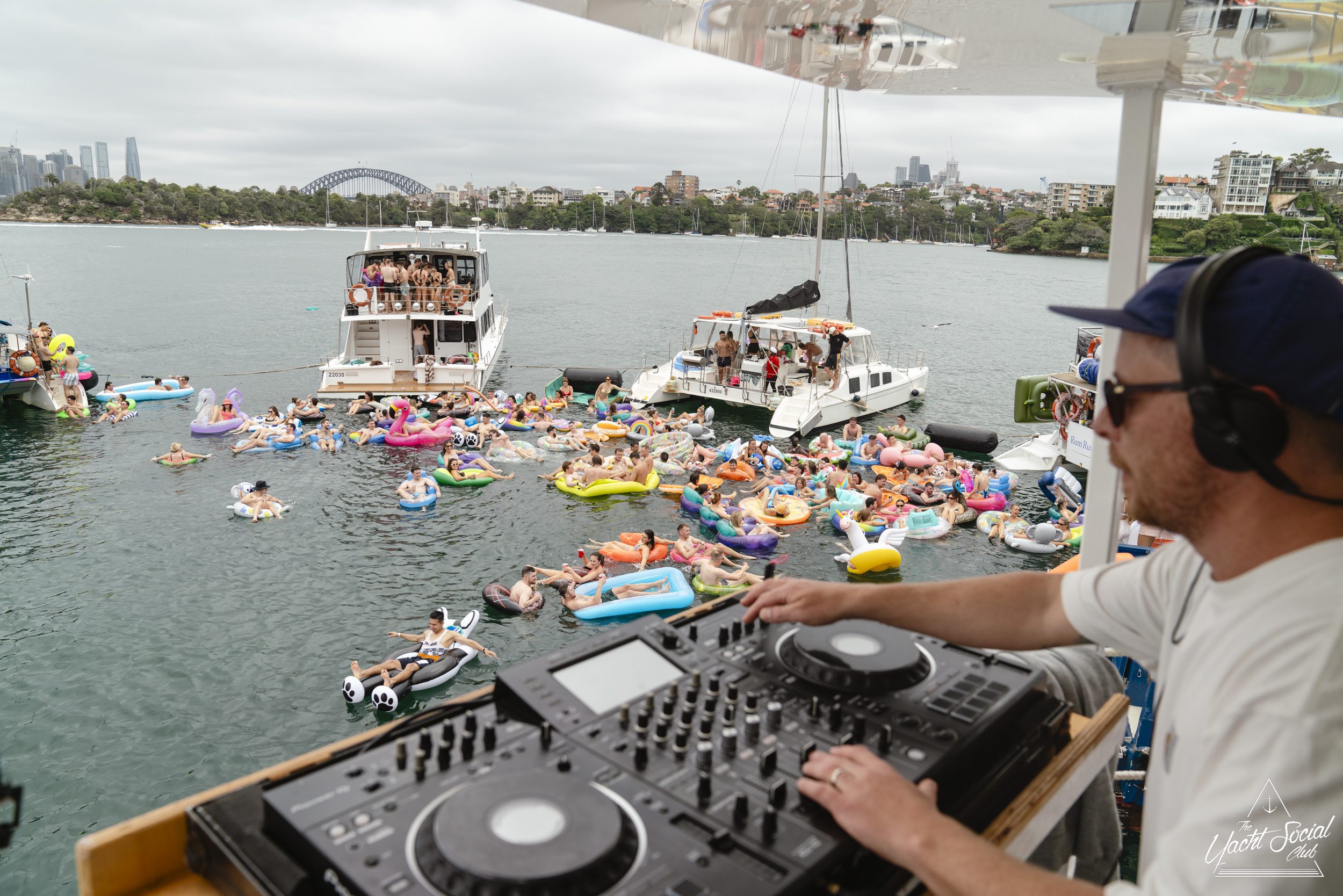 A DJ stands at a console on a boat overlooking a vibrant outdoor party. Dozens of people are floating on colorful inflatables in a body of water, surrounded by other boats and a city skyline in the background. The atmosphere is festive and lively.