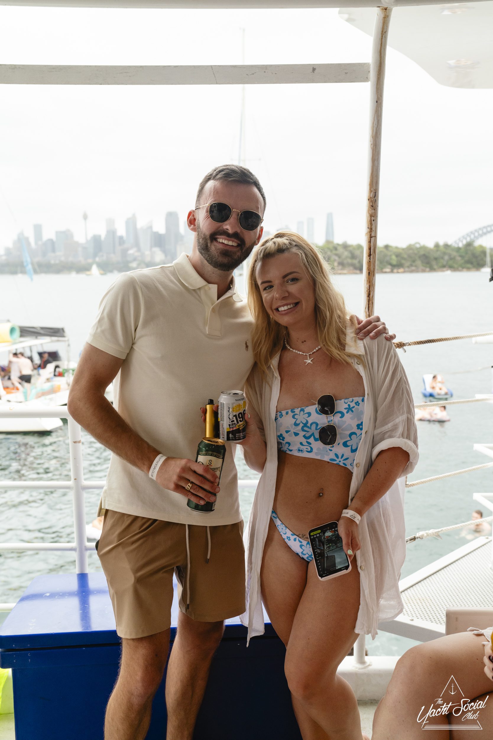 A man and a woman smiling on a boat deck, both in swimwear. The woman holds a phone, and the man holds a drink. In the background, other people are on a nearby boat with greenery and water visible.