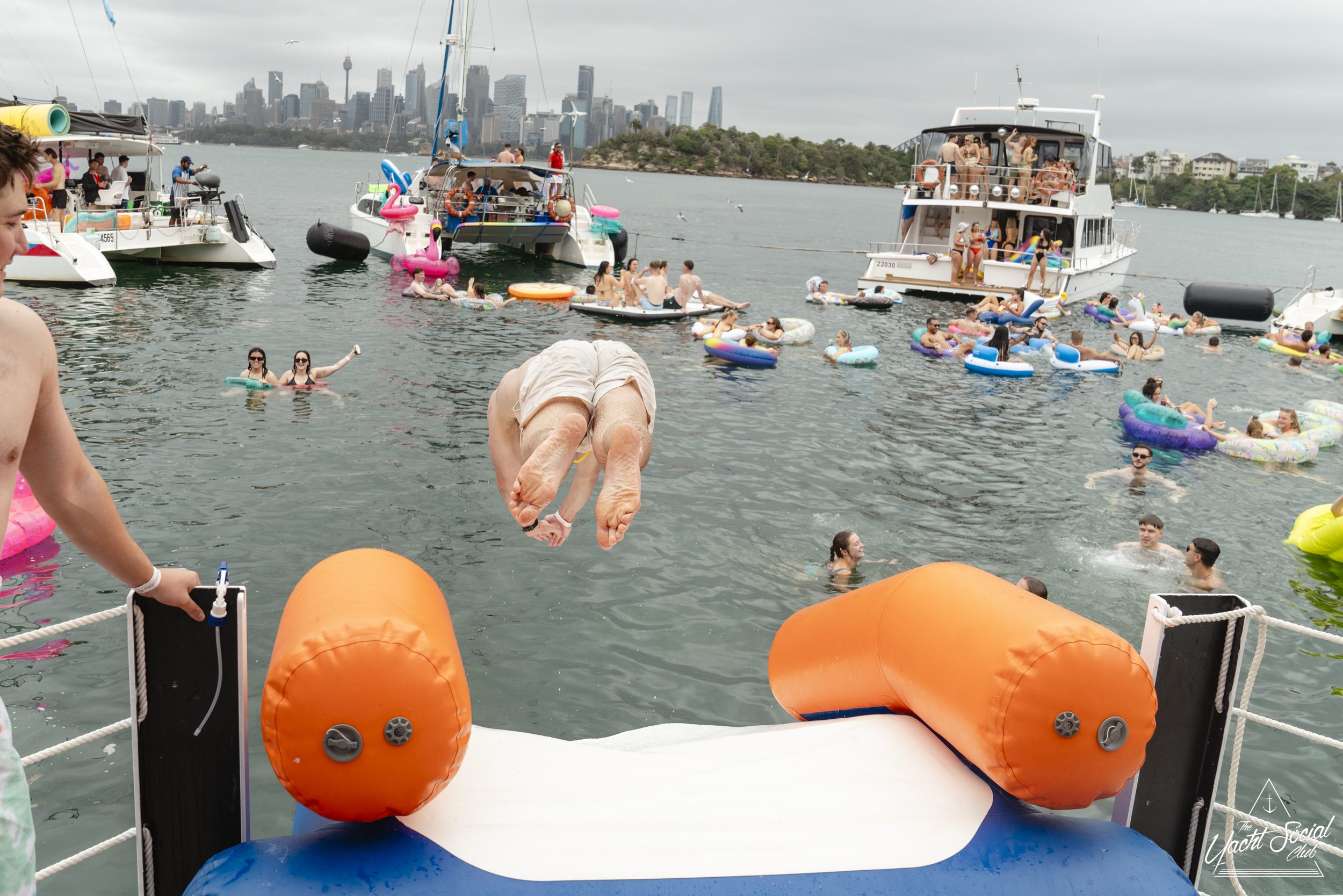 A group of people enjoy a boat party, with some standing on decks, others using an inflatable water slide, and several swimming. A person is captured mid-dive. A seagull flies overhead, and trees are visible in the background.