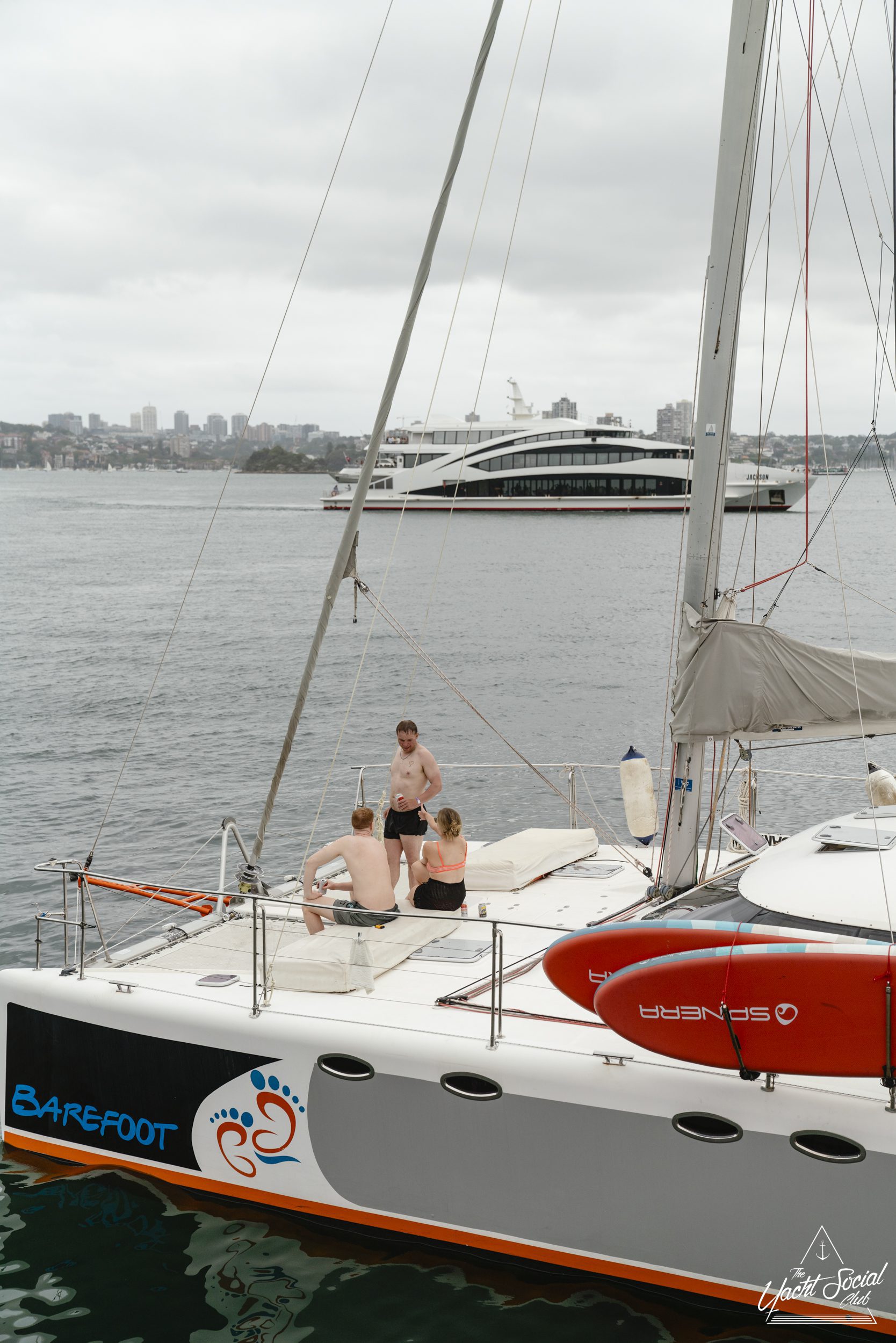 Three people sit and relax on the deck of a sailboat named Barefoot, anchored in calm waters. The city skyline and another large boat are visible in the background under a cloudy sky.