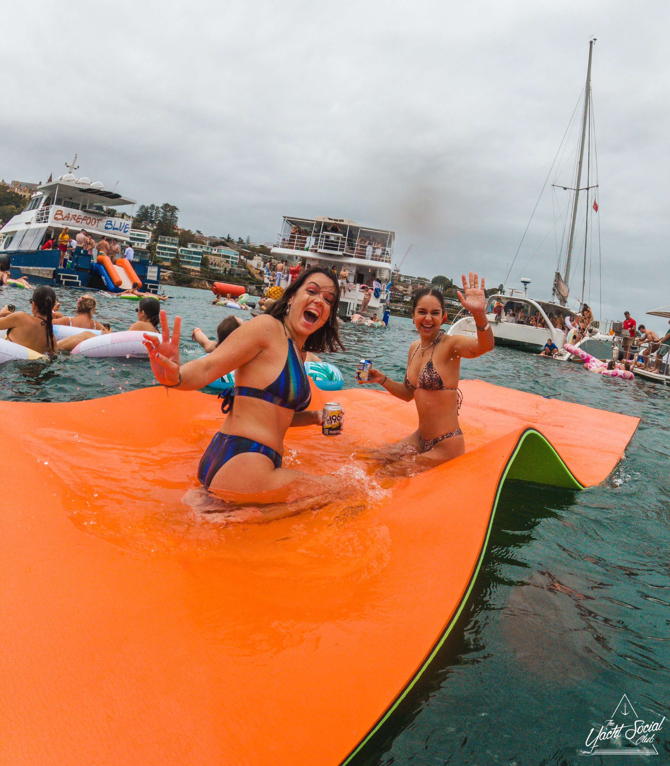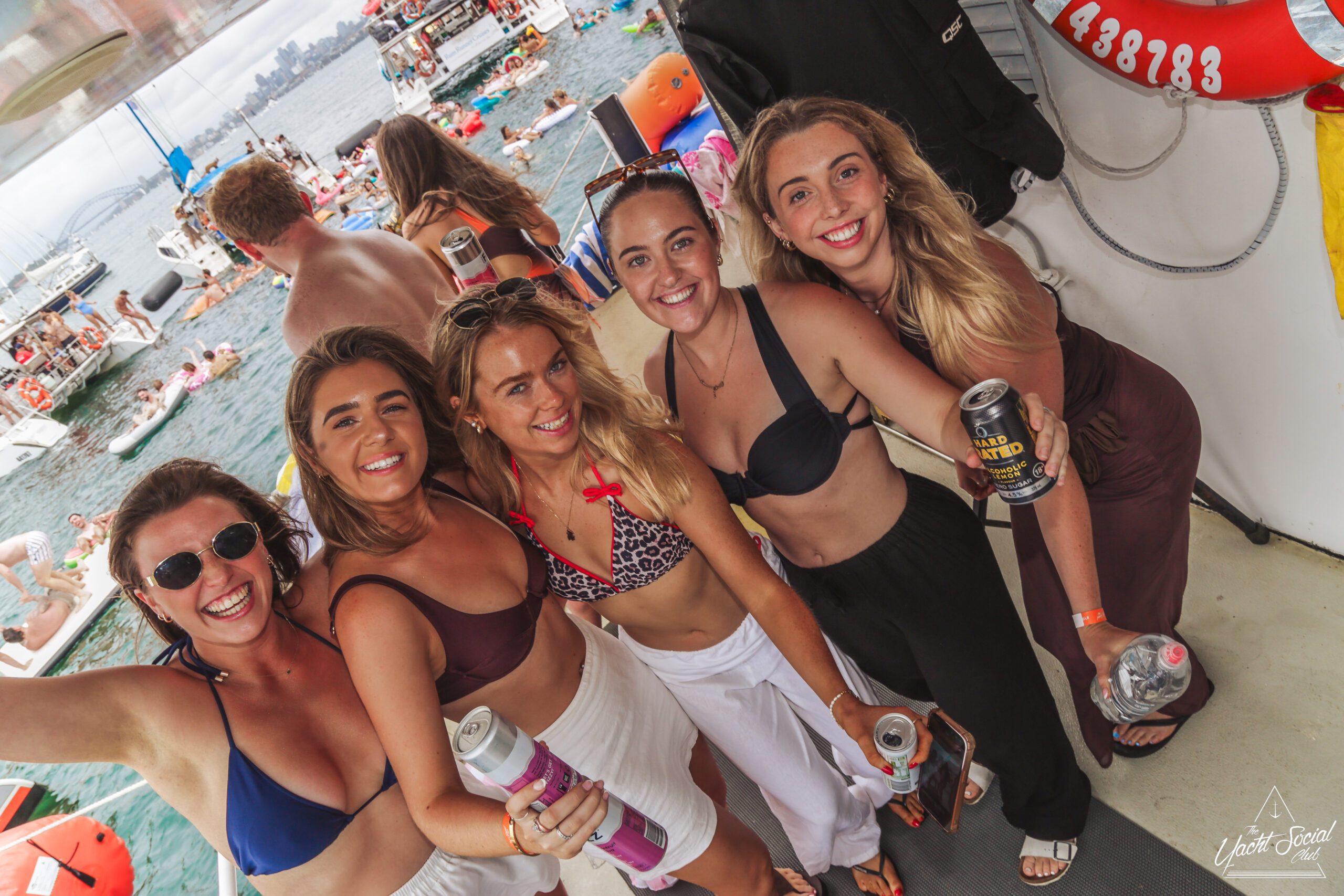 A group of five young women in swimsuits smile at the camera, holding cans of drinks. Behind them, many people are partying on a docked boat and in the water, with inflatable floats and a festive atmosphere.