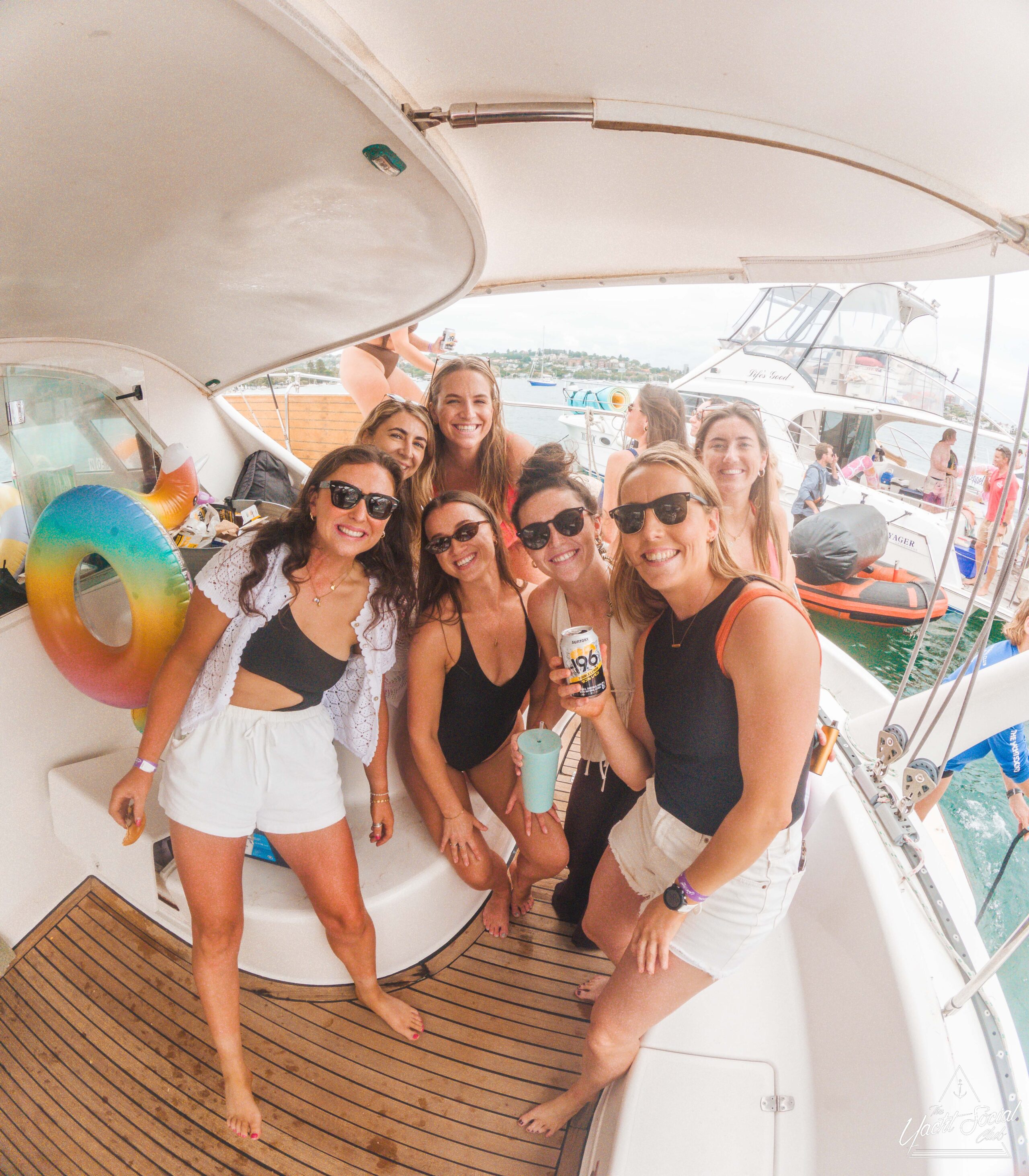 A group of seven smiling women in summer outfits pose together on a boat, with water, another boat, and other people in the background. A colorful inflatable ring hangs on the side, and several women are holding drinks.