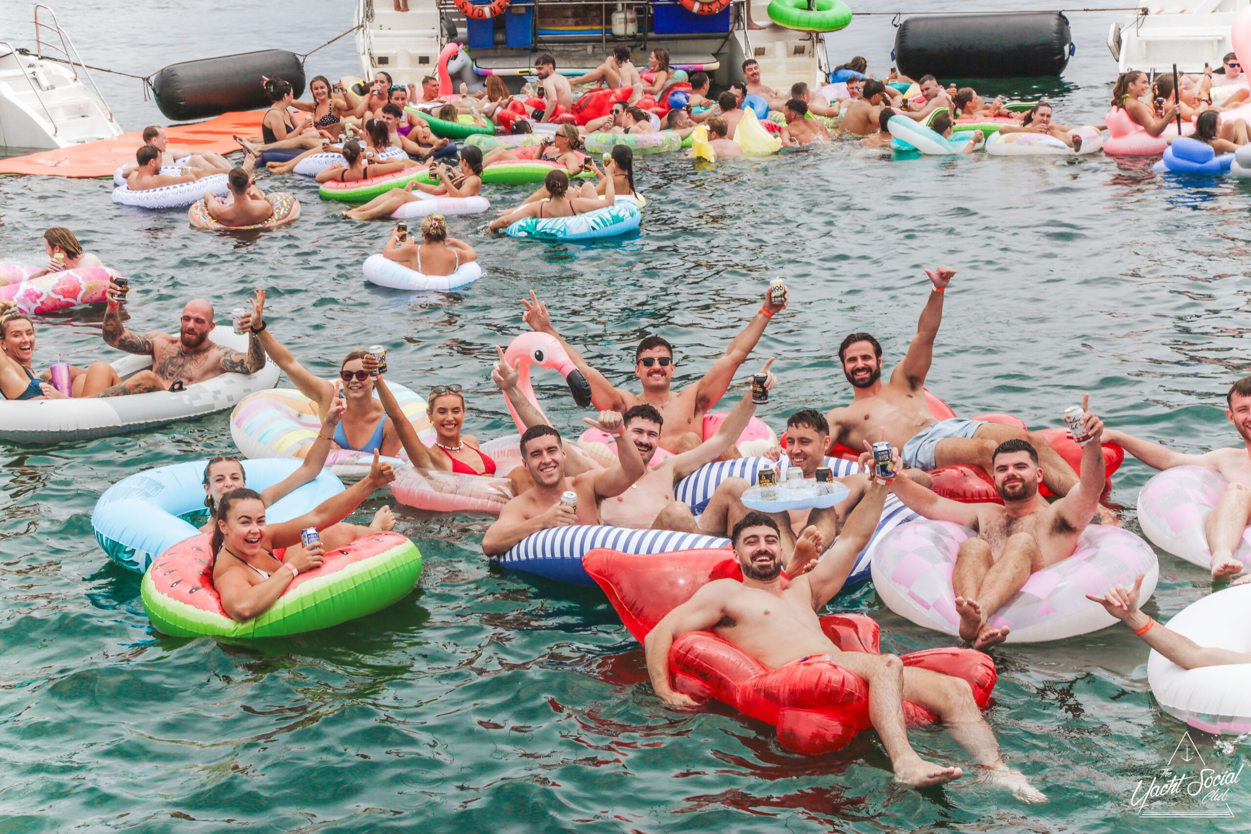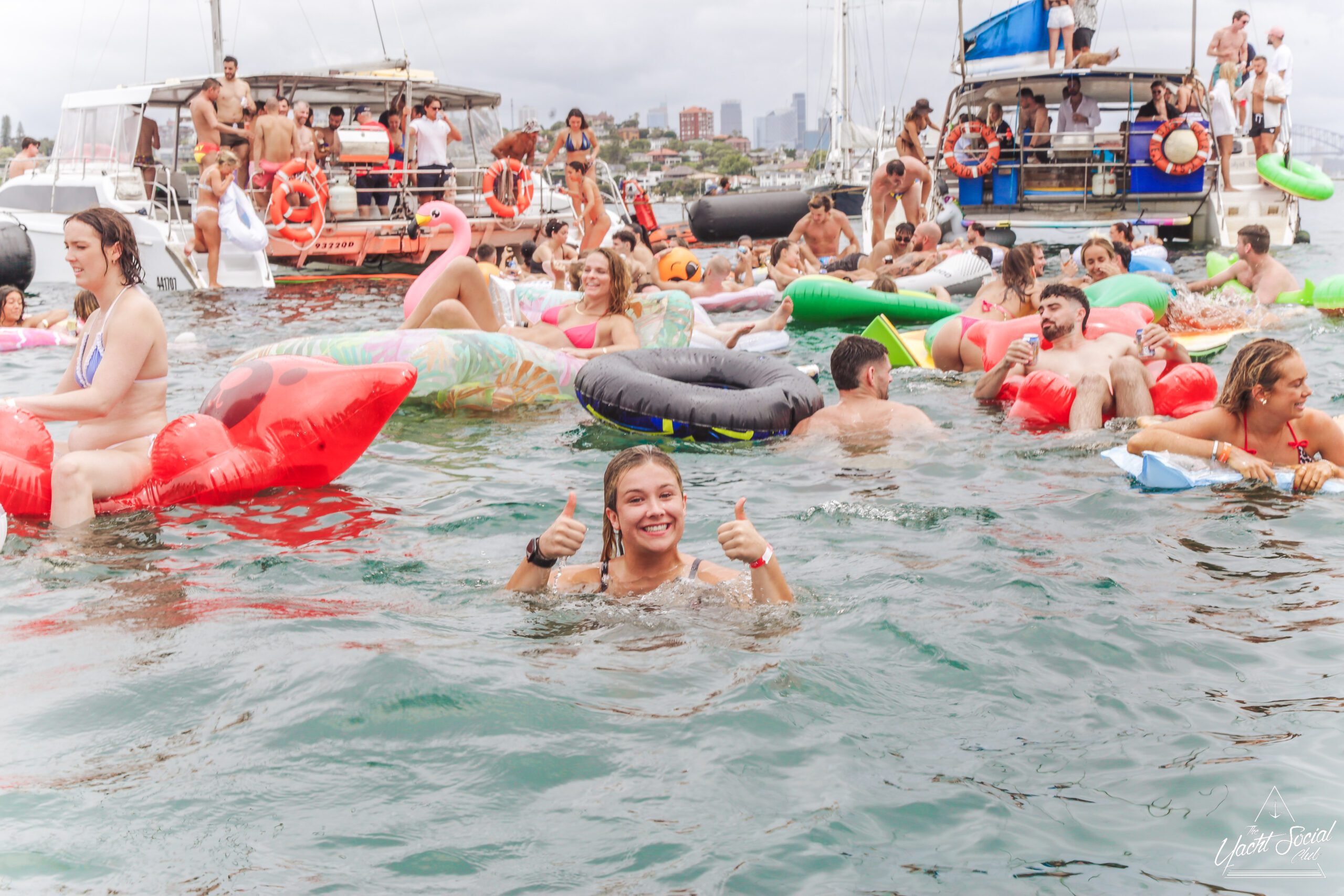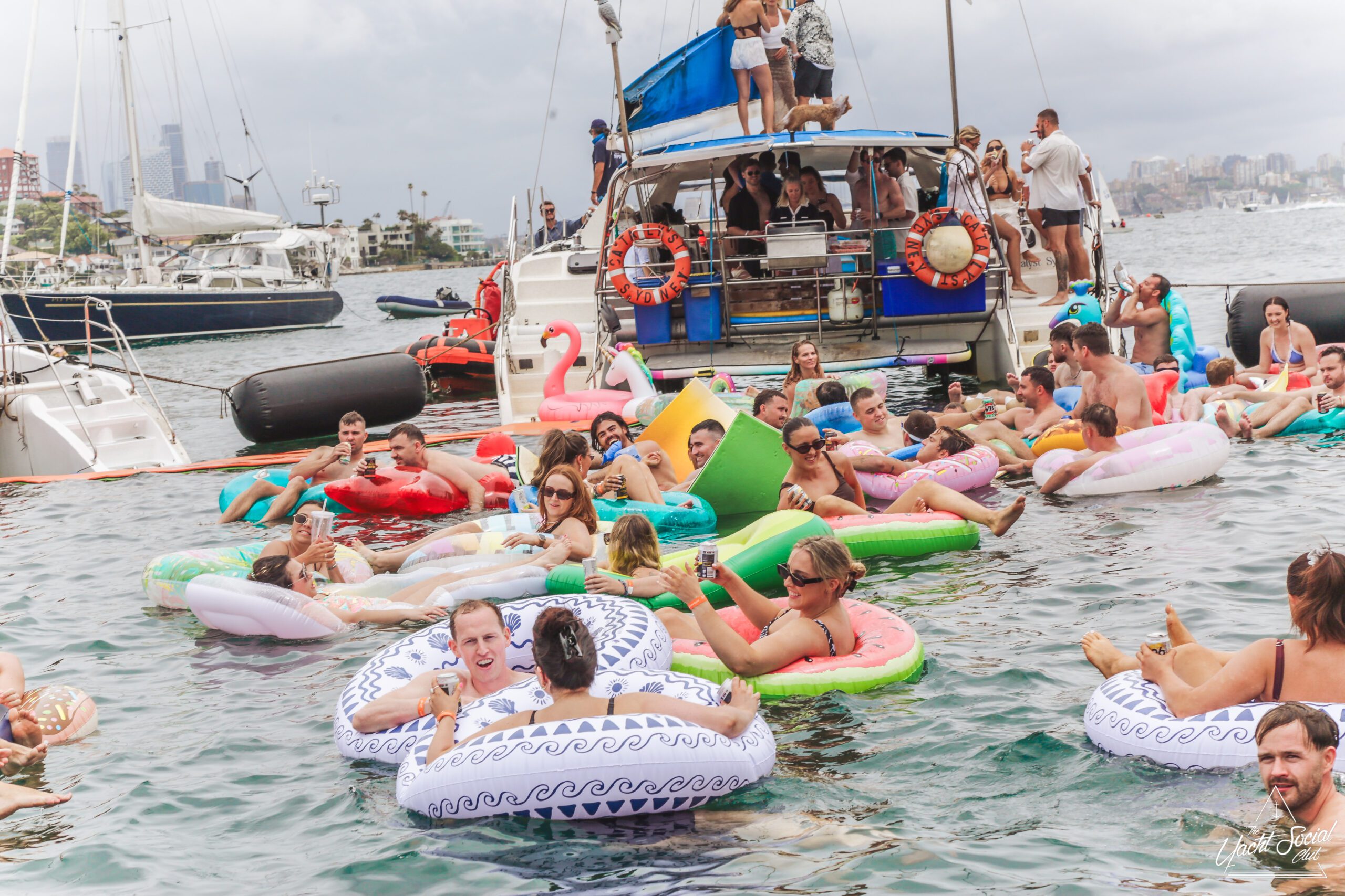 A group of people in swimsuits relax on colorful pool floats in the water between boats, enjoying a lively party on a sunny day. Several boats and more people are visible in the background.