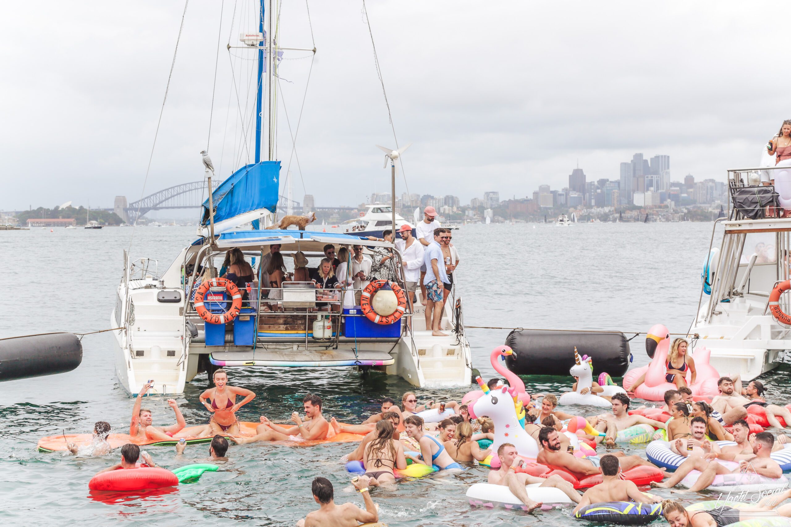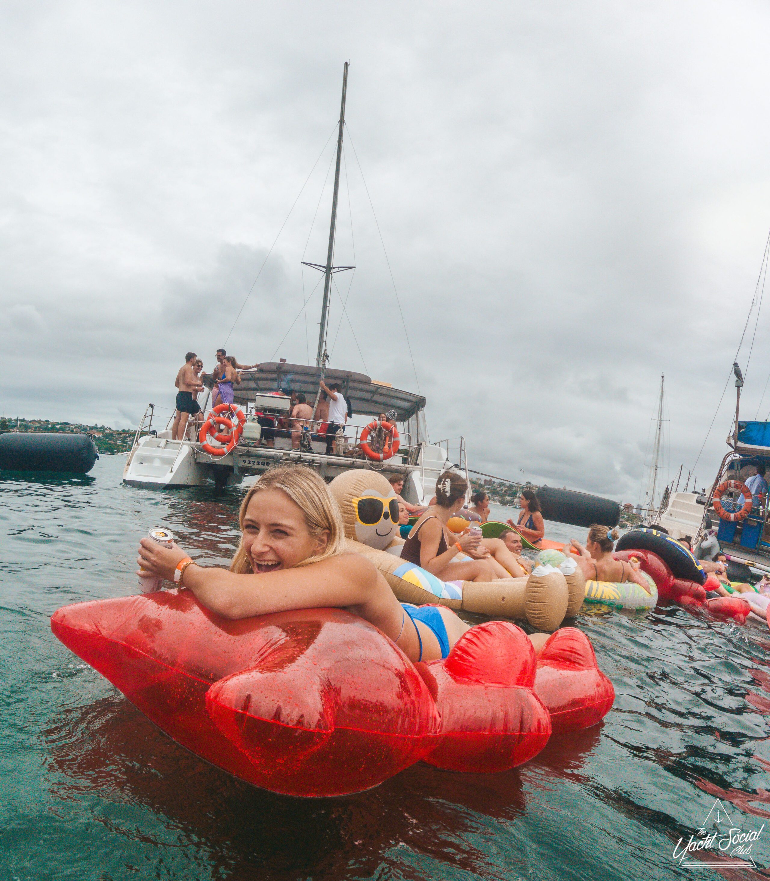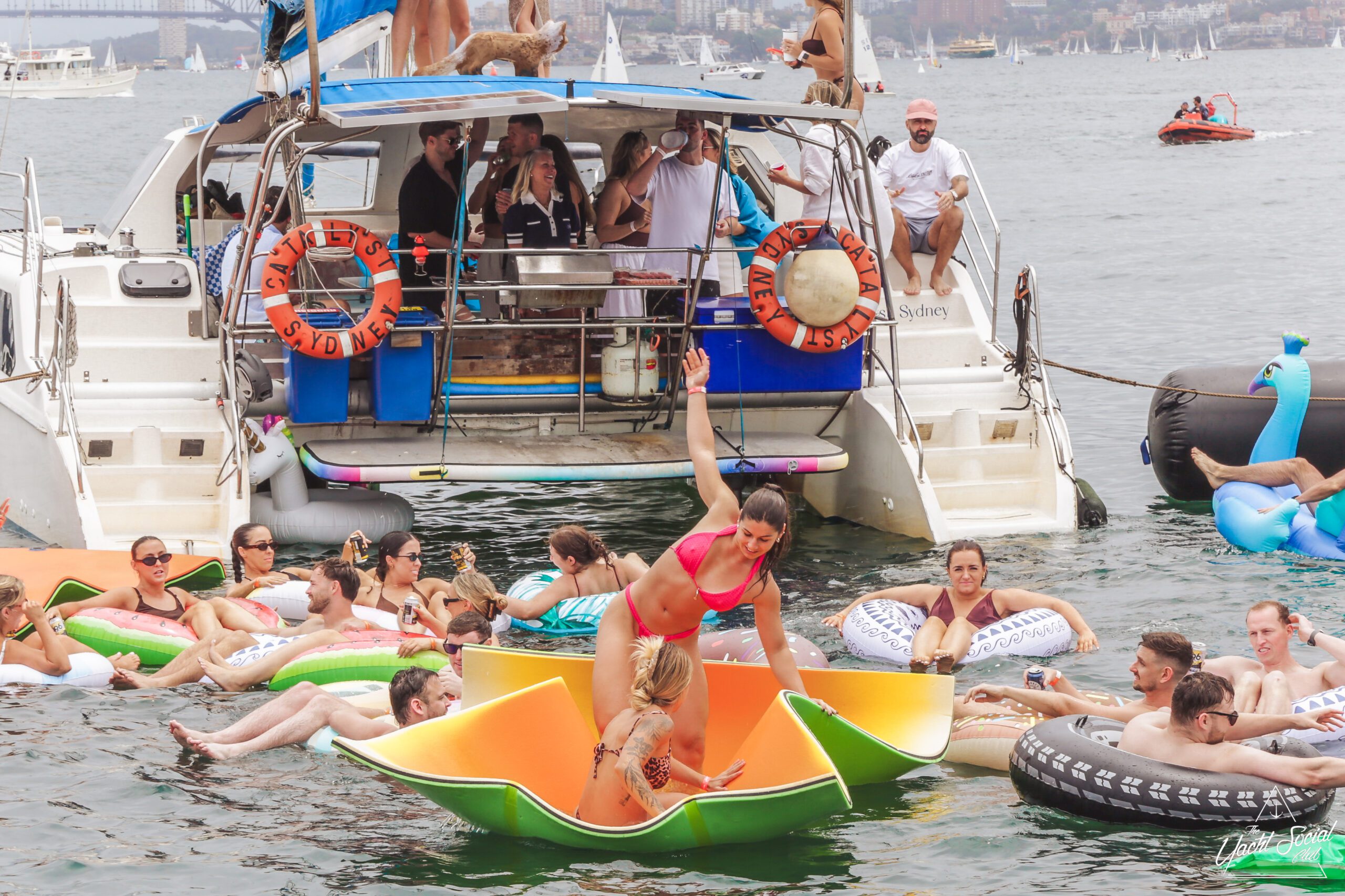 A group of people in swimsuits relax on colorful pool floats in the water between boats, enjoying a lively party on a sunny day. Several boats and more people are visible in the background.
