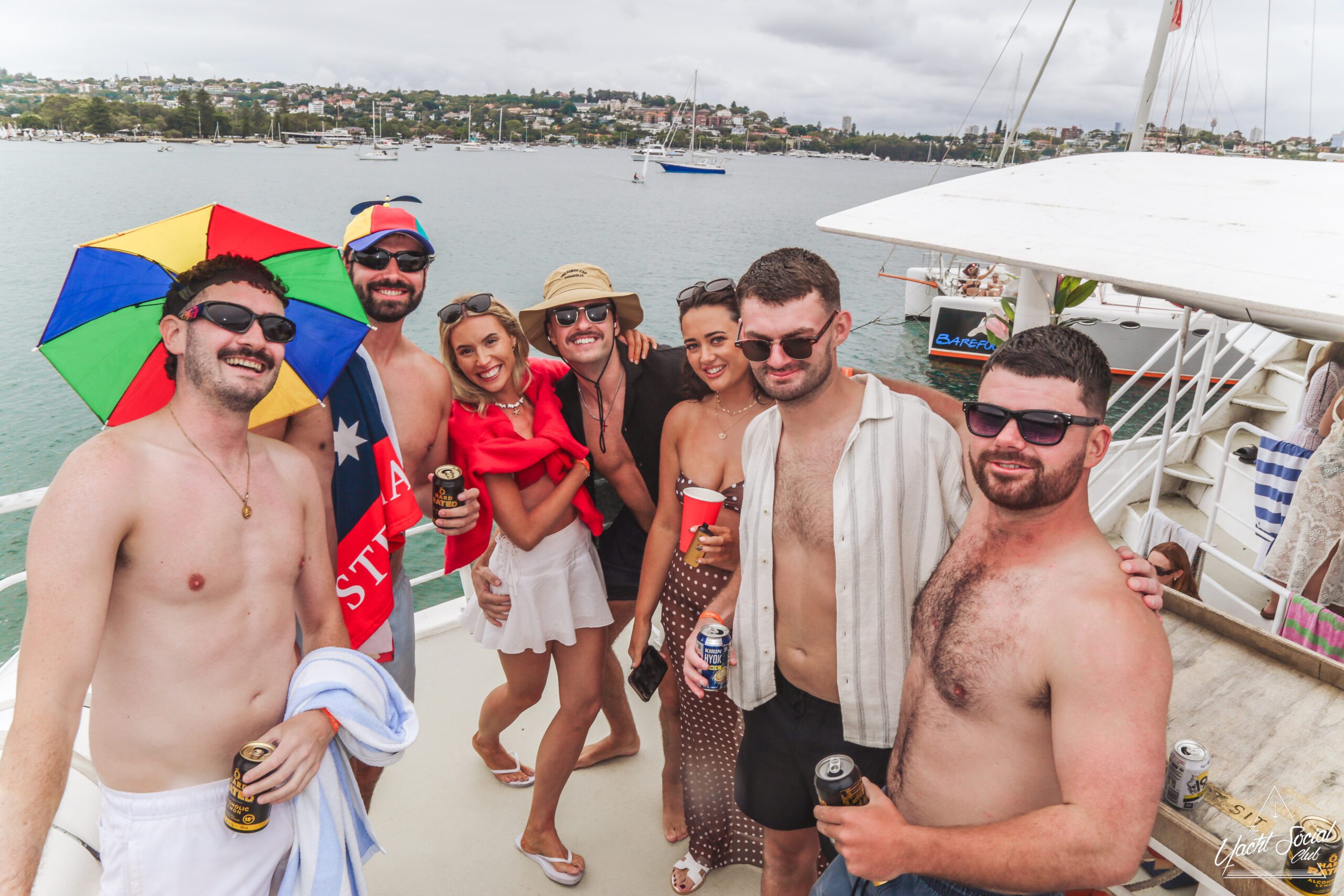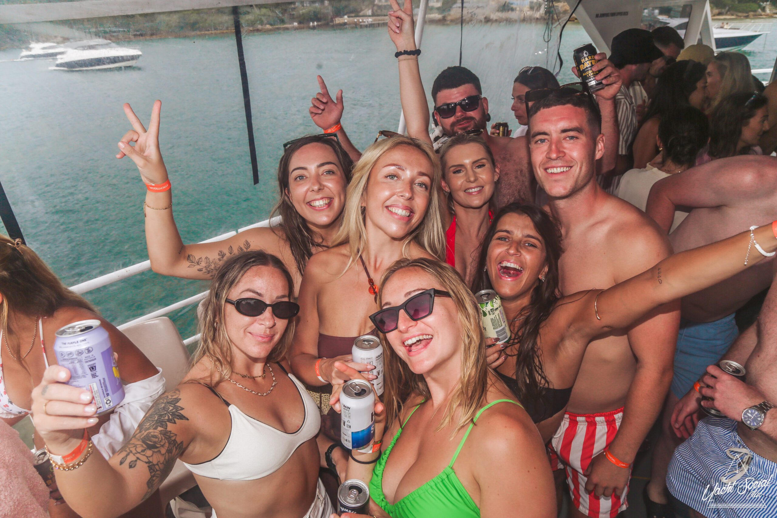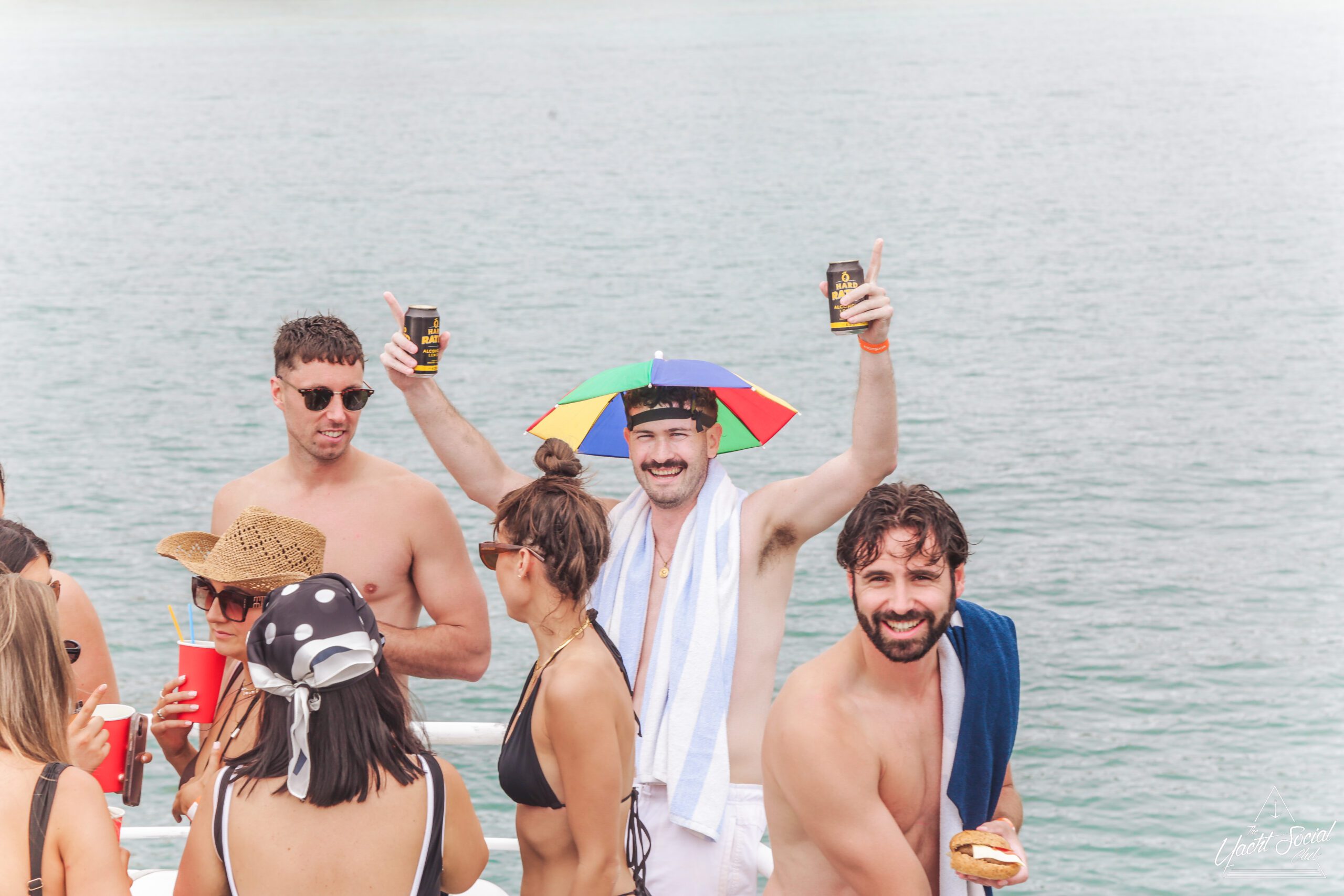 A group of young adults in swimsuits smile and pose for a photo on a boat party, holding drinks with the ocean and another boat visible in the background. The atmosphere is lively and joyful.