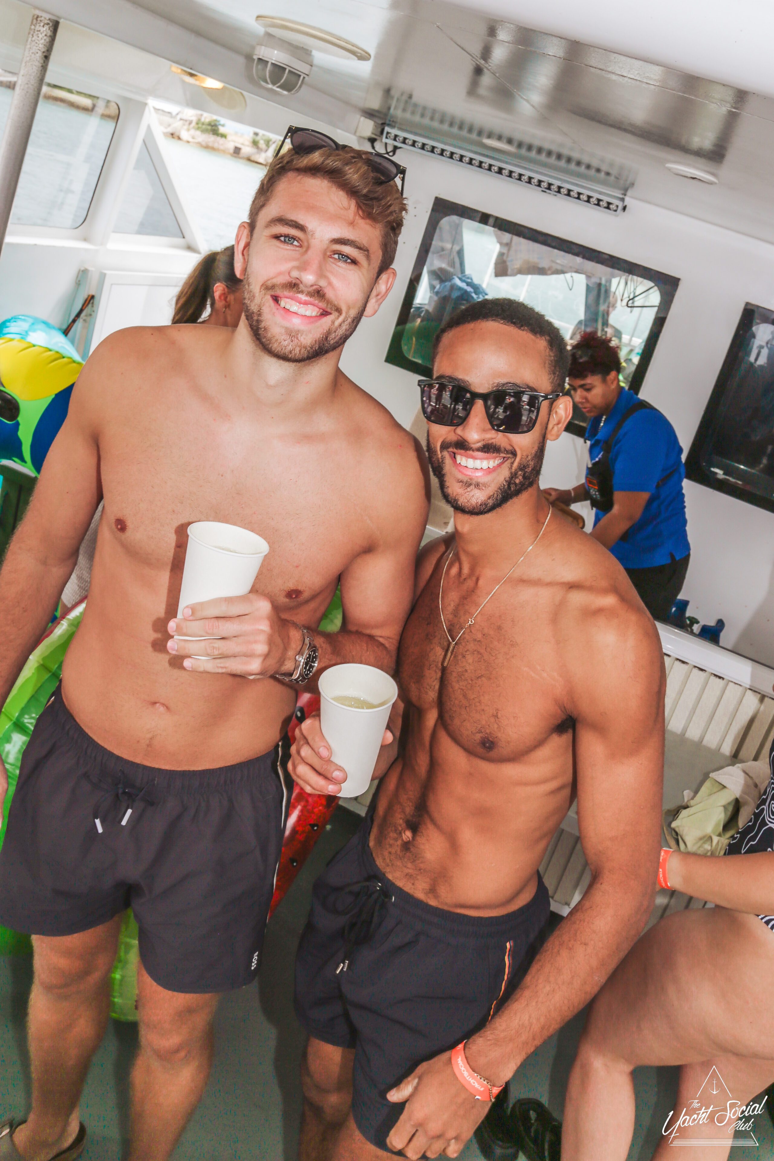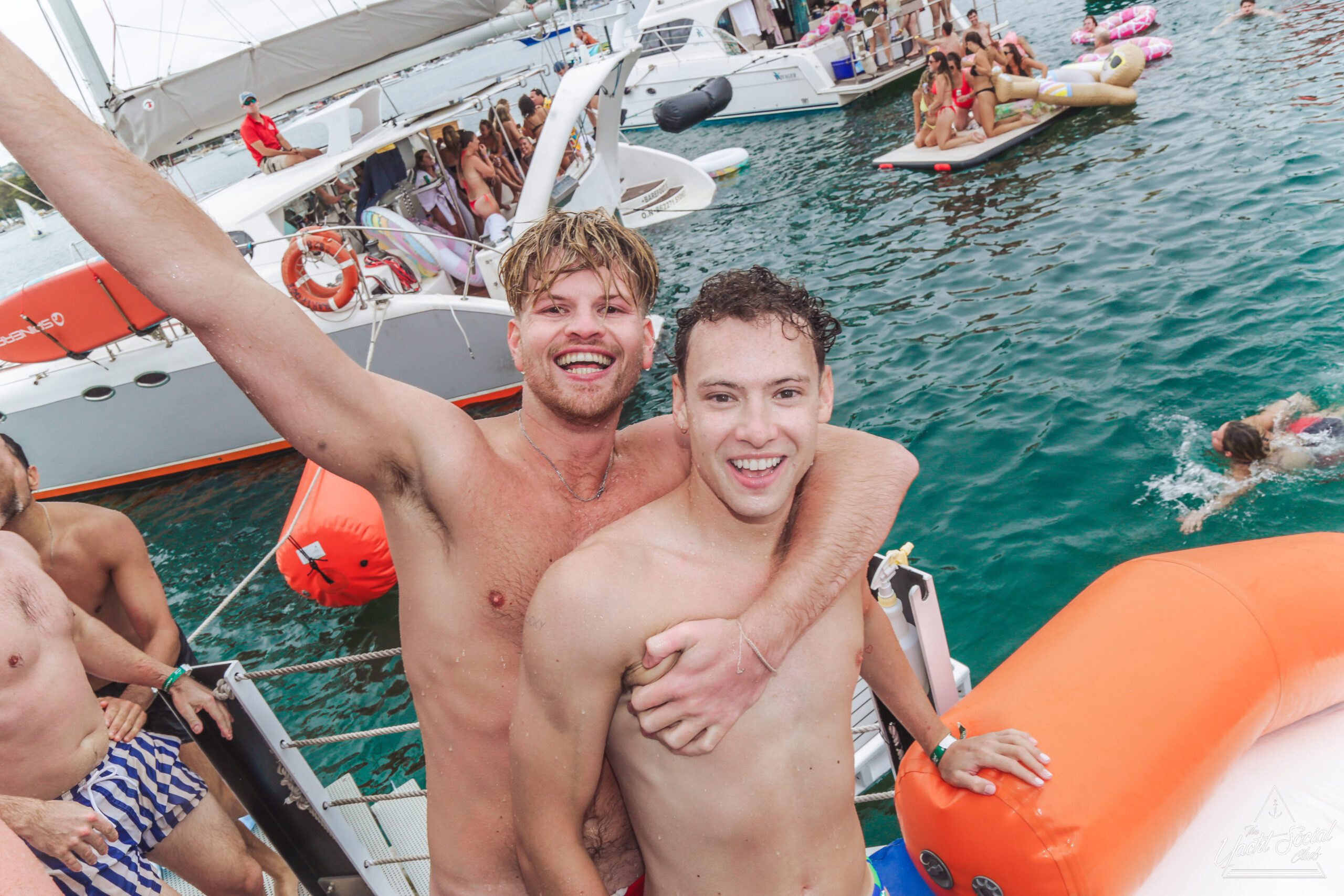 Two smiling shirtless men pose happily on the edge of a boat during a lively party. Other people are swimming, lounging on inflatables, and relaxing on nearby boats in the background. The atmosphere is festive and fun.