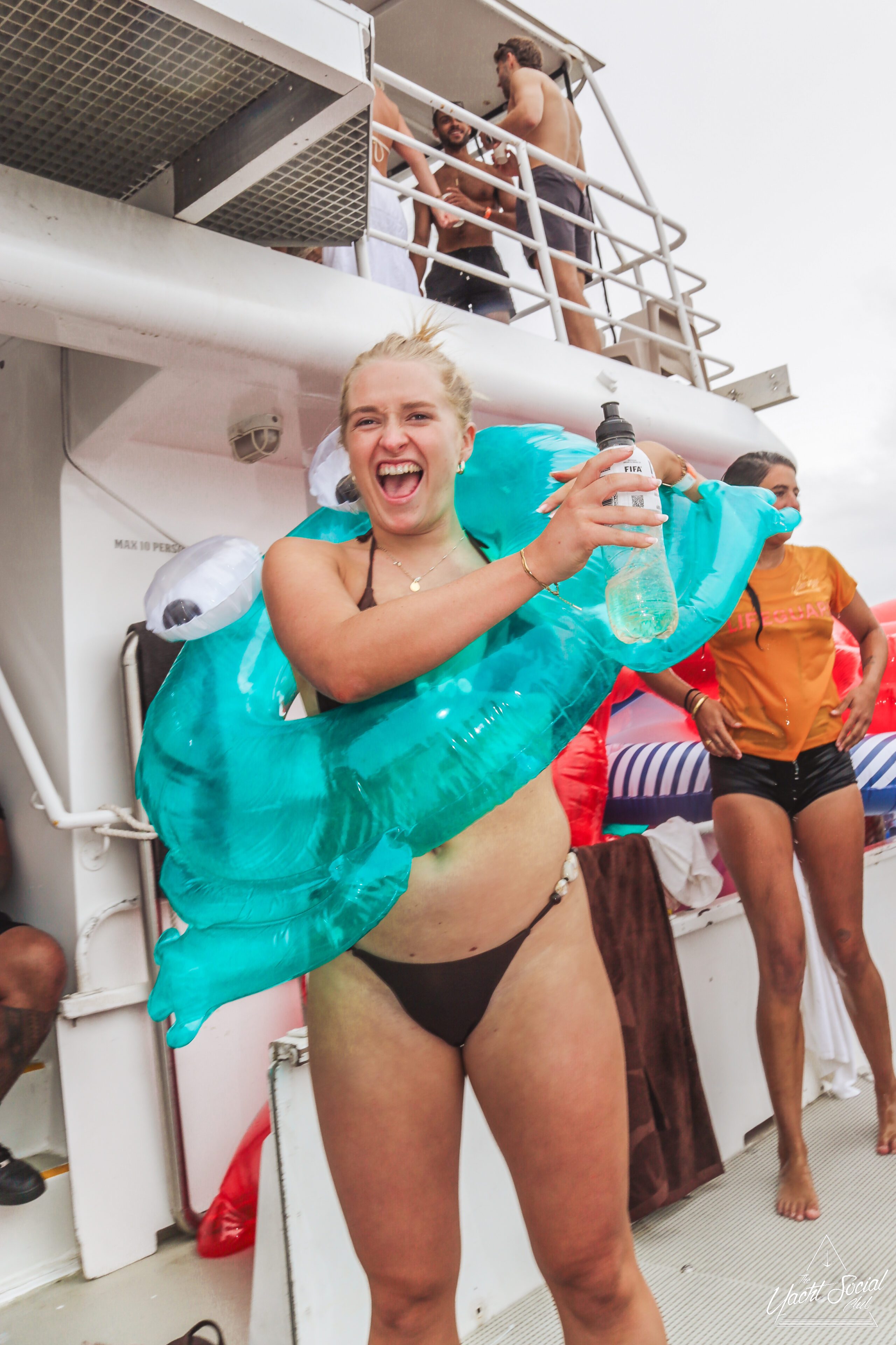 A smiling woman in a white bikini with colorful patterns holds two cans, standing beside a unicorn pool float at a lively boat party with other people in swimsuits.